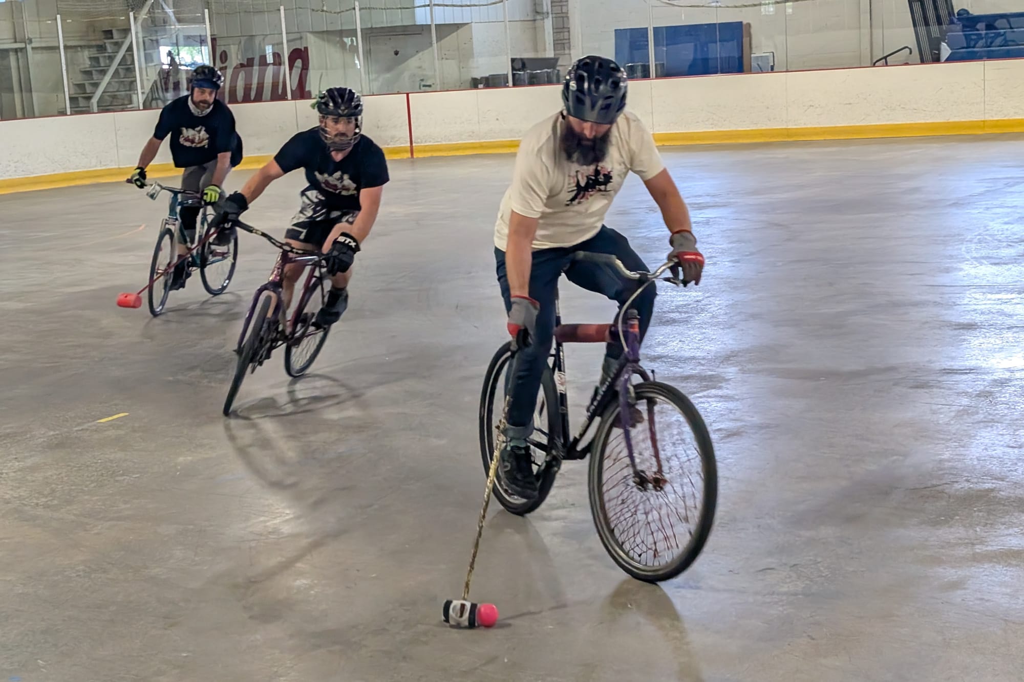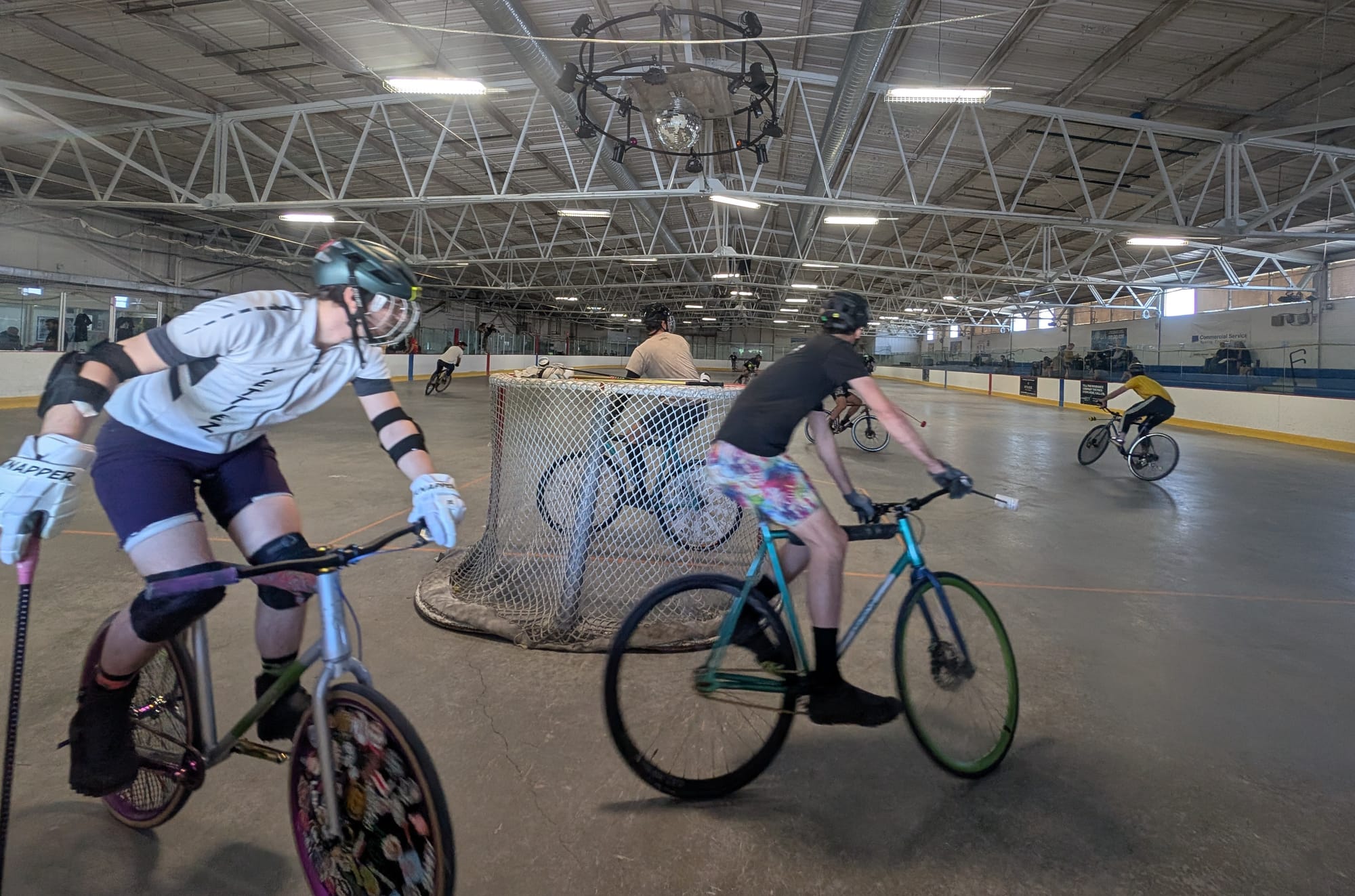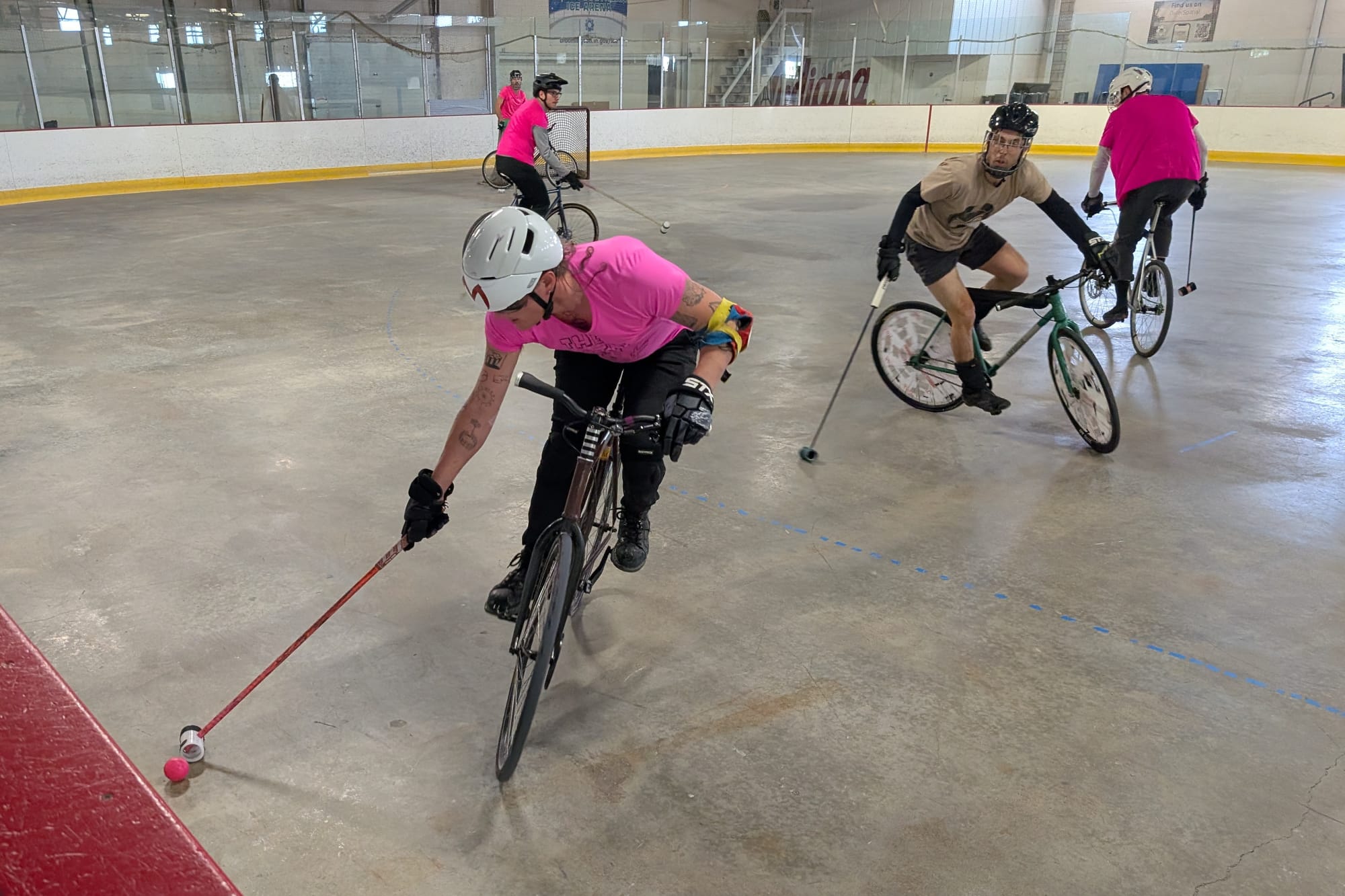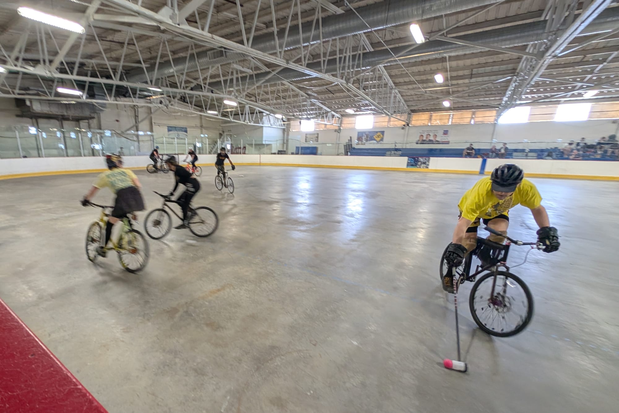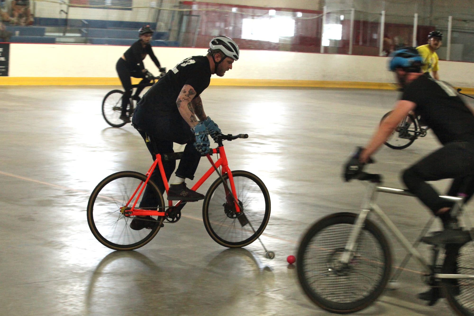 In its standard form, bike polo is a three‑on‑three game. On a rink the size of Frank Southern, however, the club has shifted the format to four‑on‑four, which inspired the “Tenderloin” name—a nod to an oversized sandwich to match the oversized court.