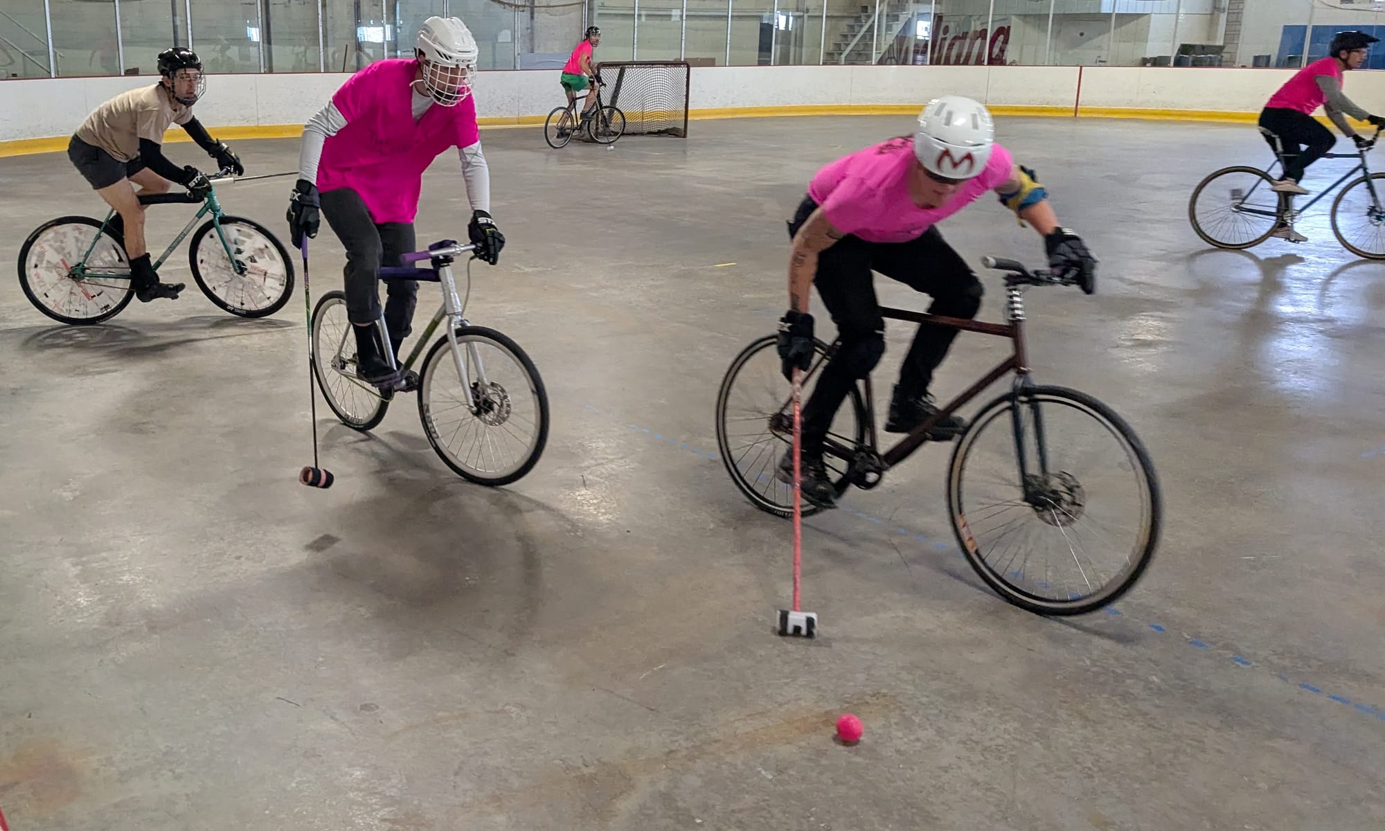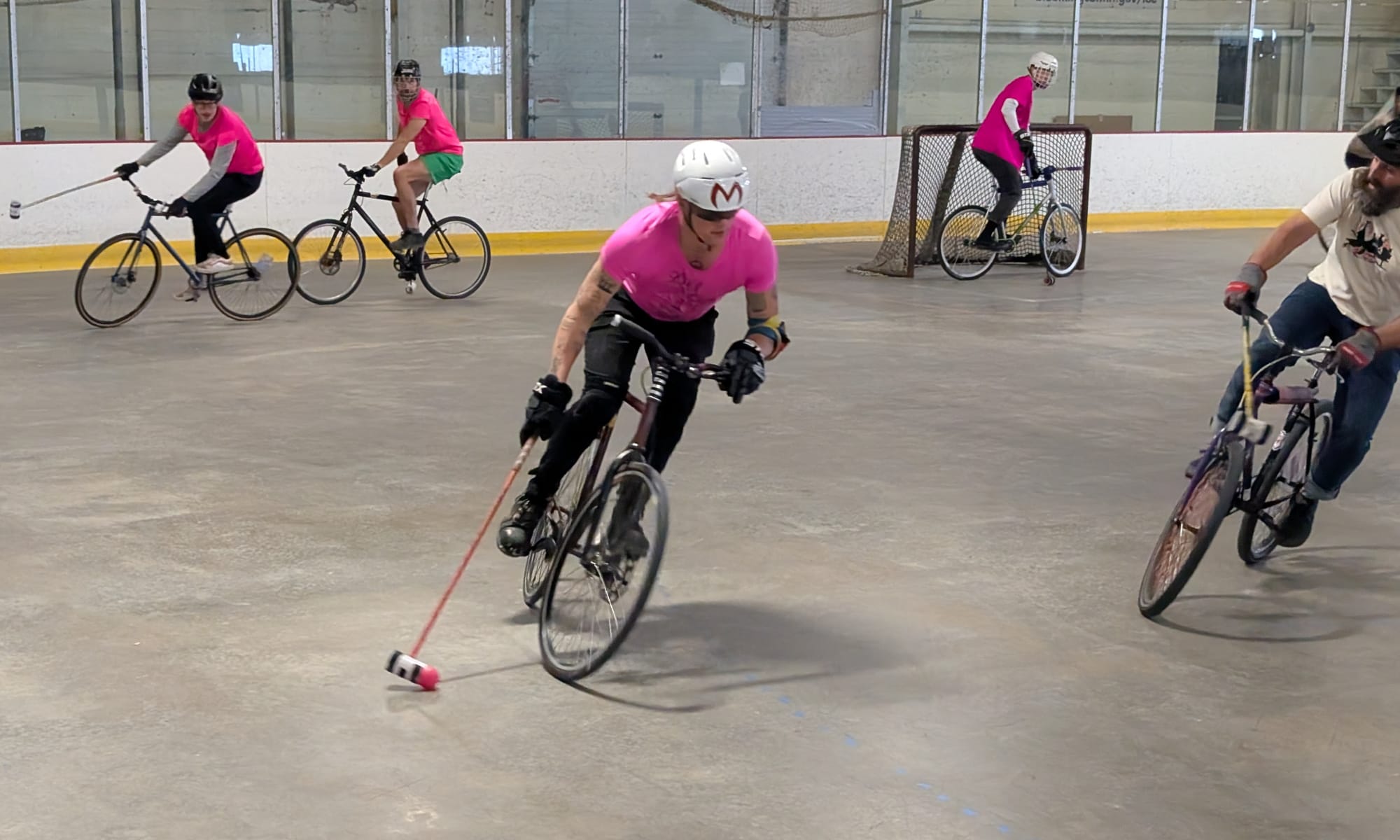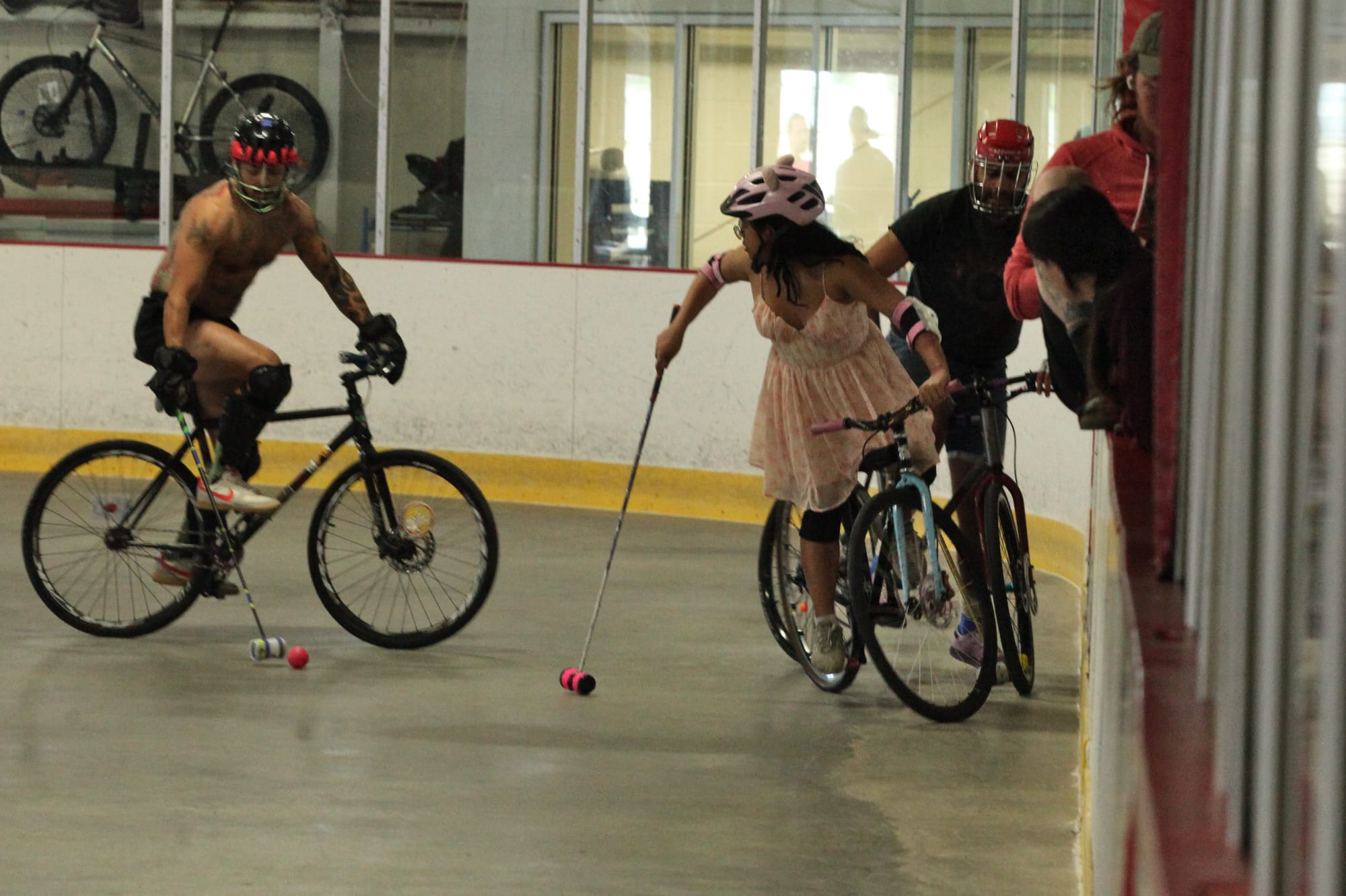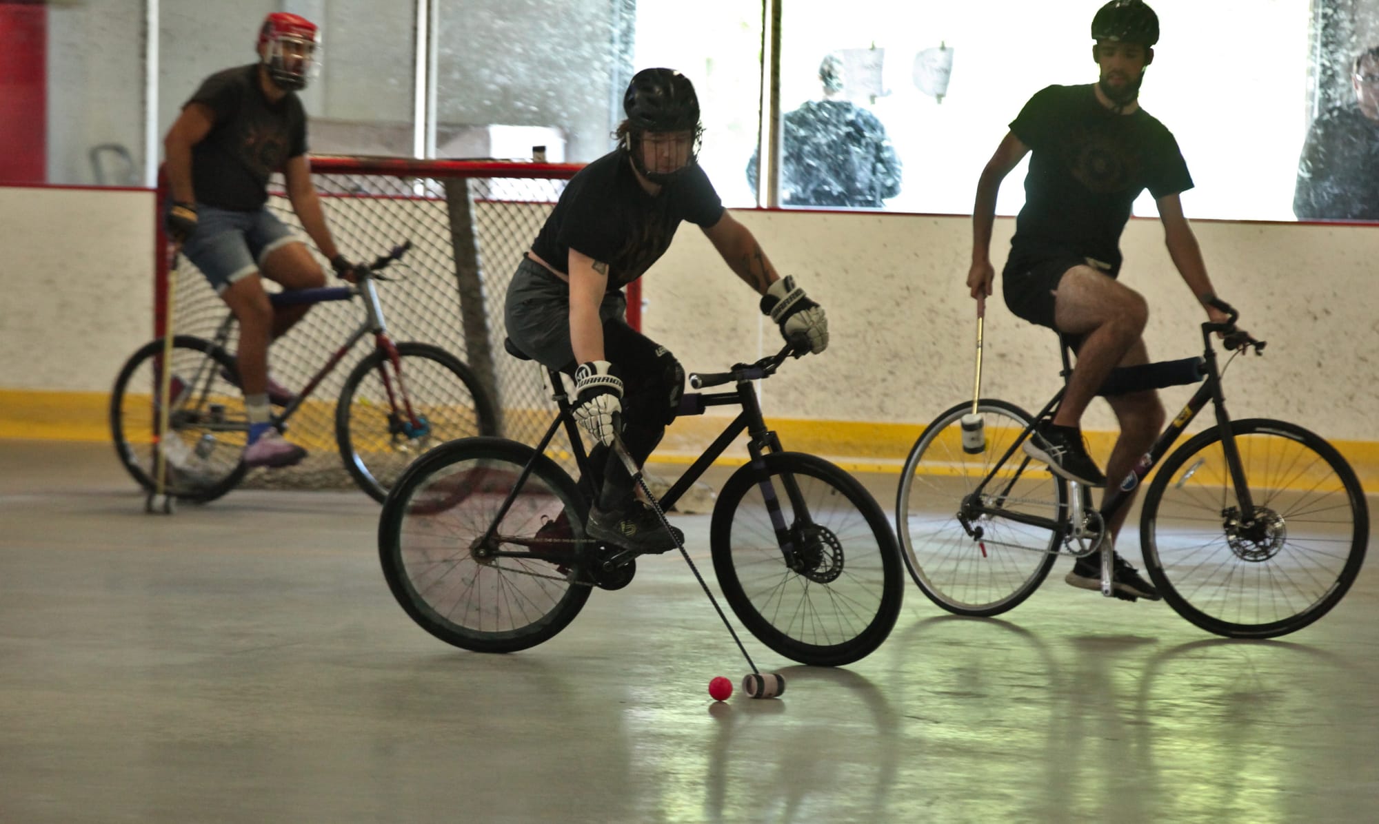 In its standard form, bike polo is a three‑on‑three game. On a rink the size of Frank Southern, however, the club has shifted the format to four‑on‑four, which inspired the “Tenderloin” name—a nod to an oversized sandwich to match the oversized court.