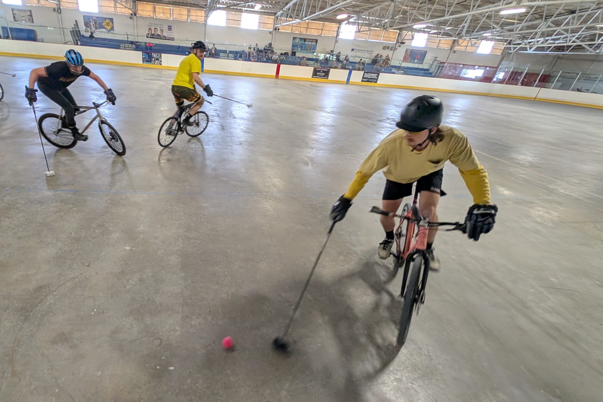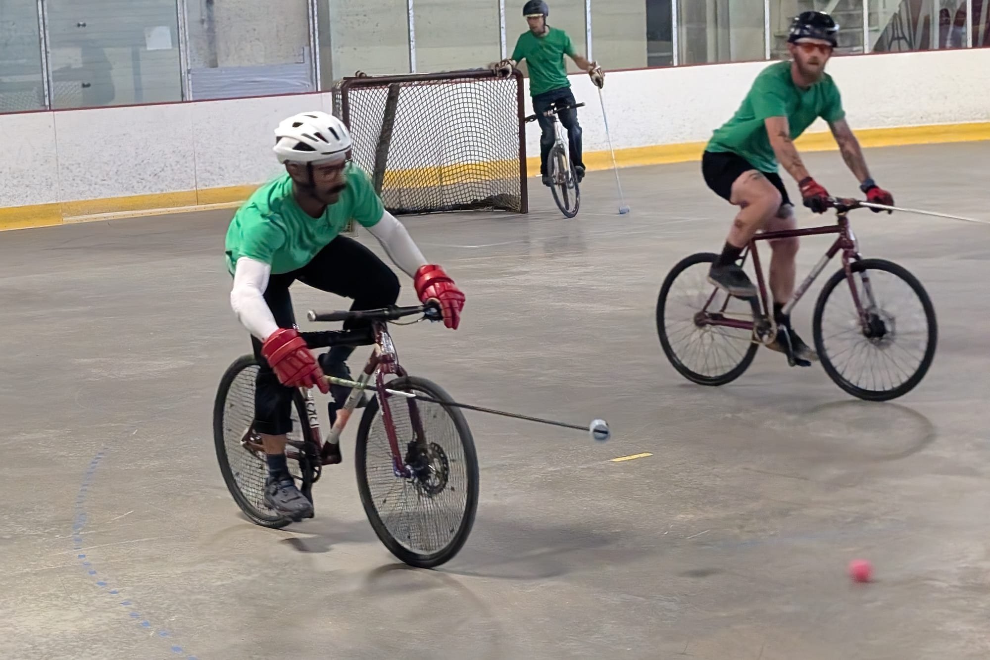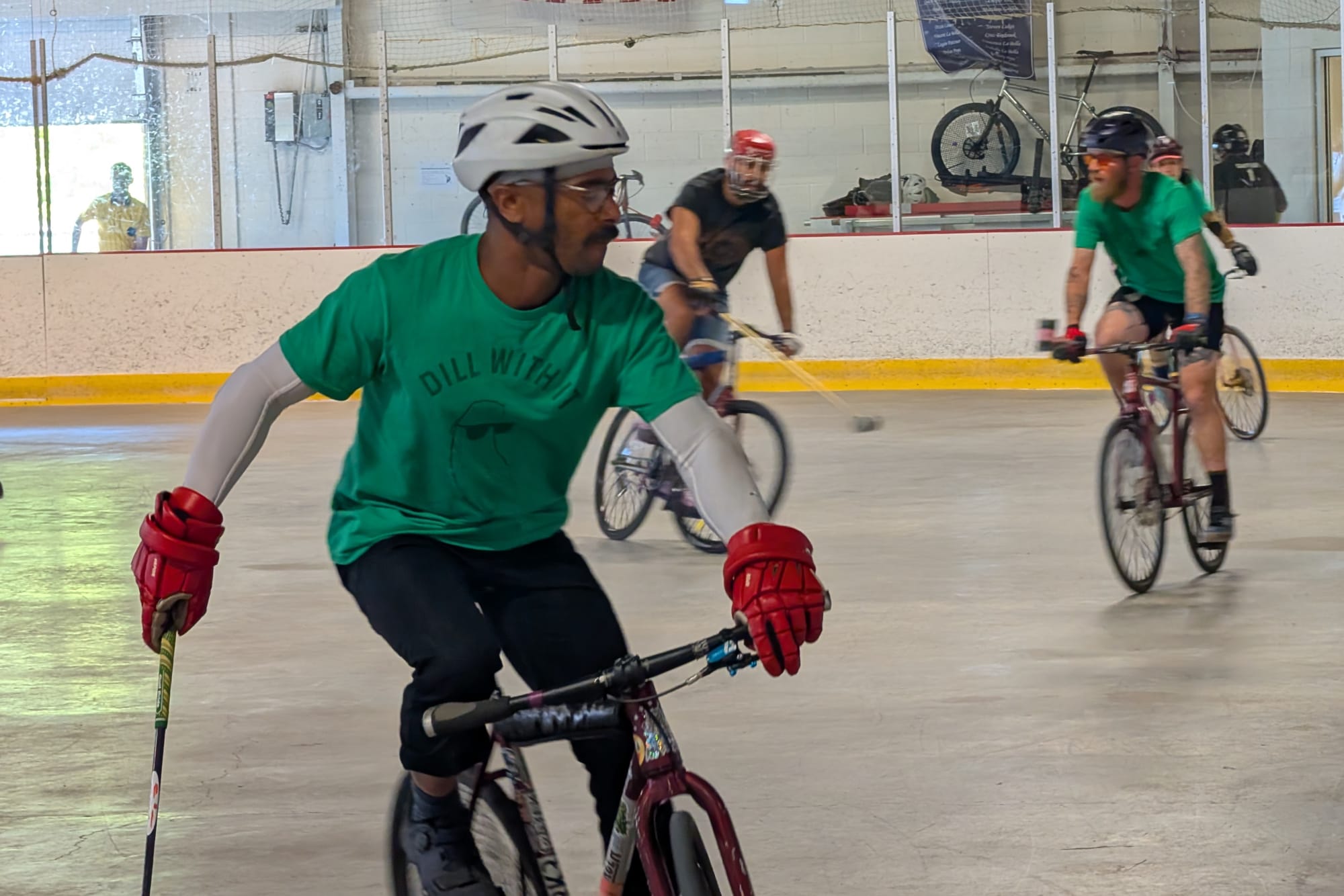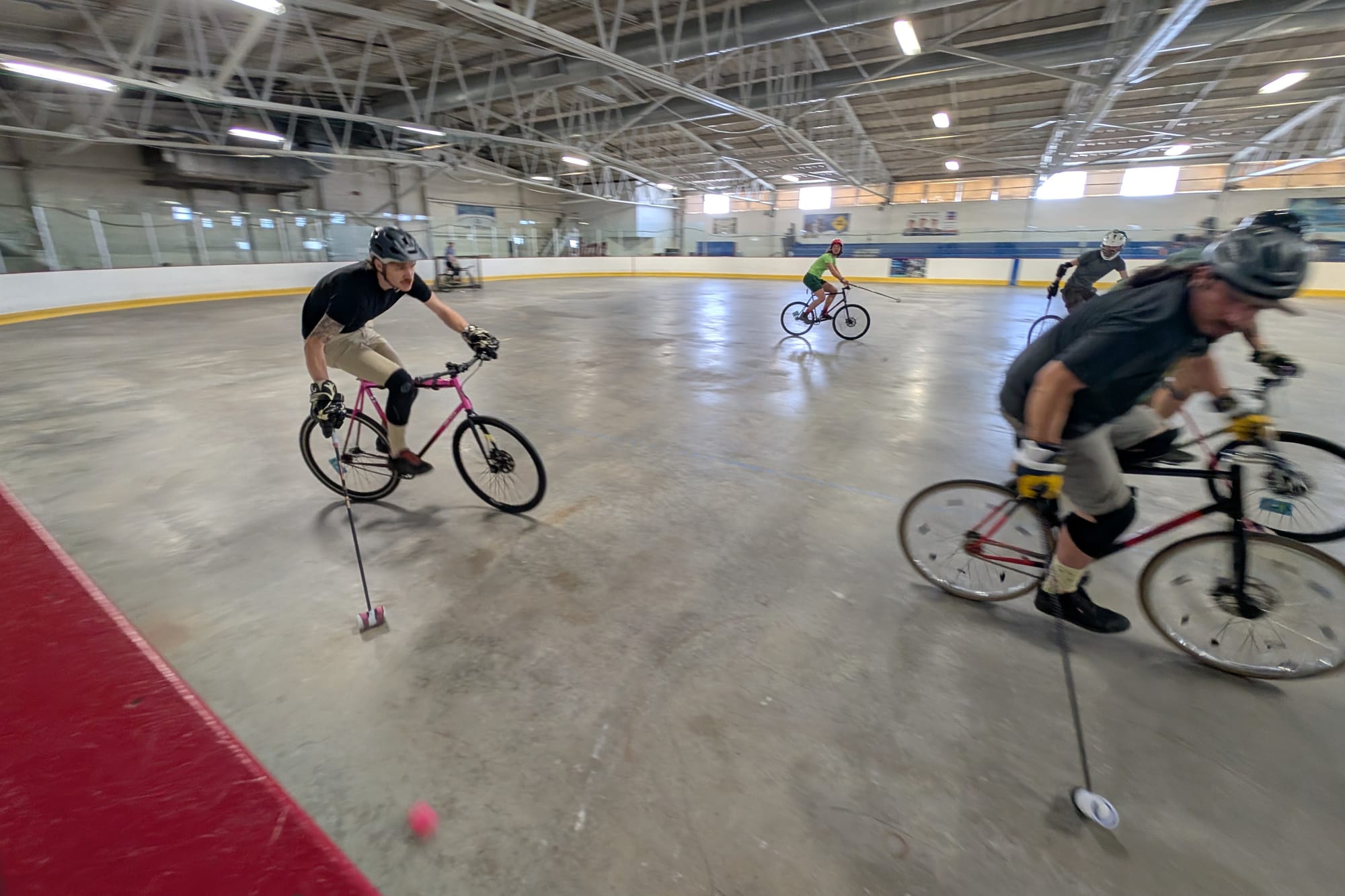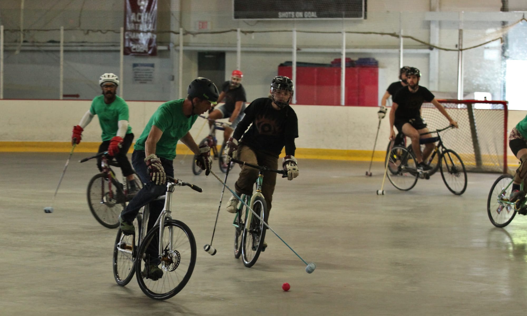 In its standard form, bike polo is a three‑on‑three game. On a rink the size of Frank Southern, however, the club has shifted the format to four‑on‑four, which inspired the “Tenderloin” name—a nod to an oversized sandwich to match the oversized court.