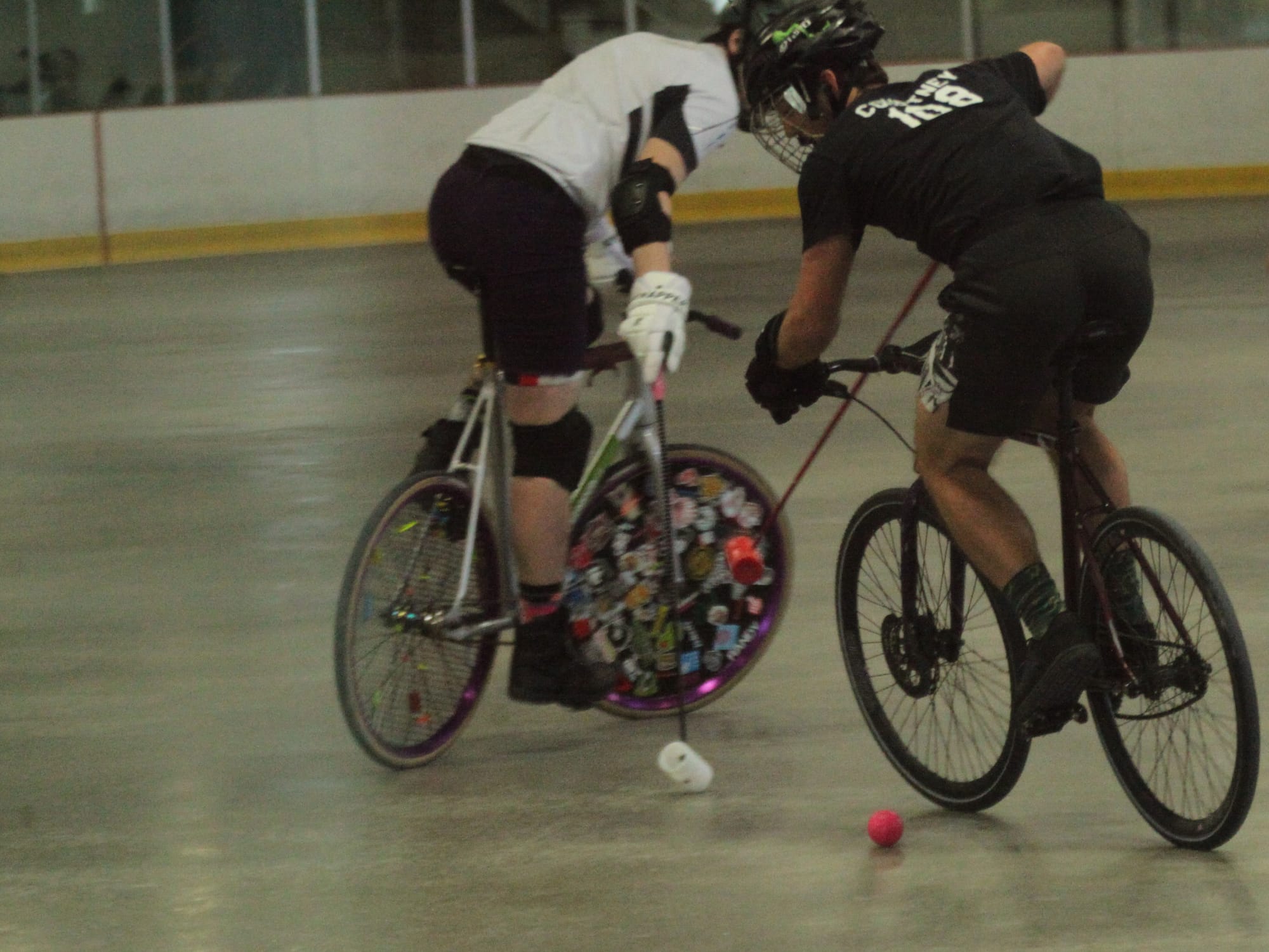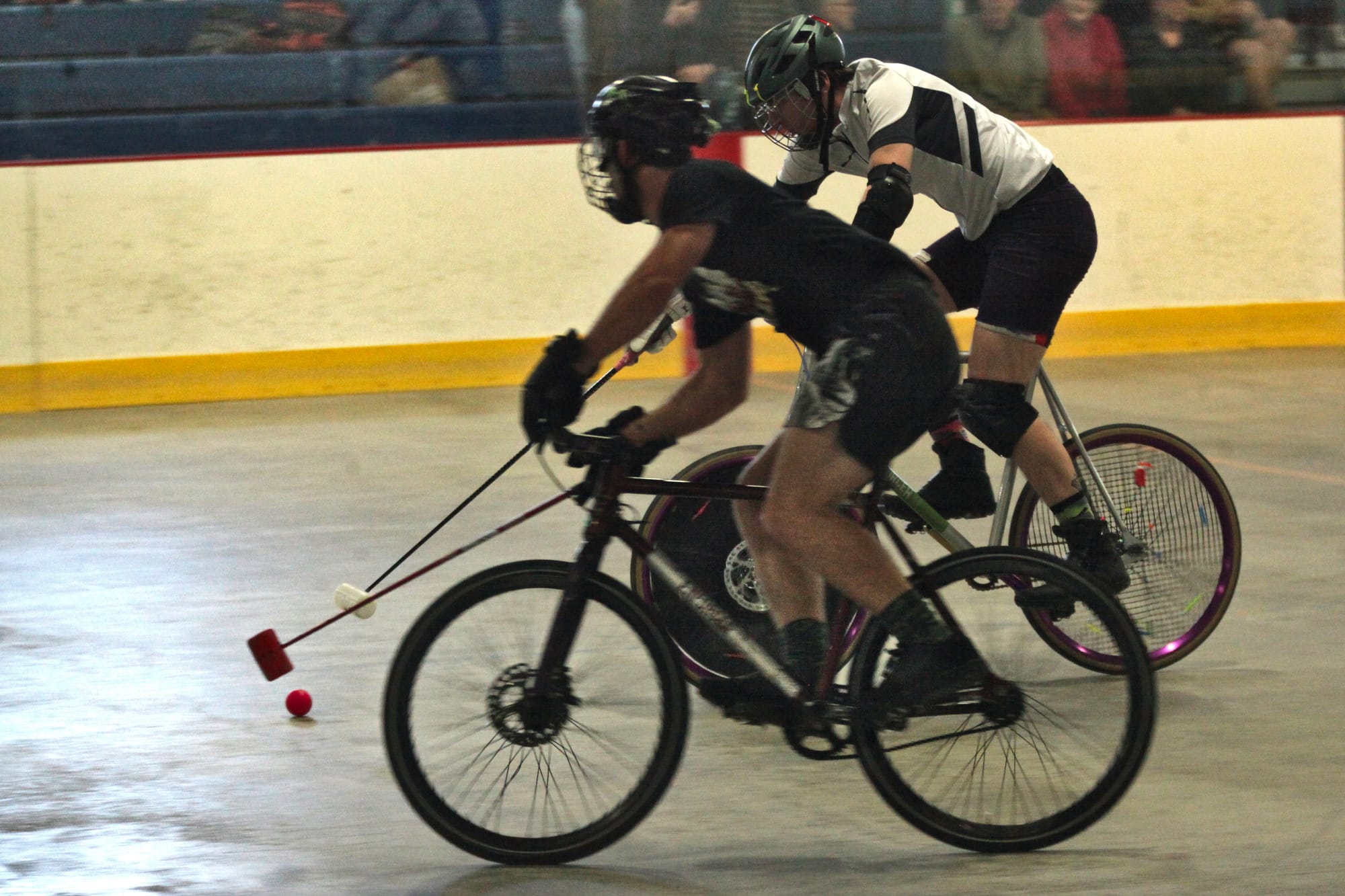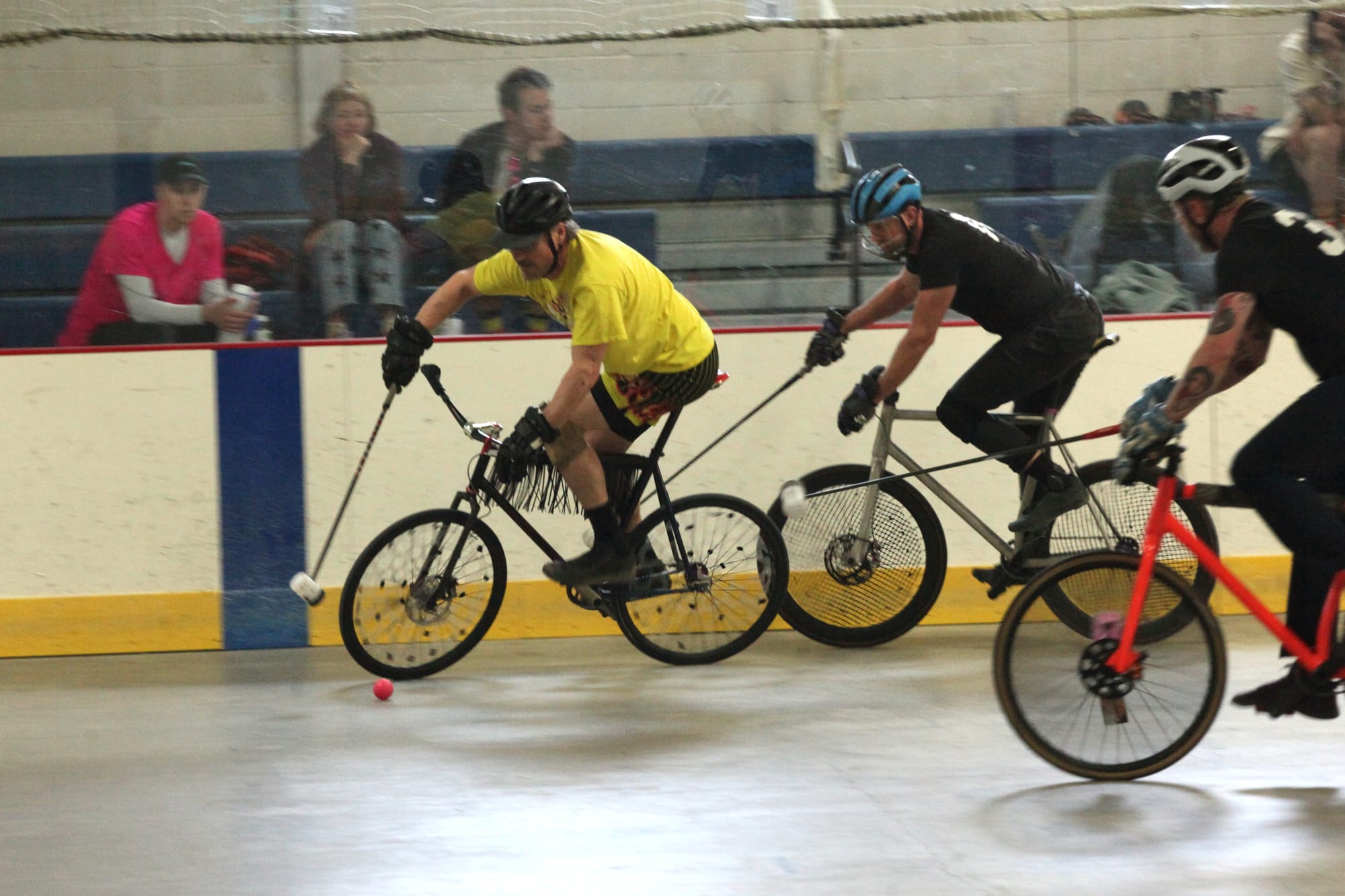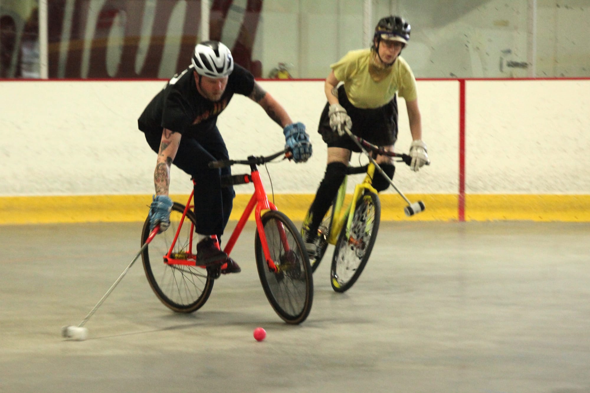 This past weekend (April 18–19) at Bloomington’s Frank Southern Ice Arena, the ice was gone but the boards were still busy, given over to bicycle polo. Think polo, but with bicycles instead of horses. Or hockey on bikes.