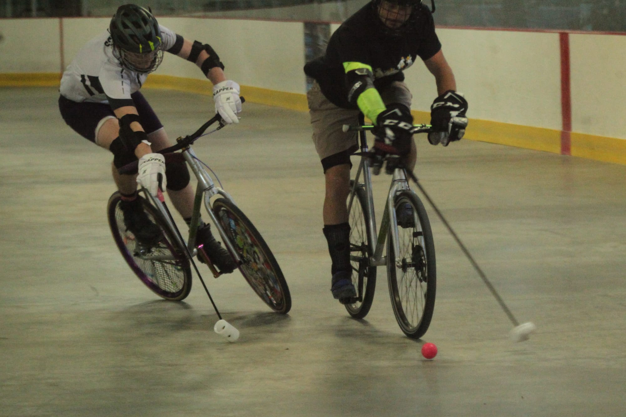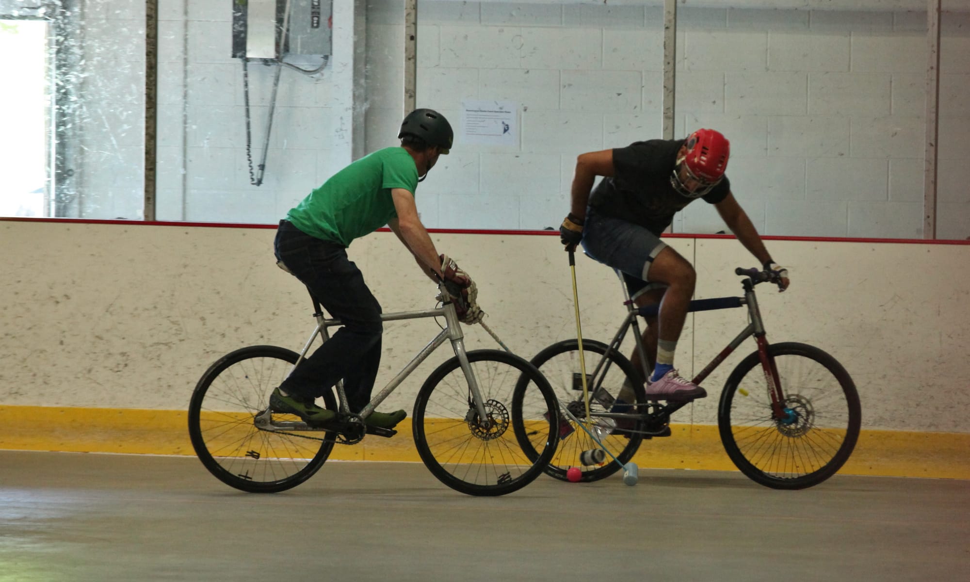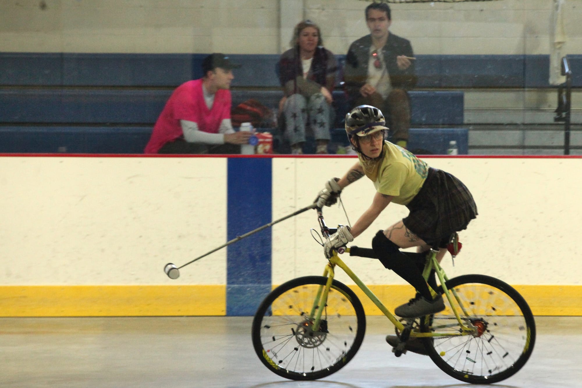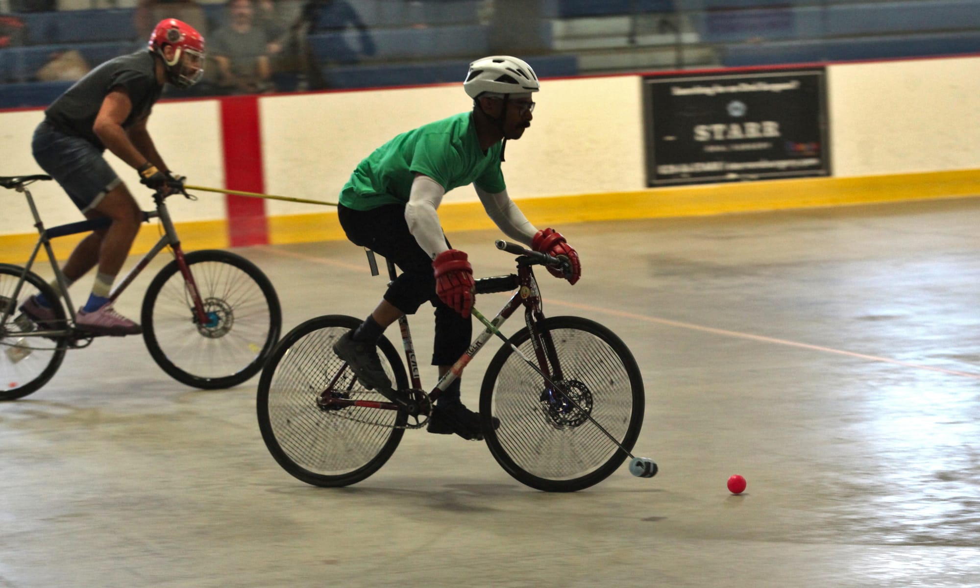 This past weekend (April 18–19) at Bloomington’s Frank Southern Ice Arena, the ice was gone but the boards were still busy, given over to bicycle polo. Think polo, but with bicycles instead of horses. Or hockey on bikes.