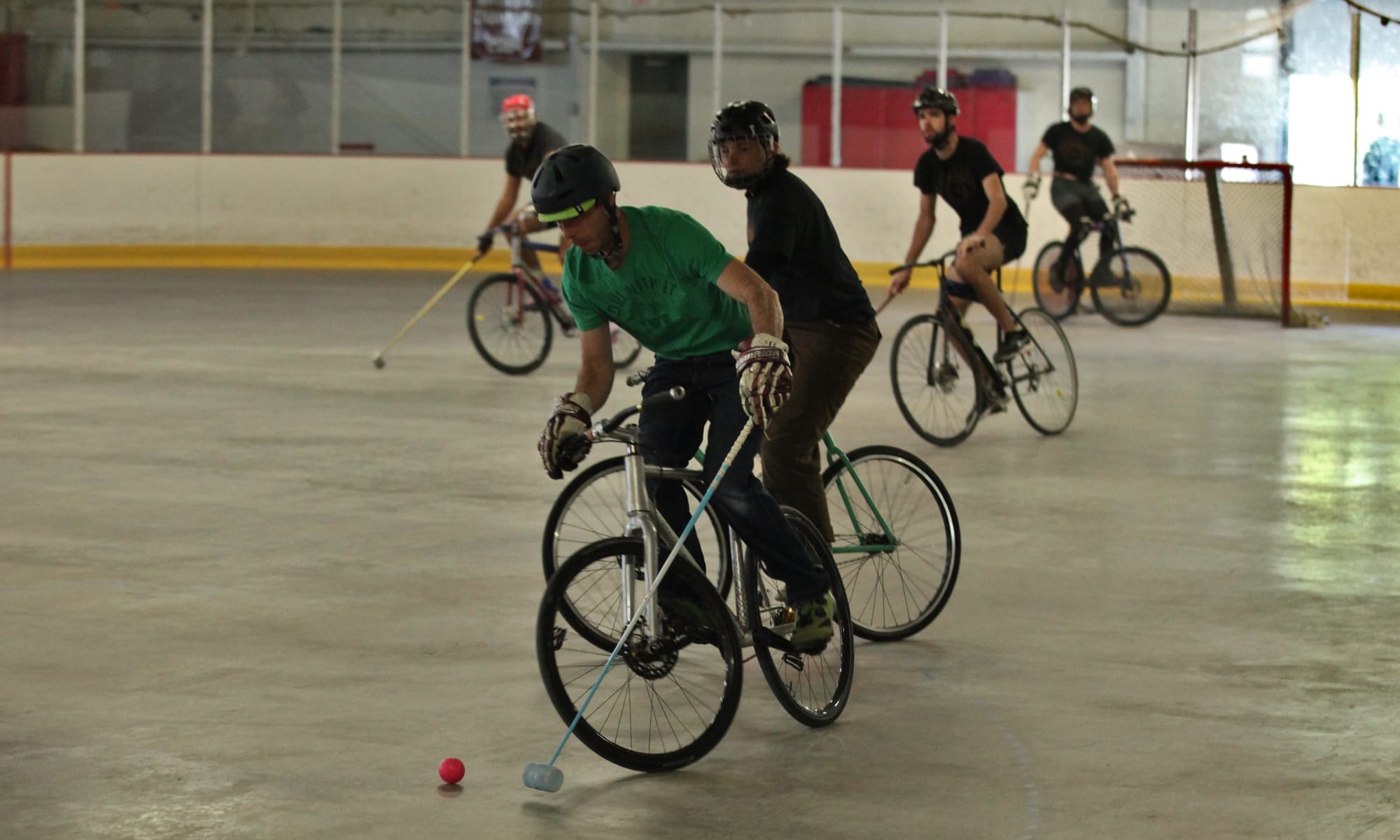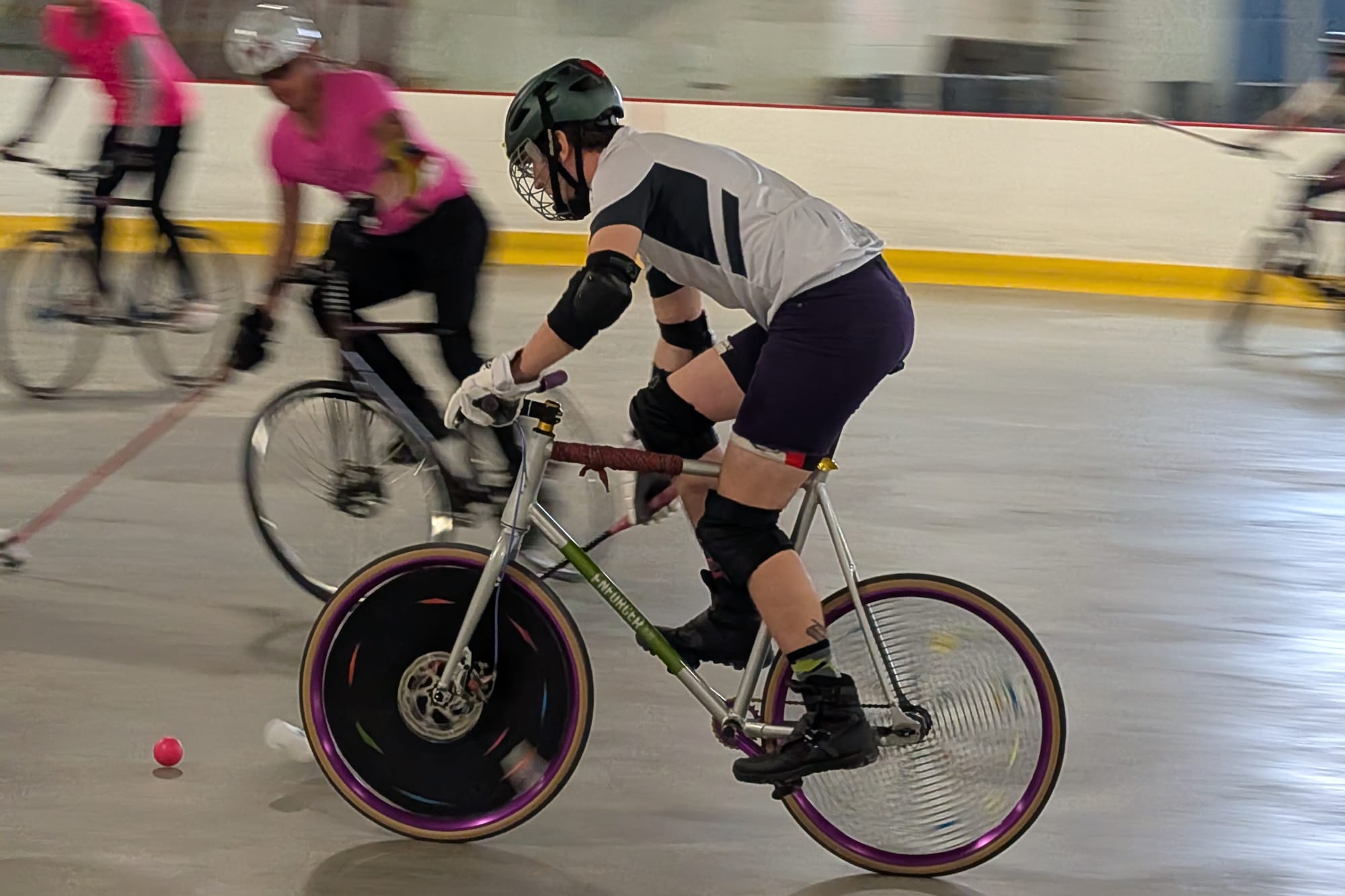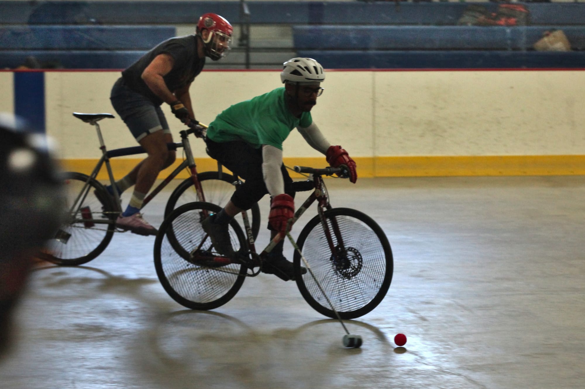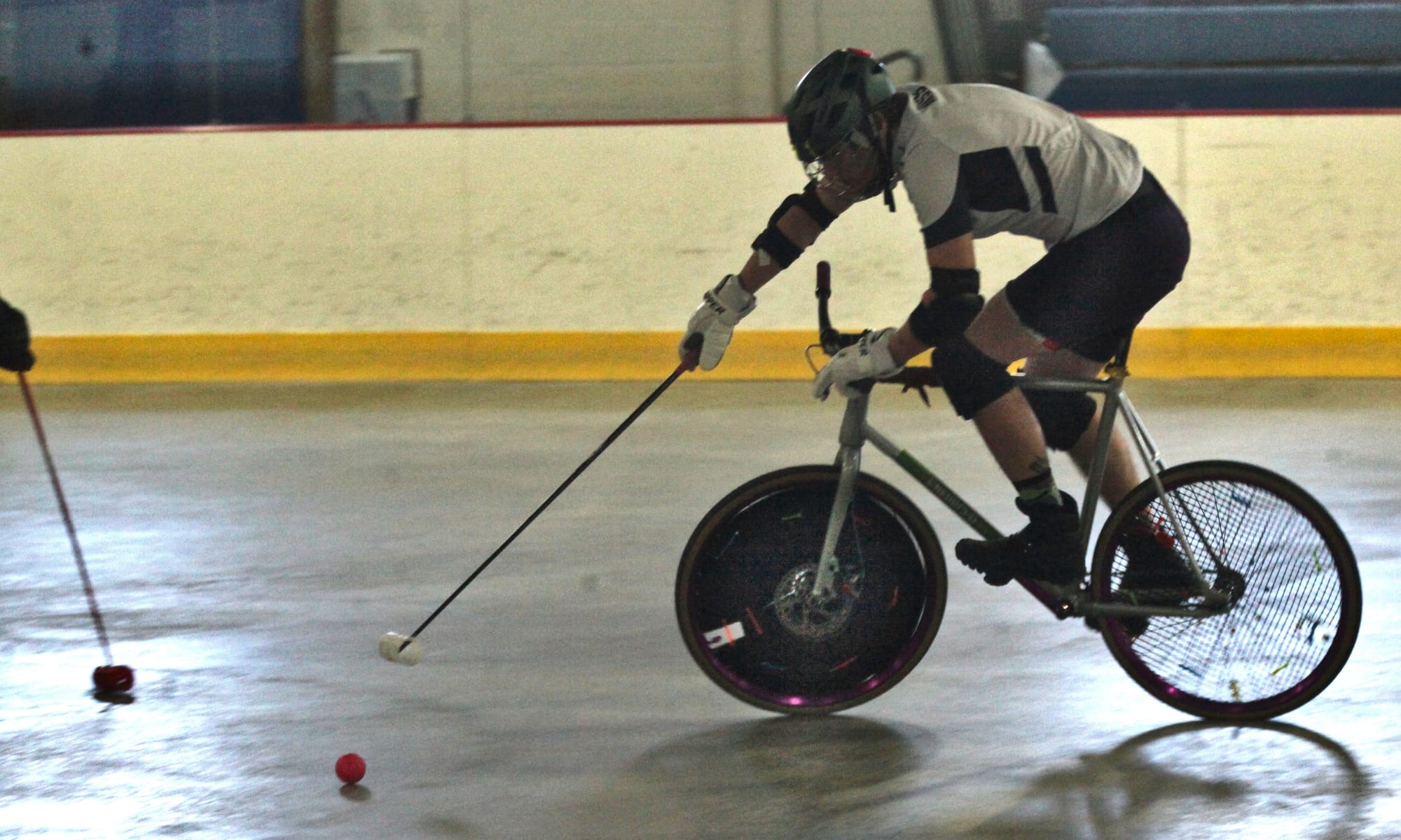 This past weekend (April 18–19) at Bloomington’s Frank Southern Ice Arena, the ice was gone but the boards were still busy, given over to bicycle polo. Think polo, but with bicycles instead of horses. Or hockey on bikes.