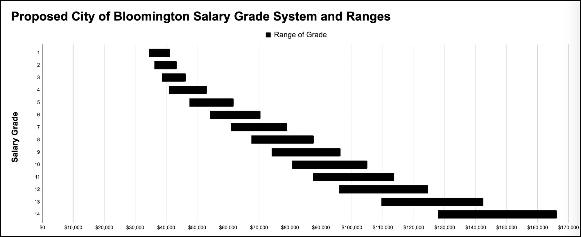 According to the staff memo from Bloomington’s human resource director Sharr Pechac, the purpose of the new salary grade system is to “relieve pay compression between mid-level employees and their supervisors, as well as to better differentiate between grades.”