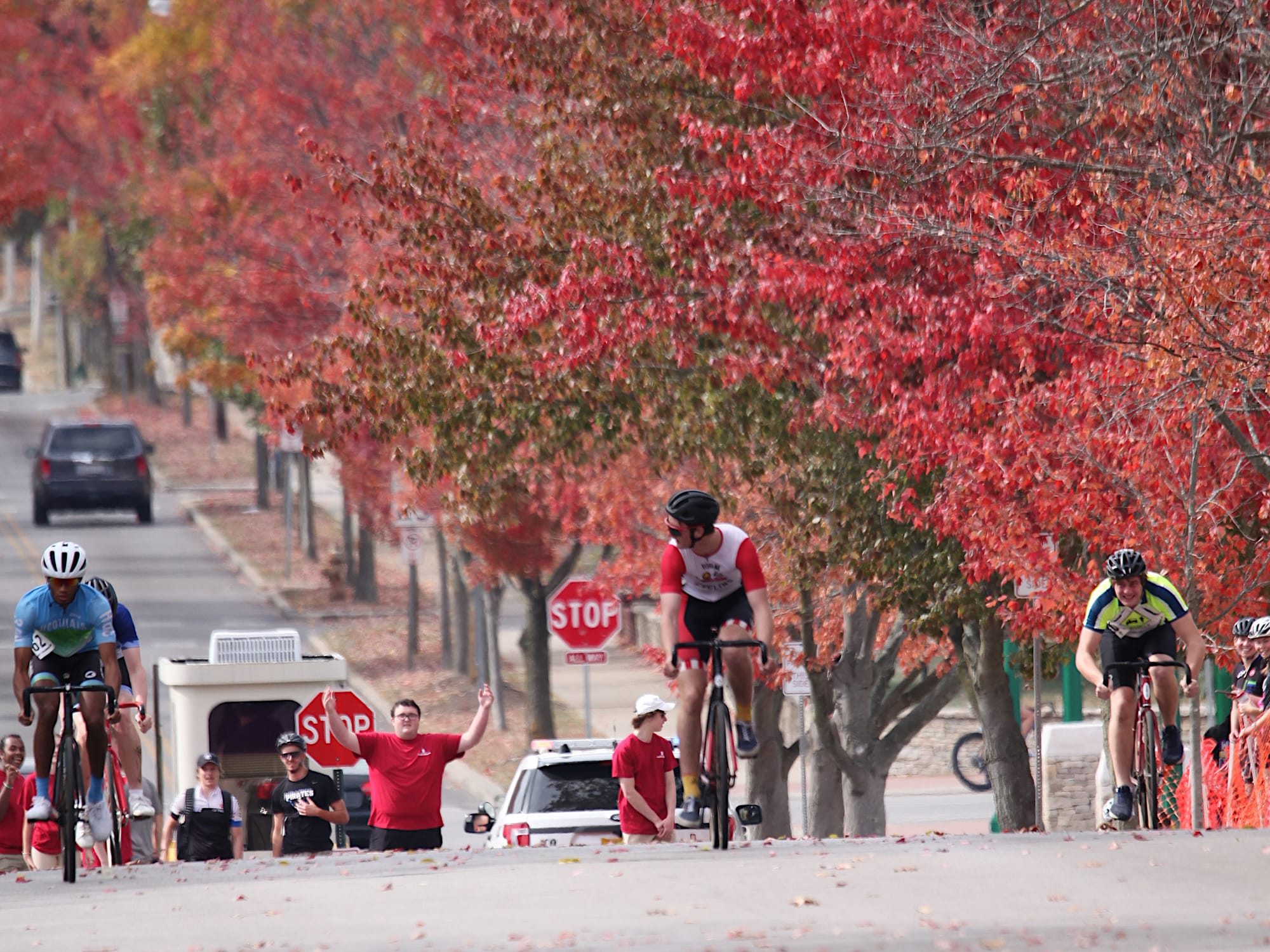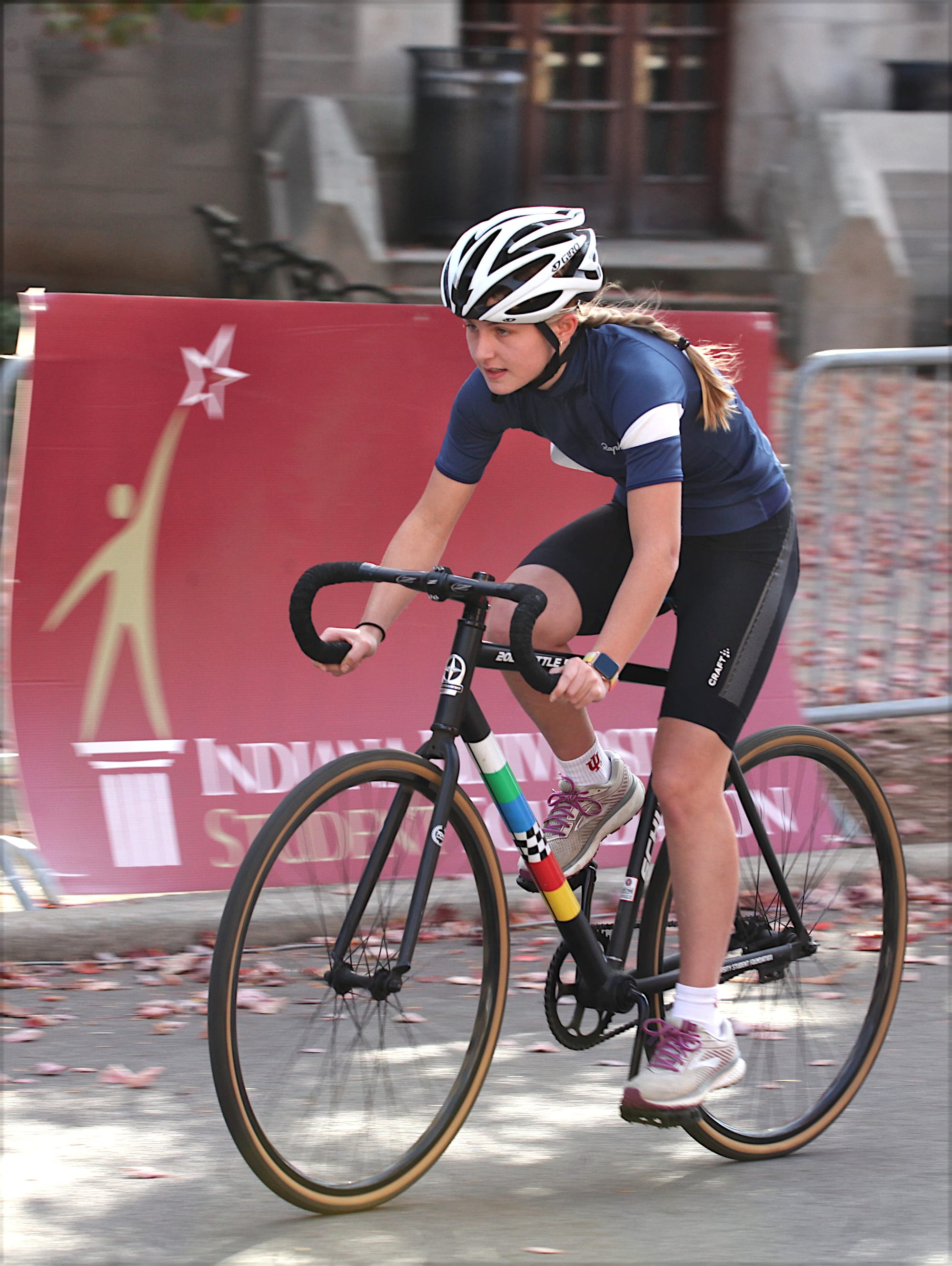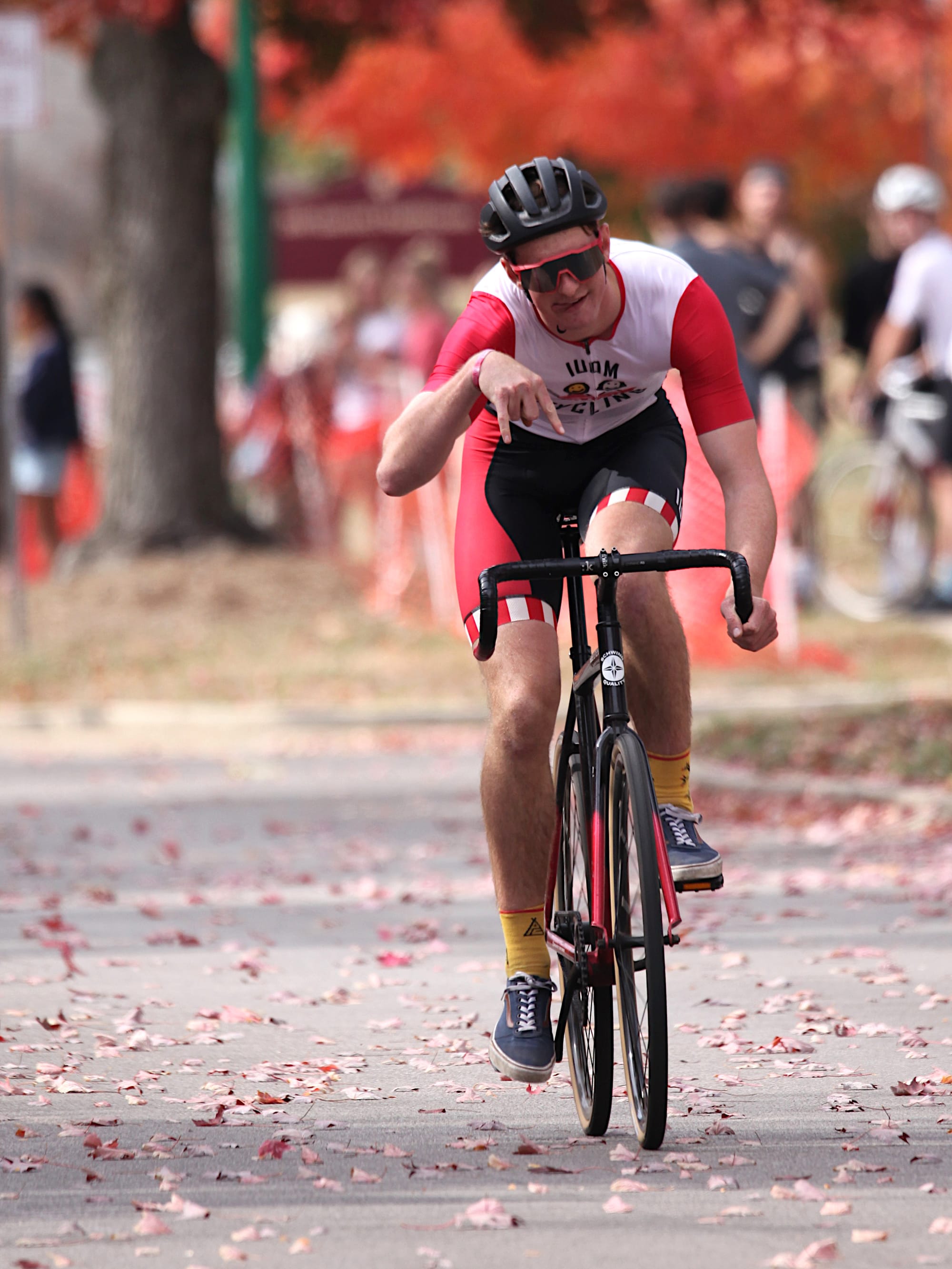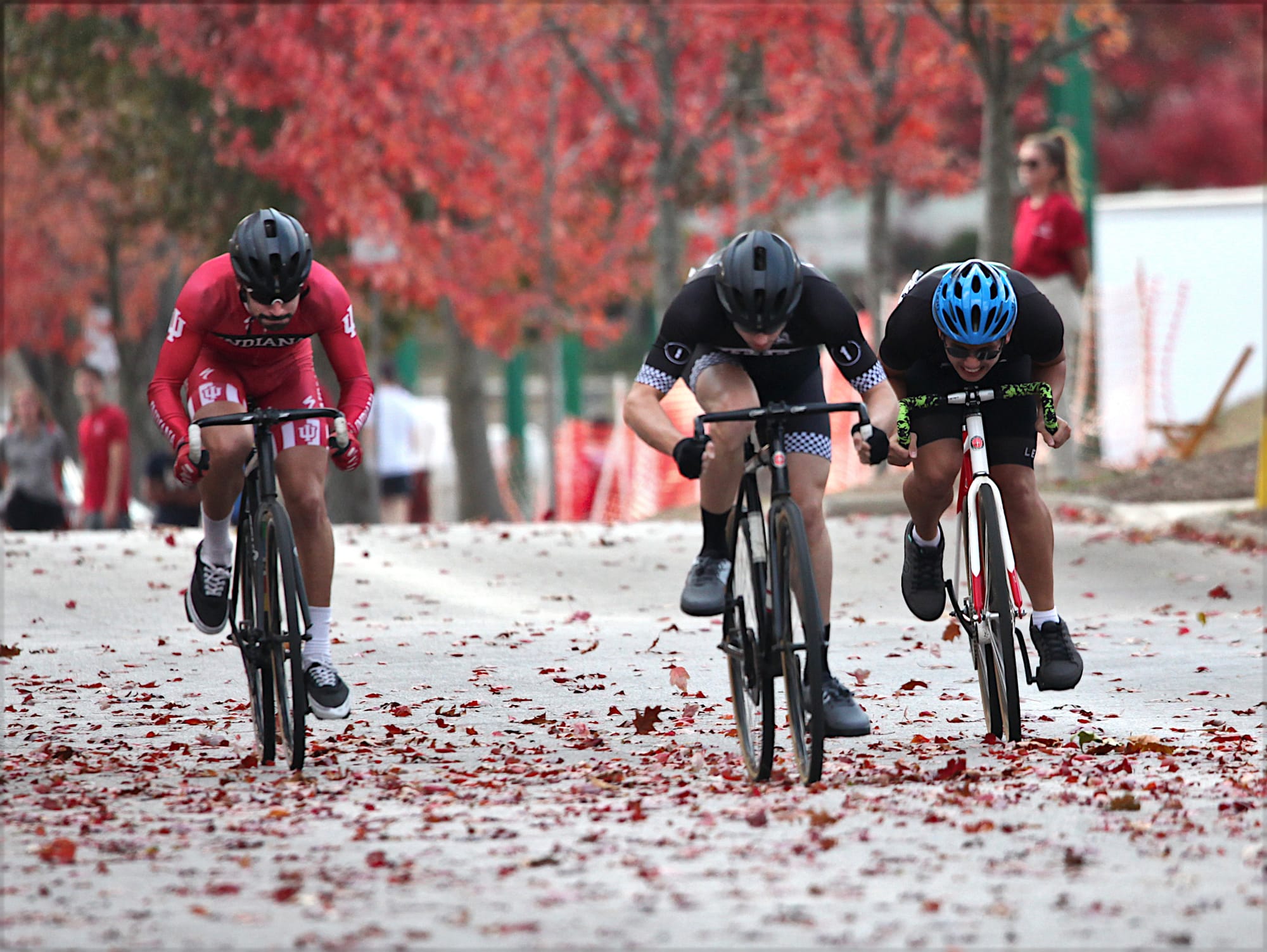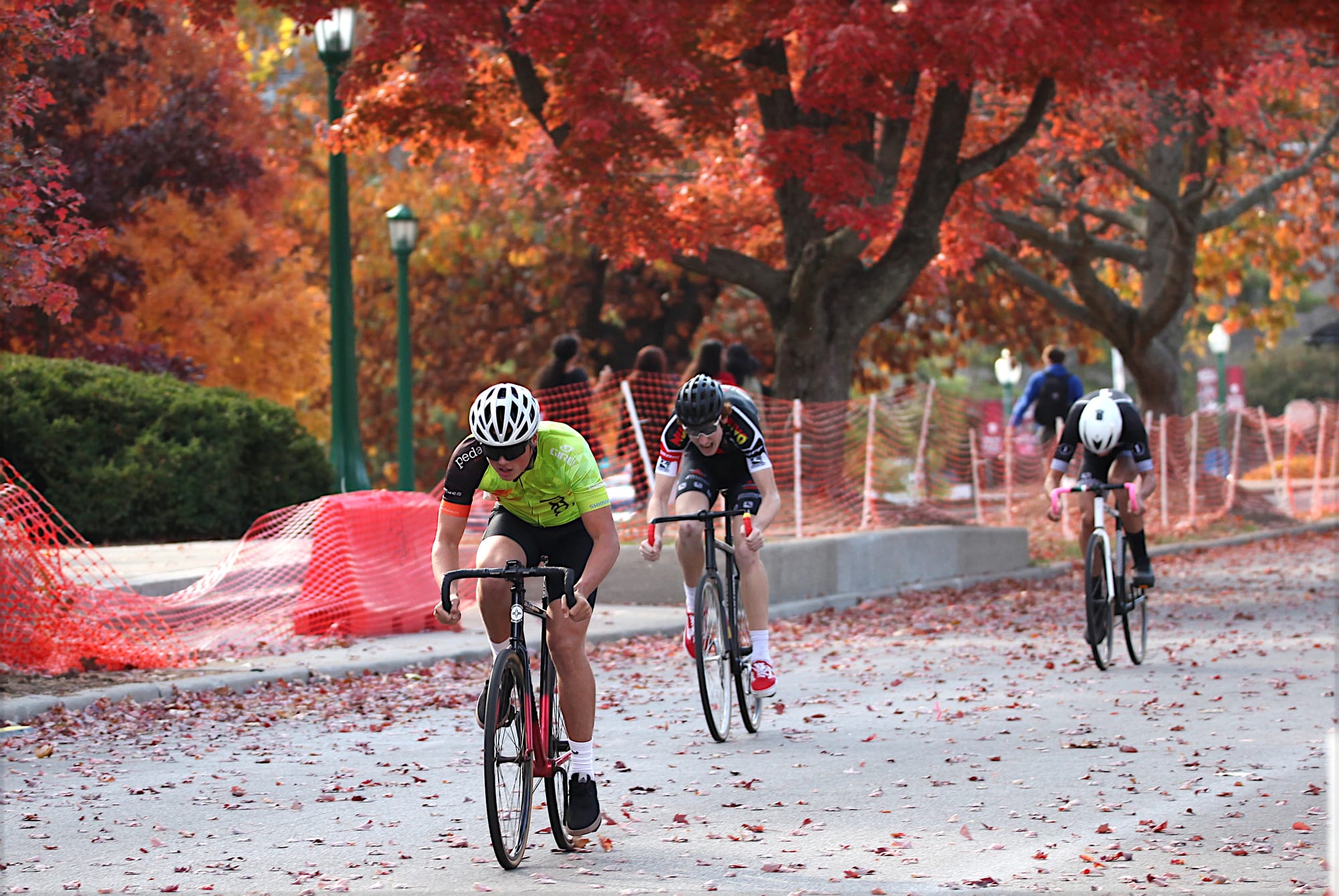 Saturday’s sprints marked the second year for the Indiana University campus venue, which runs along 7th Street from the Indiana Memorial Union east towards Showalter Fountain. On Saturday, the bright sun lit up the trees lining the route into a red and orange canopy of fall colors. The temperature hovered in the mid-70s. A red-tailed hawk kept watch from the top of the Indiana Memorial Union.