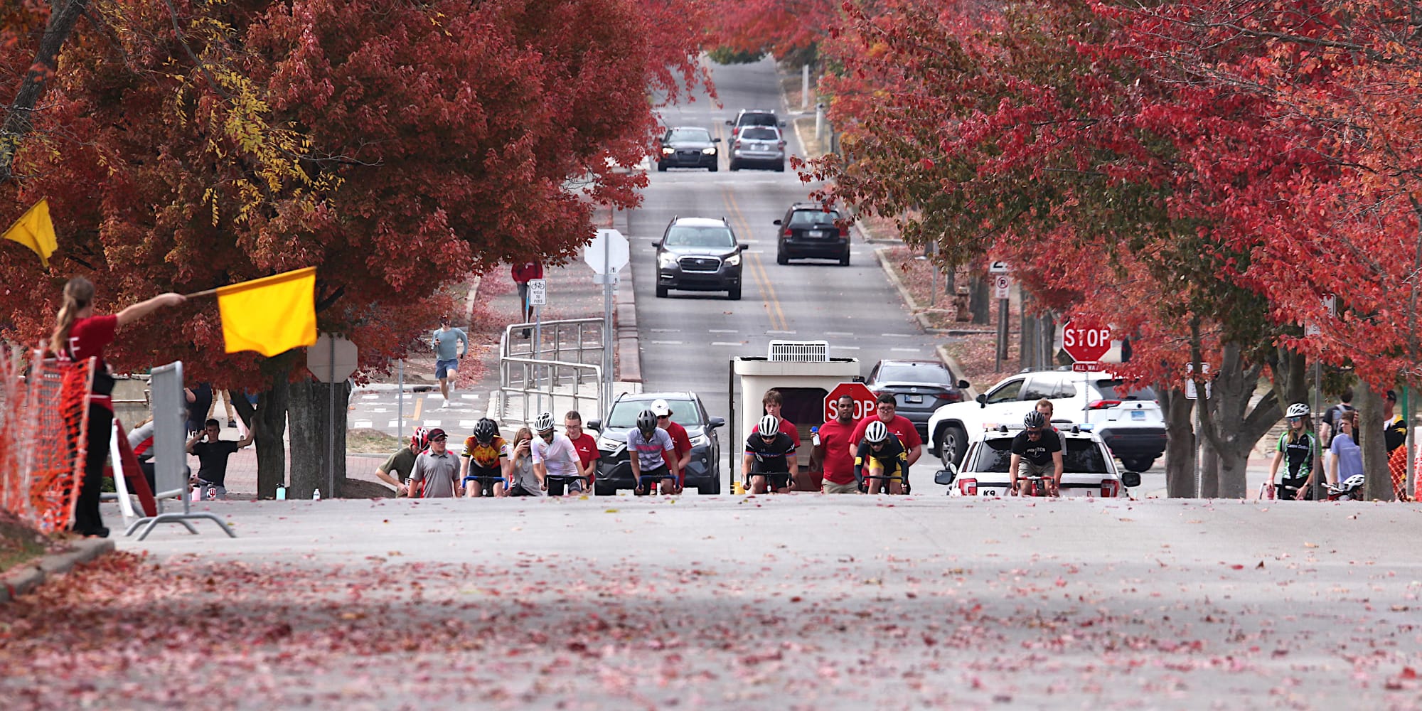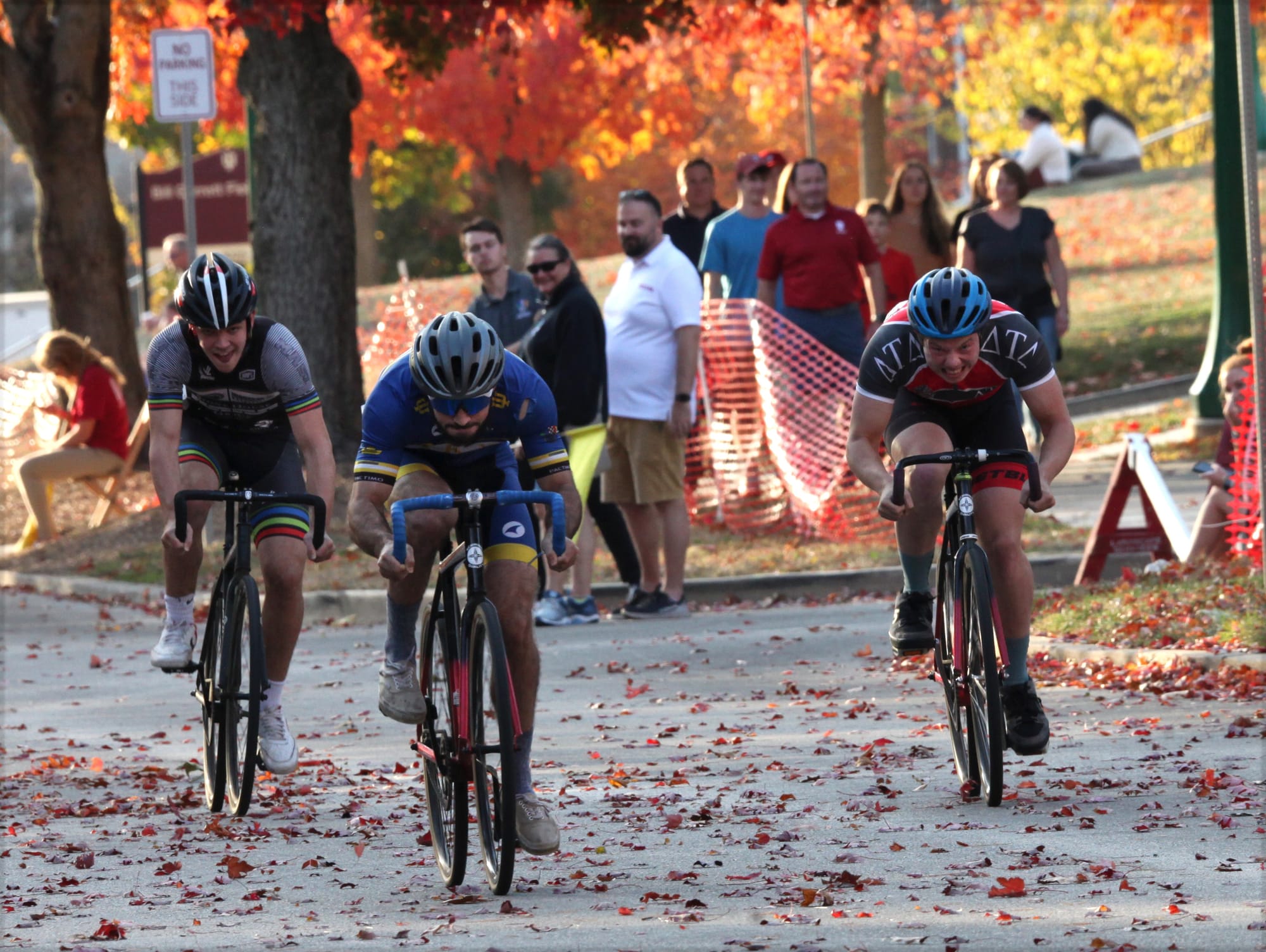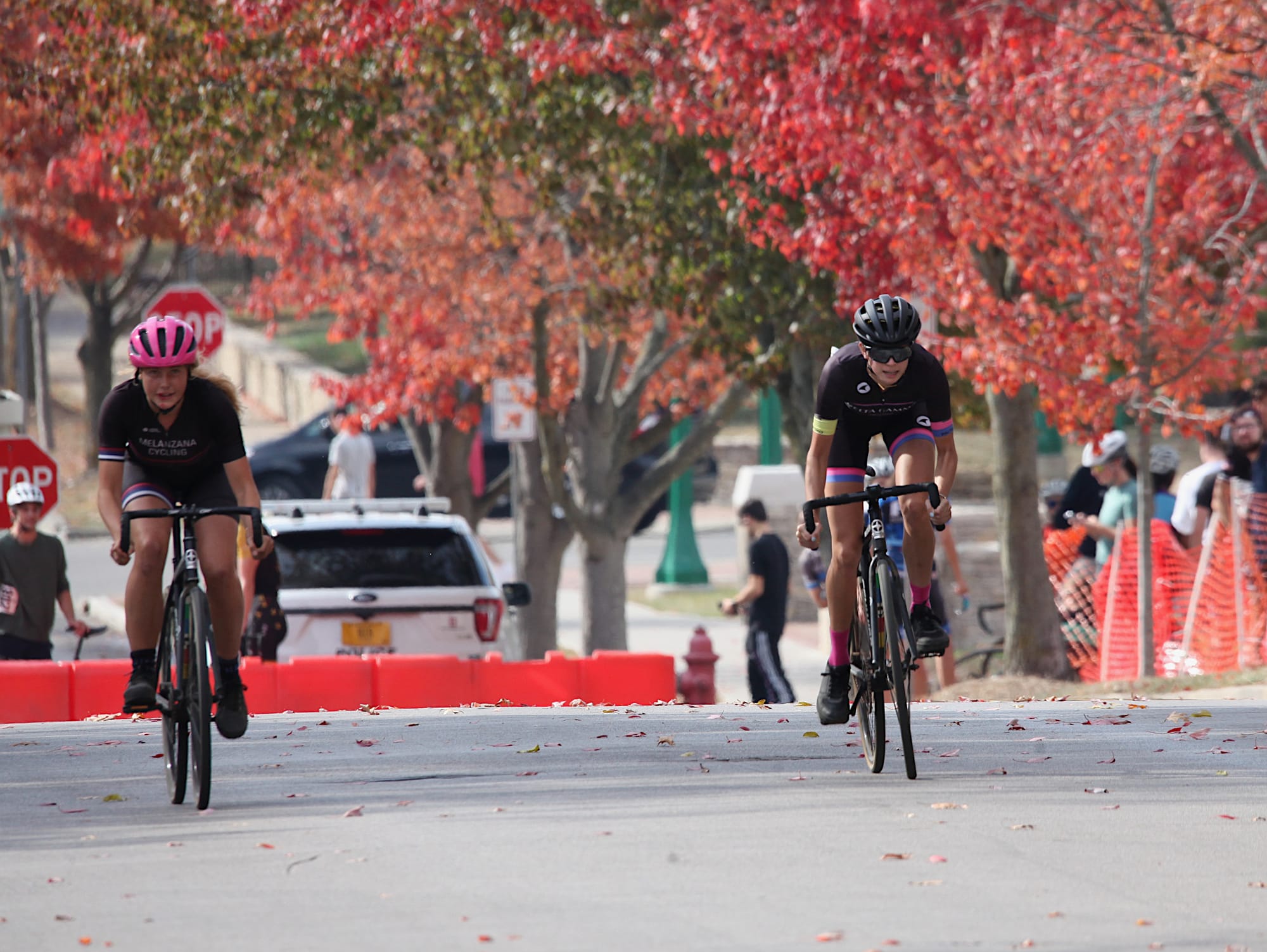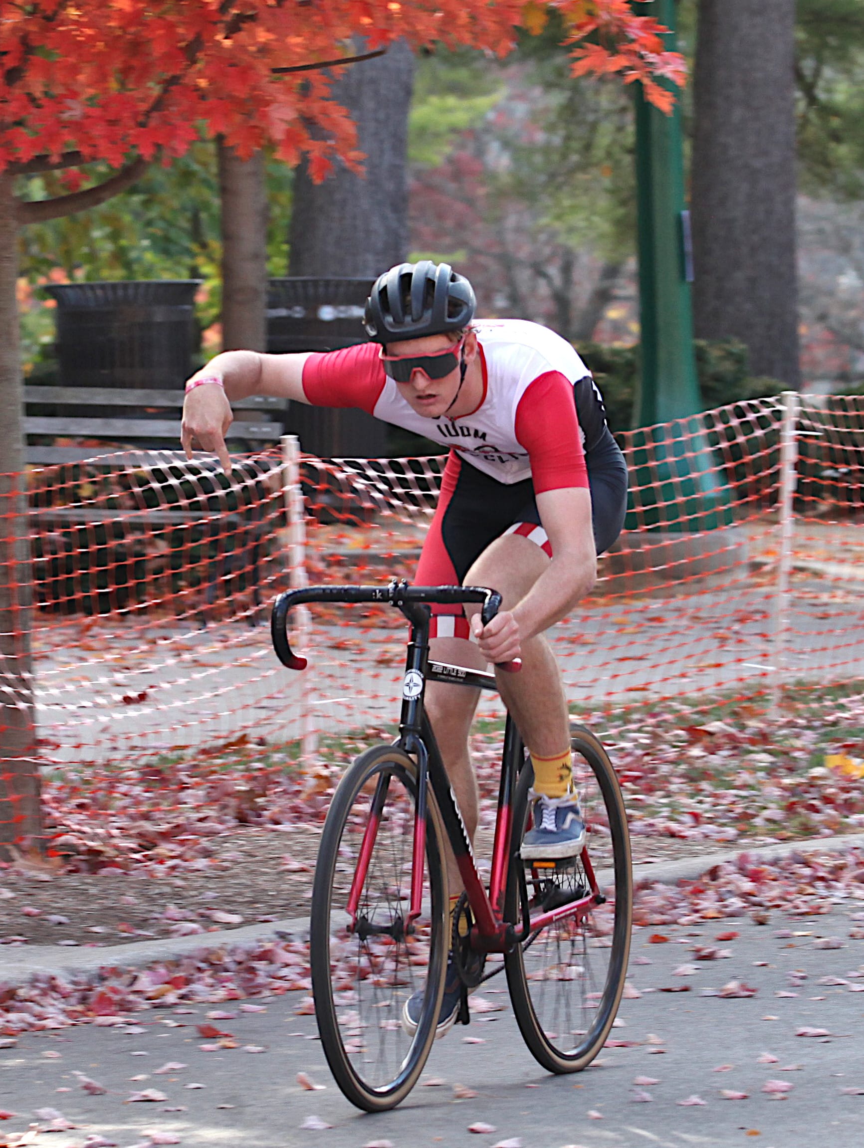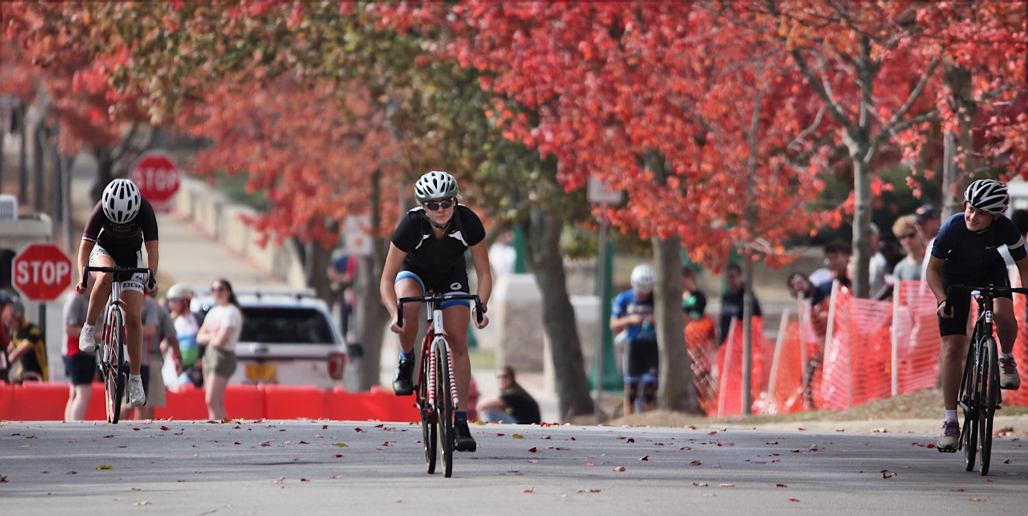 Saturday’s sprints marked the second year for the Indiana University campus venue, which runs along 7th Street from the Indiana Memorial Union east towards Showalter Fountain. On Saturday, the bright sun lit up the trees lining the route into a red and orange canopy of fall colors. The temperature hovered in the mid-70s. A red-tailed hawk kept watch from the top of the Indiana Memorial Union.
