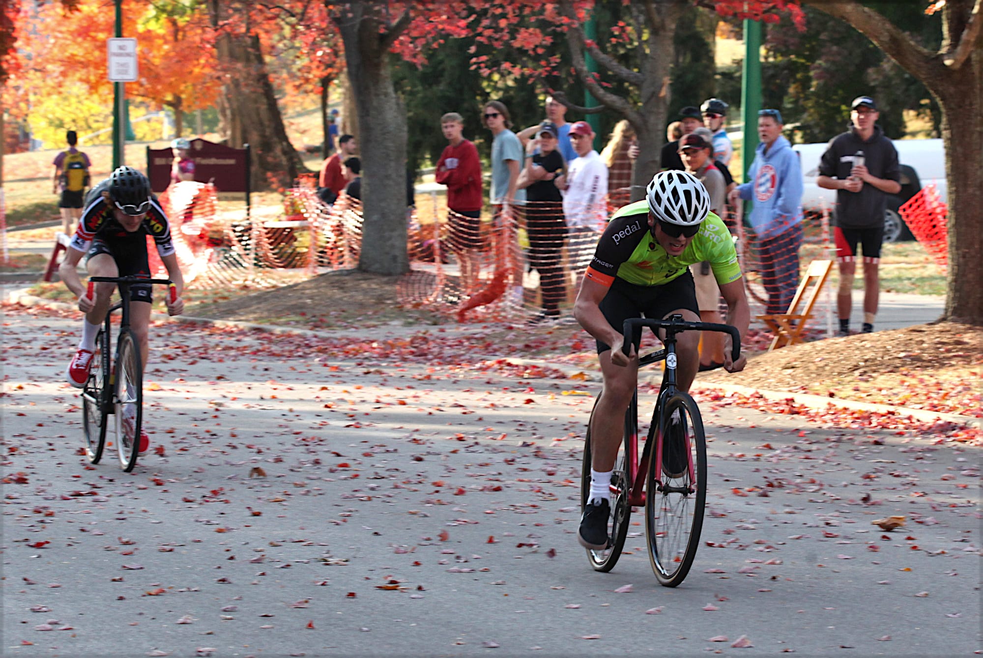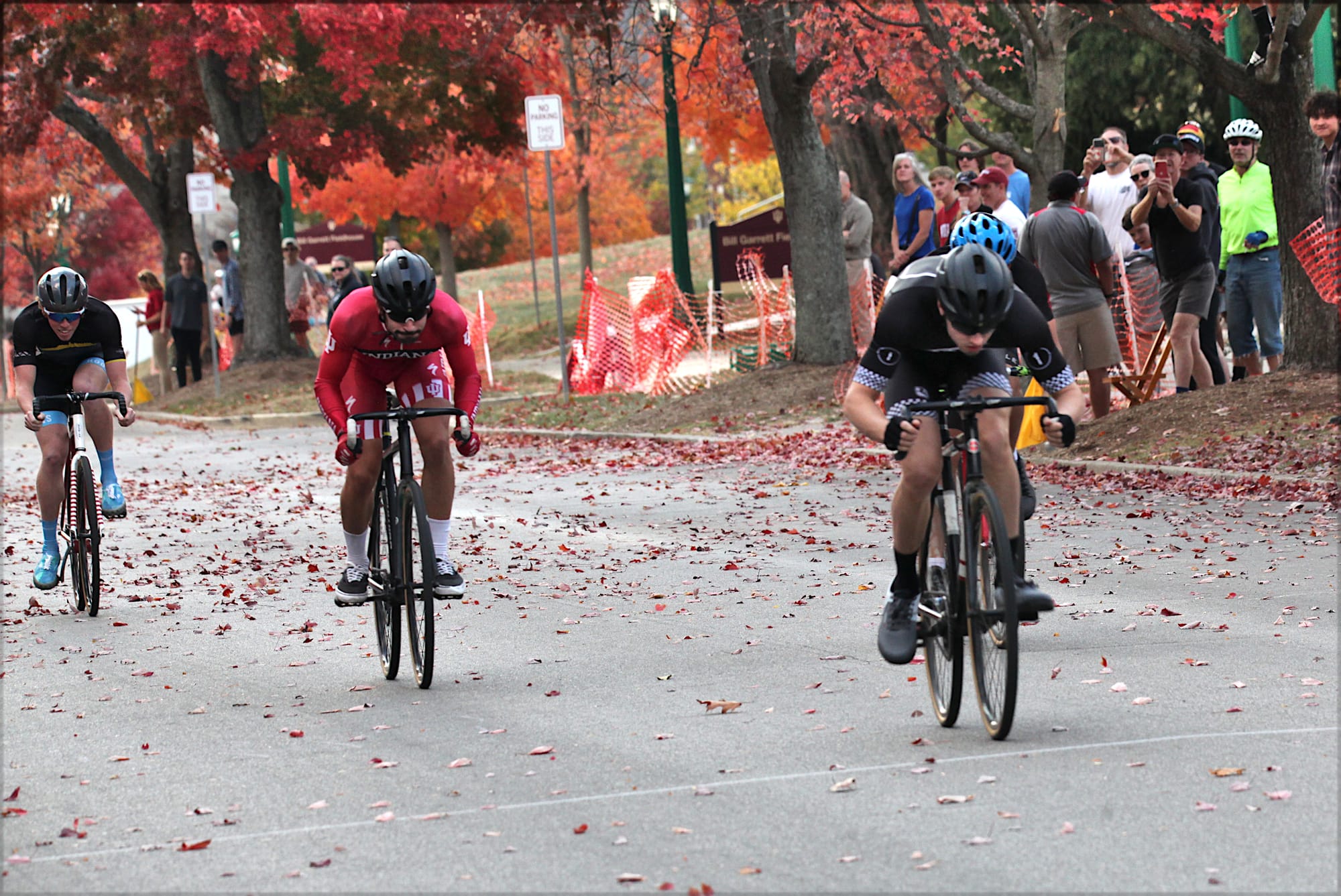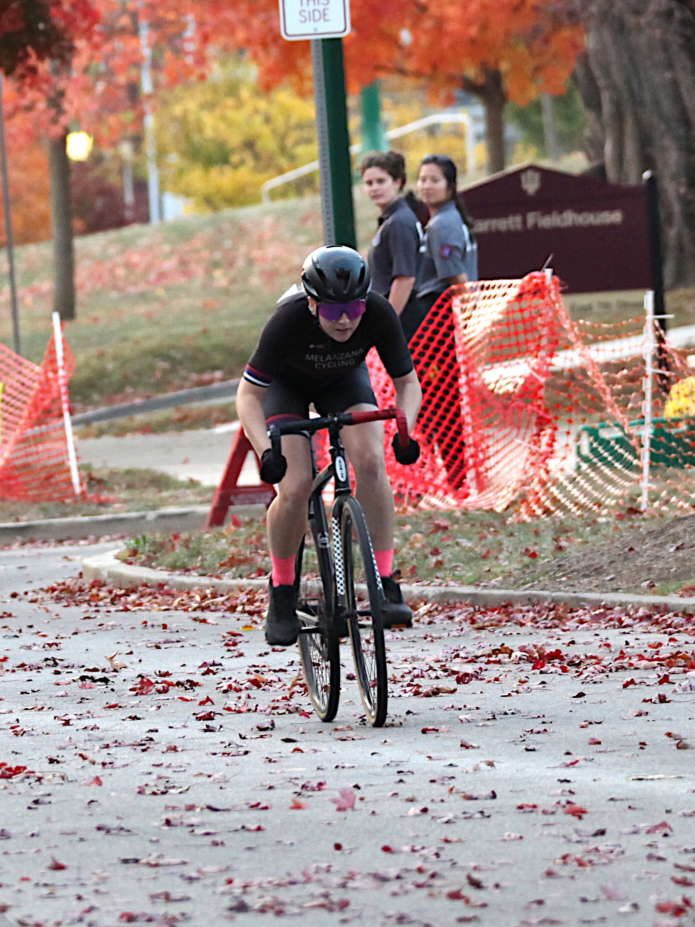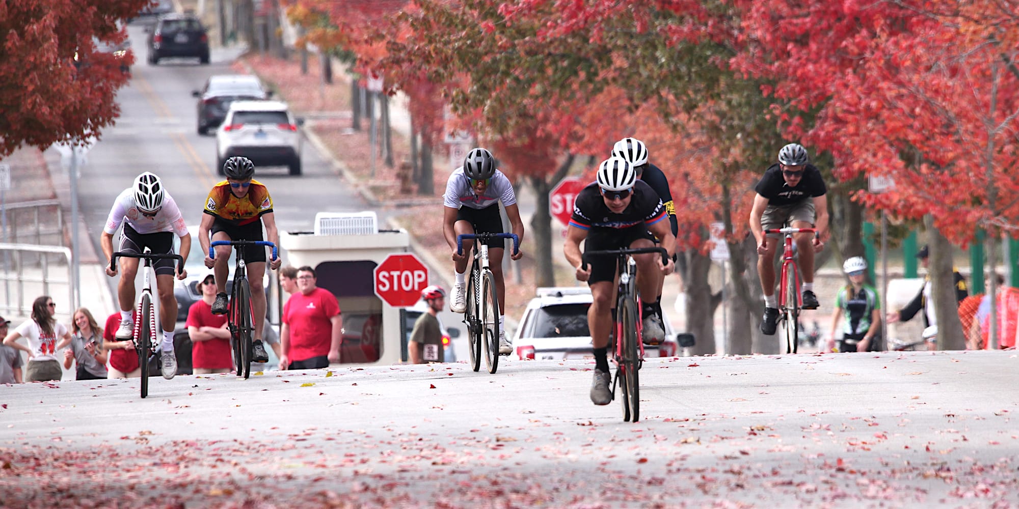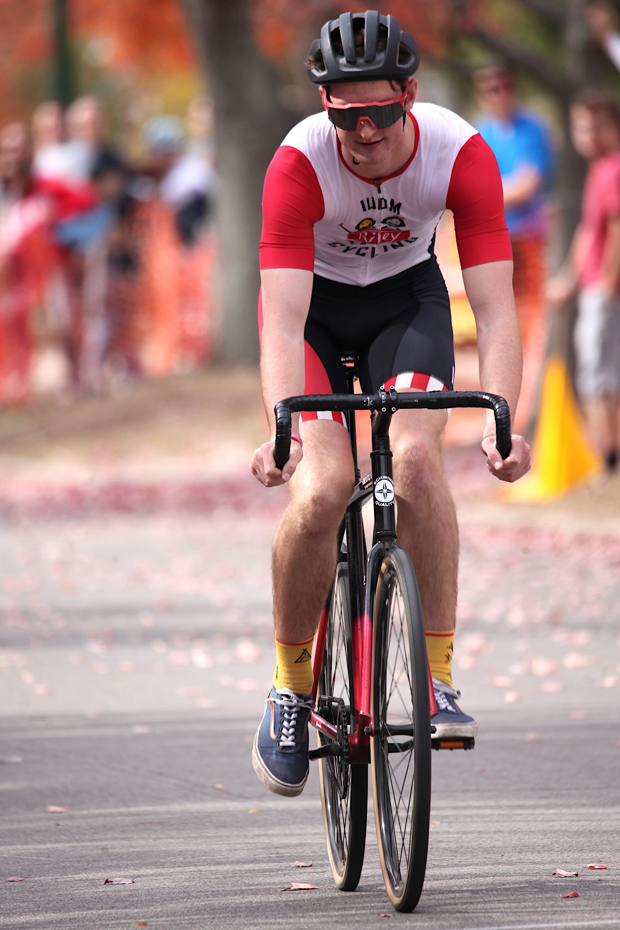 Saturday’s sprints marked the second year for the Indiana University campus venue, which runs along 7th Street from the Indiana Memorial Union east towards Showalter Fountain. On Saturday, the bright sun lit up the trees lining the route into a red and orange canopy of fall colors. The temperature hovered in the mid-70s. A red-tailed hawk kept watch from the top of the Indiana Memorial Union.
