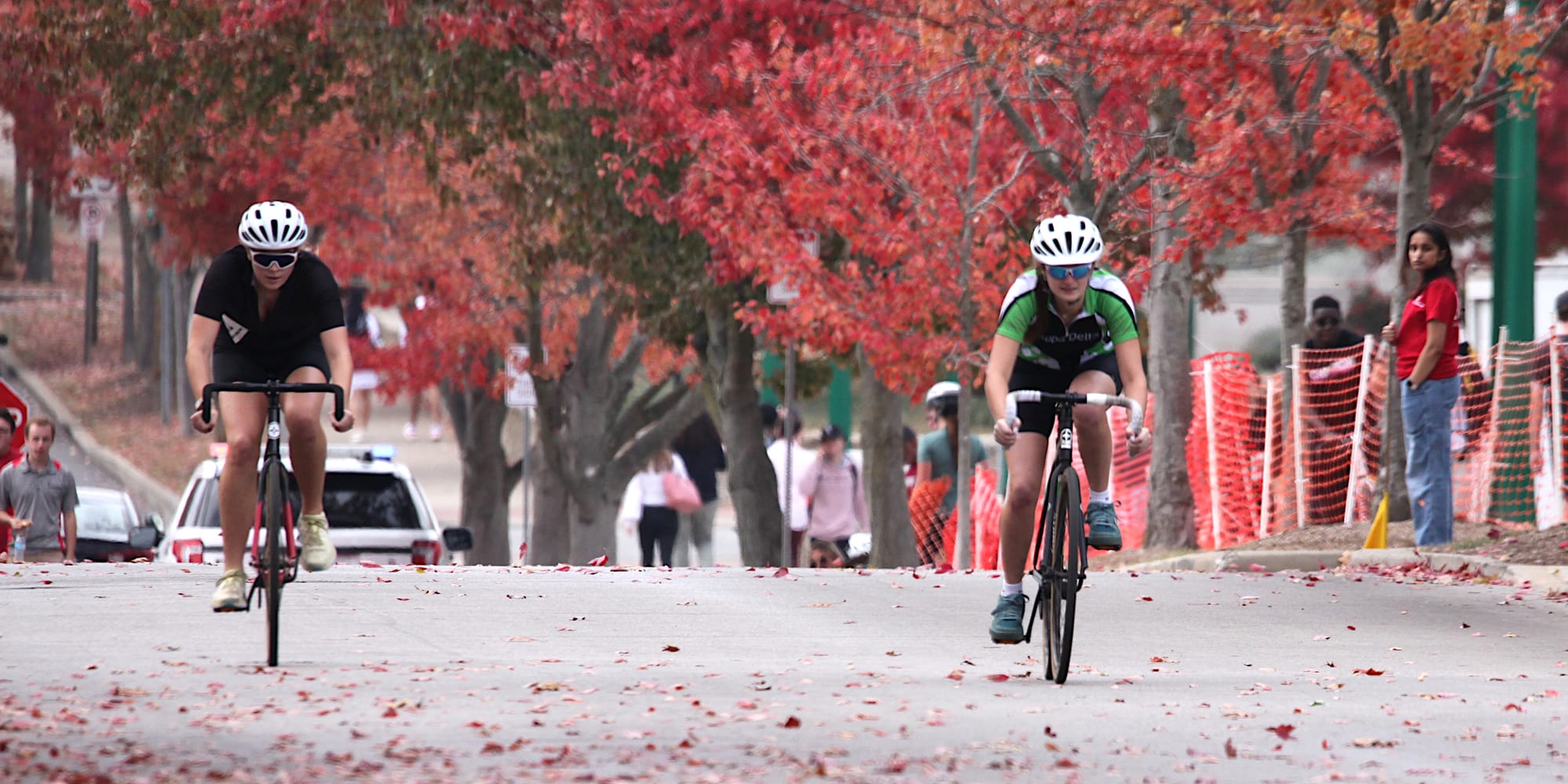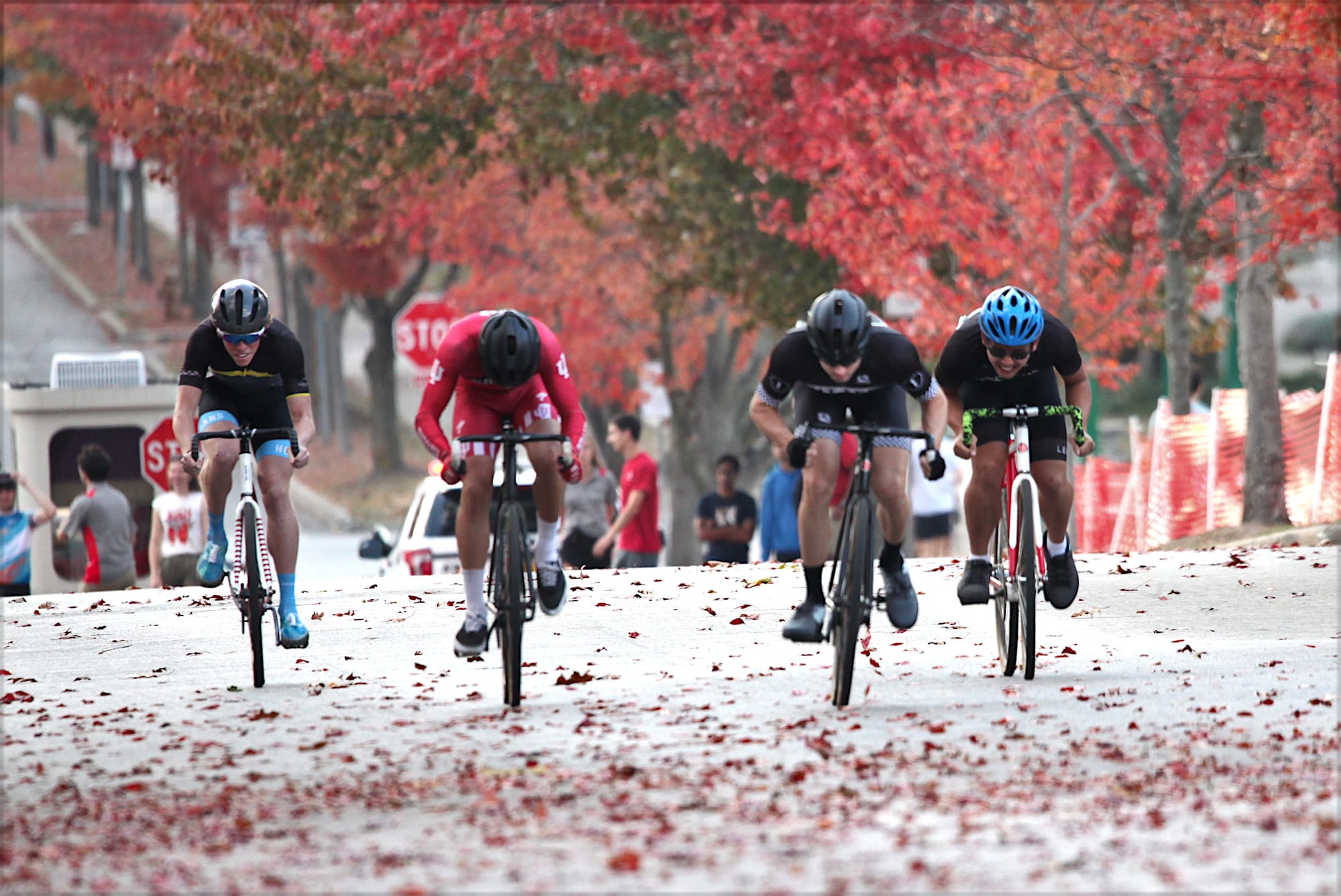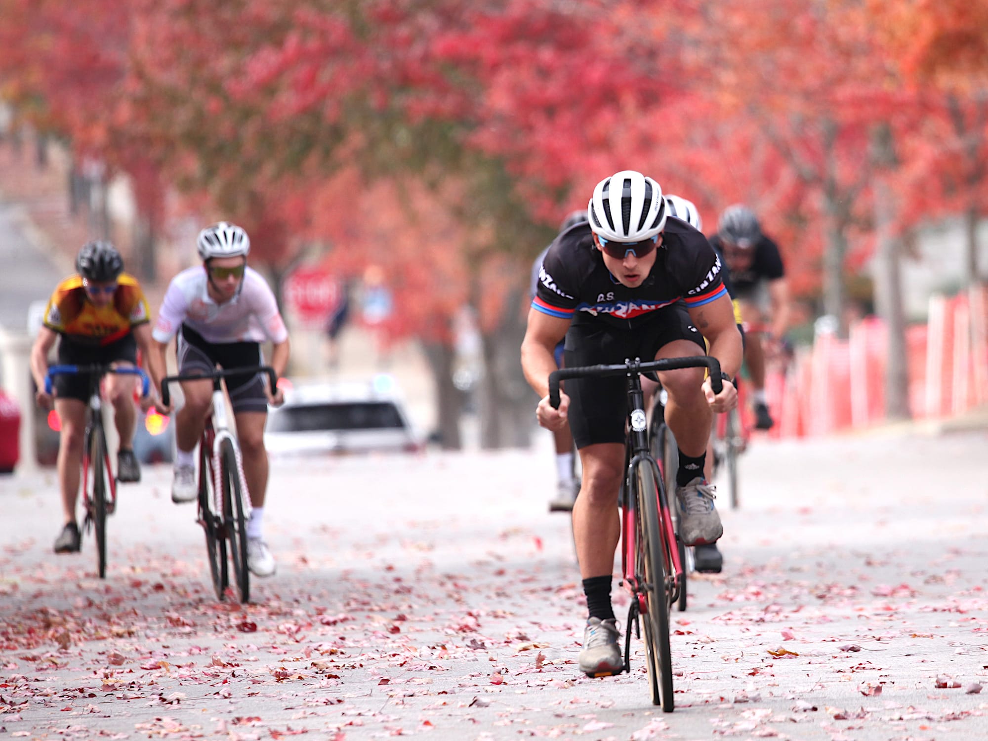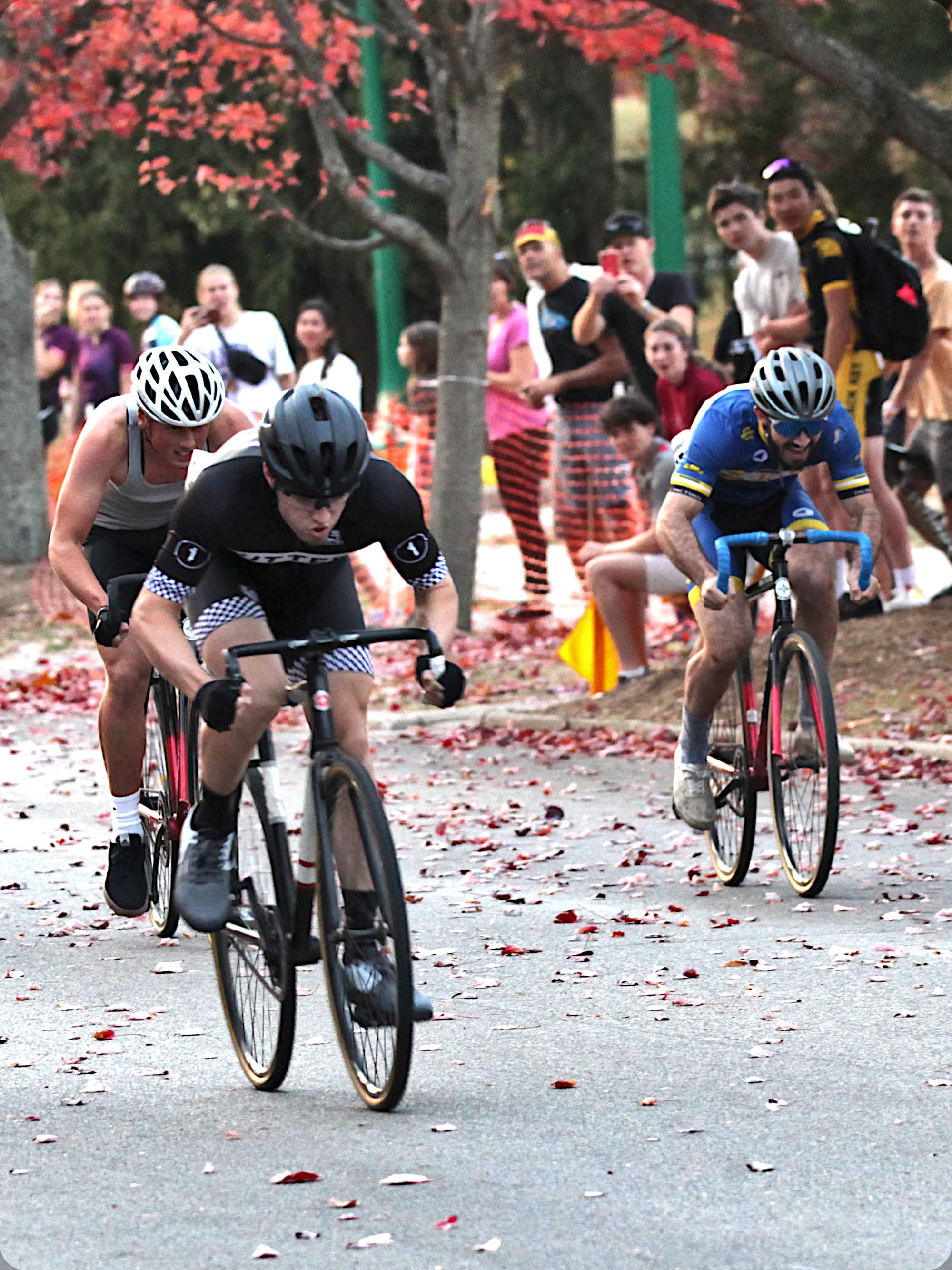 Saturday’s sprints marked the second year for the Indiana University campus venue, which runs along 7th Street from the Indiana Memorial Union east towards Showalter Fountain. On Saturday, the bright sun lit up the trees lining the route into a red and orange canopy of fall colors. The temperature hovered in the mid-70s. A red-tailed hawk kept watch from the top of the Indiana Memorial Union.