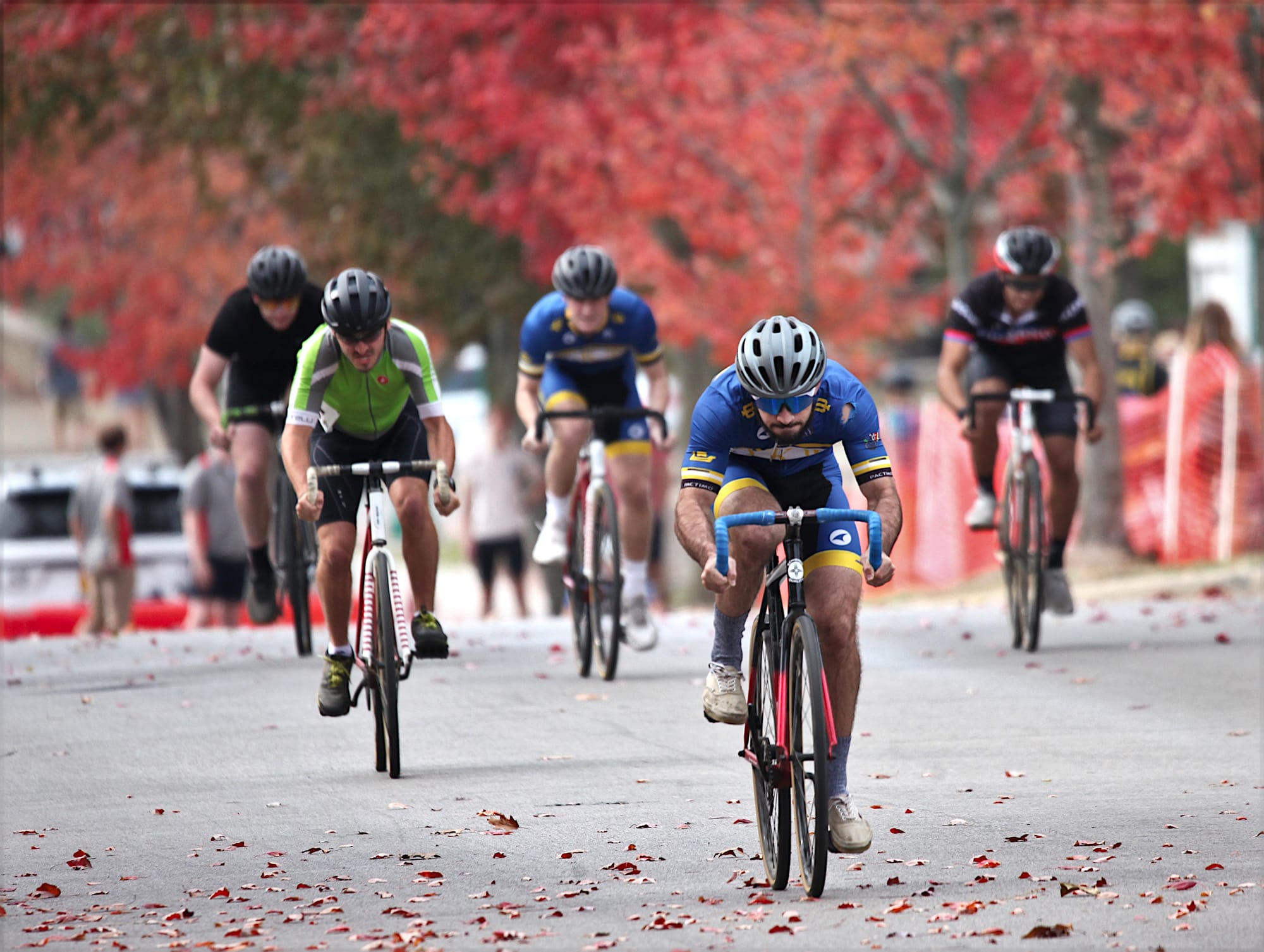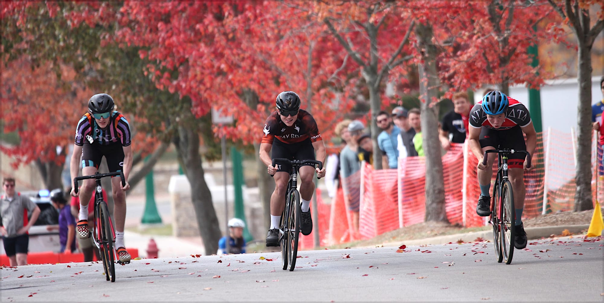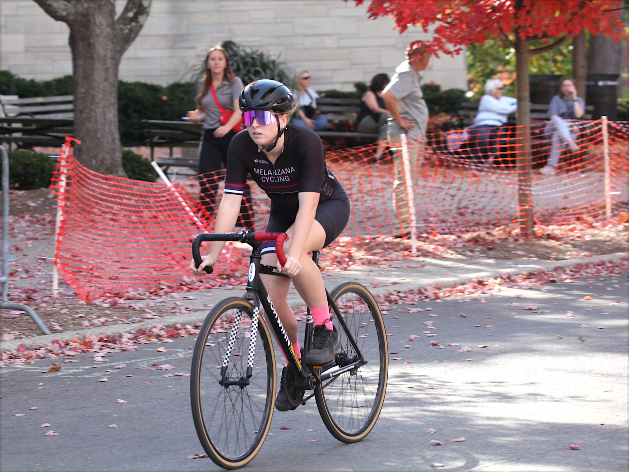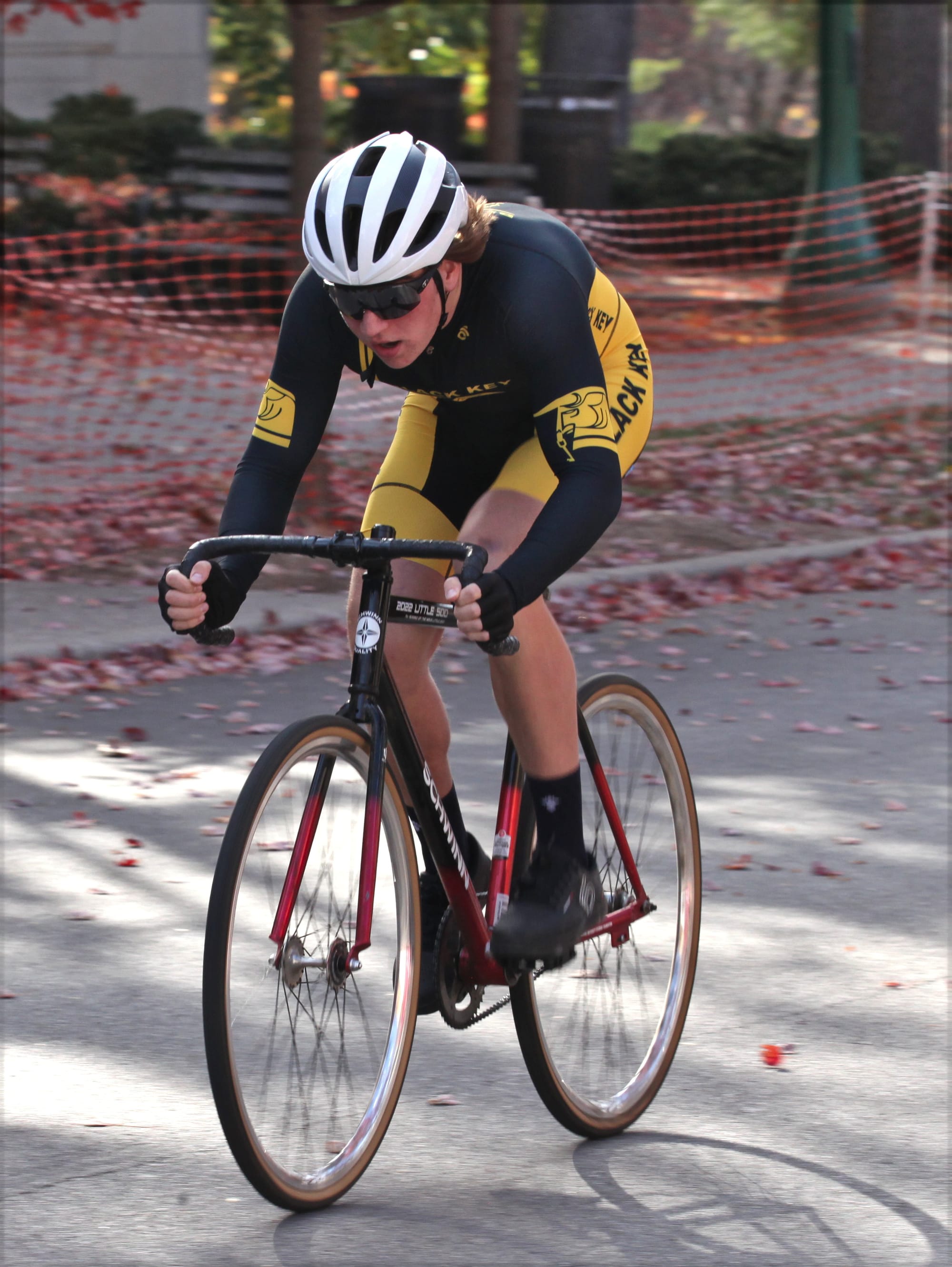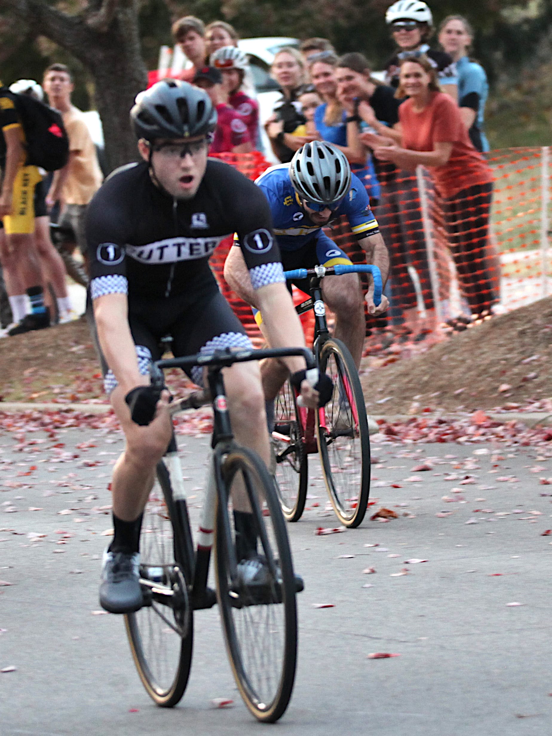 Saturday’s sprints marked the second year for the Indiana University campus venue, which runs along 7th Street from the Indiana Memorial Union east towards Showalter Fountain. On Saturday, the bright sun lit up the trees lining the route into a red and orange canopy of fall colors. The temperature hovered in the mid-70s. A red-tailed hawk kept watch from the top of the Indiana Memorial Union.