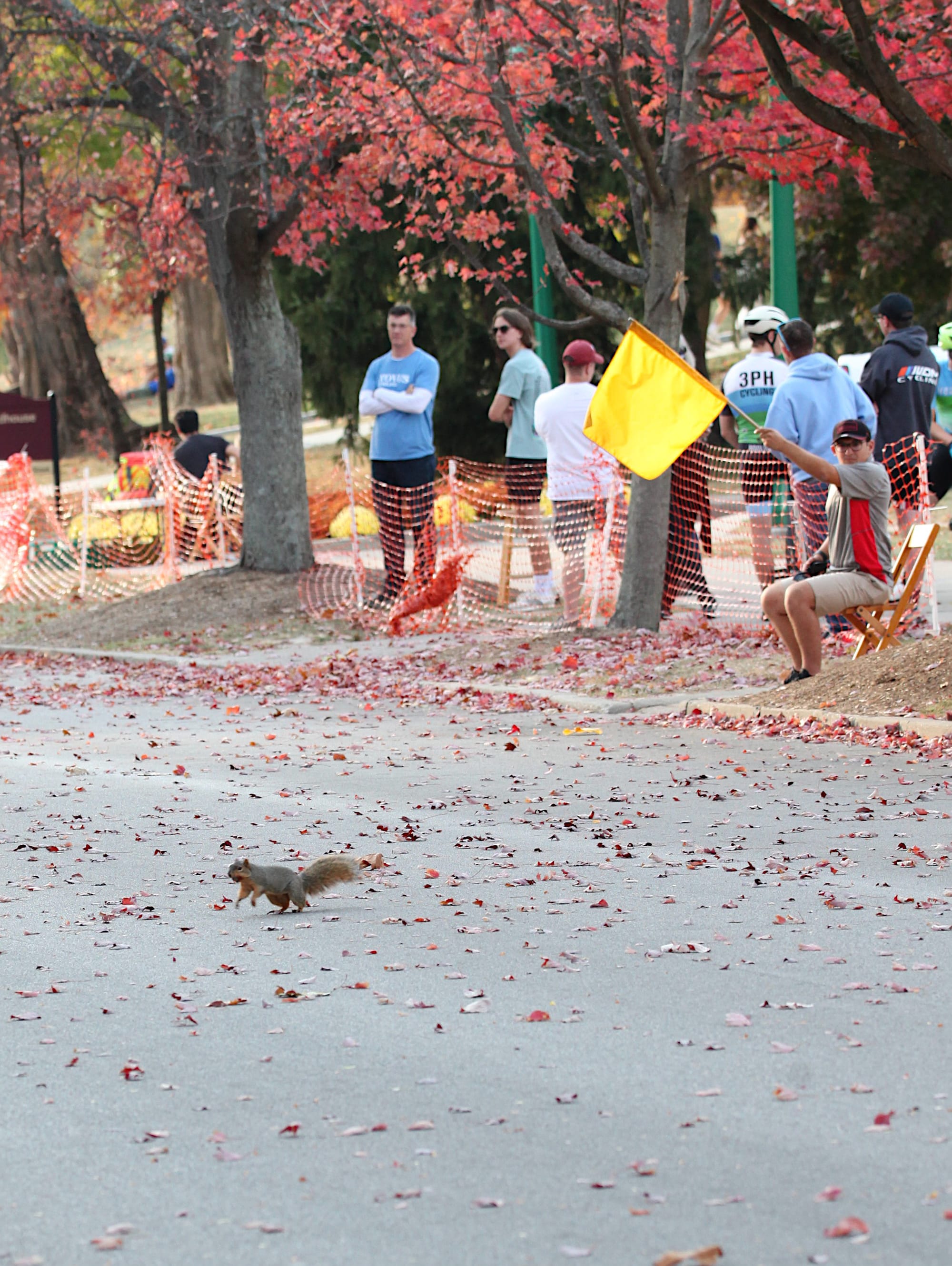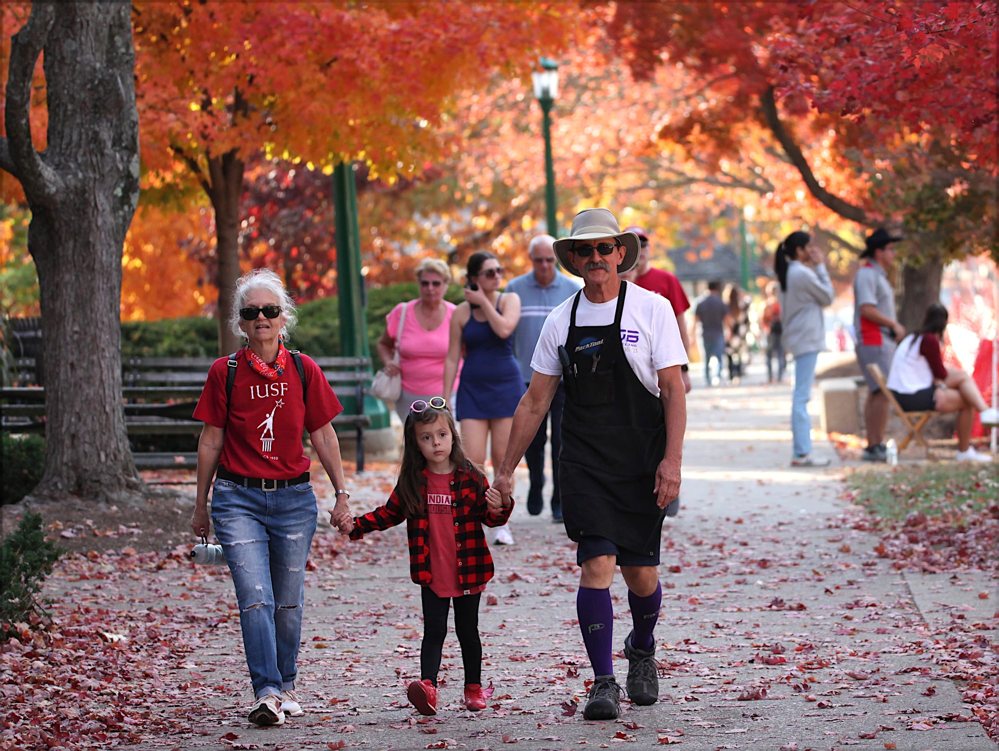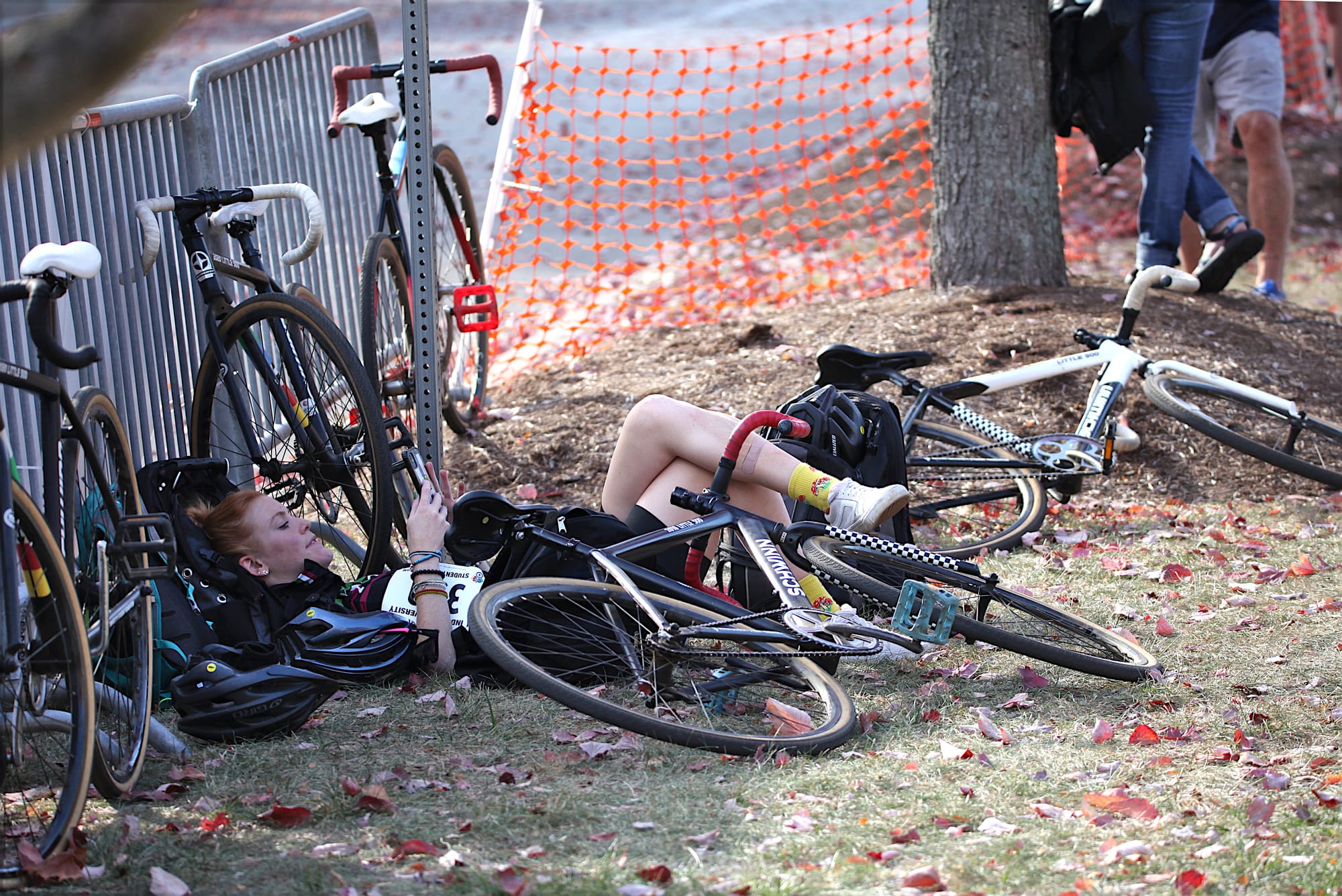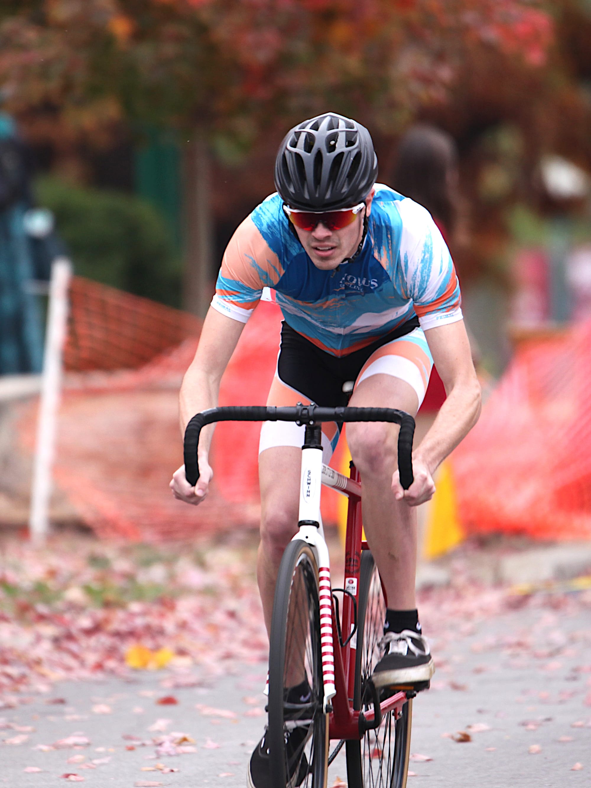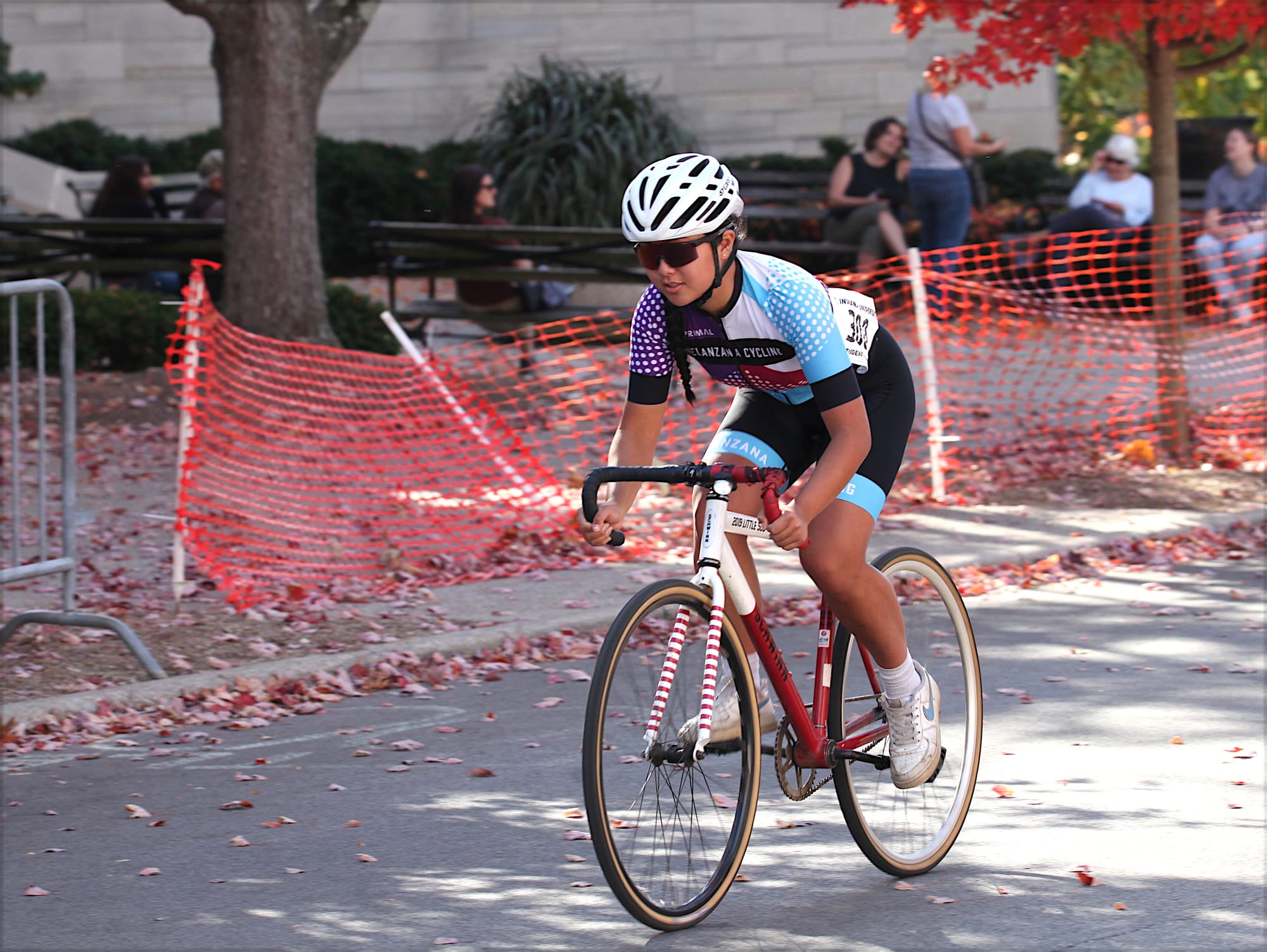 Saturday’s sprints marked the second year for the Indiana University campus venue, which runs along 7th Street from the Indiana Memorial Union east towards Showalter Fountain. On Saturday, the bright sun lit up the trees lining the route into a red and orange canopy of fall colors. The temperature hovered in the mid-70s. A red-tailed hawk kept watch from the top of the Indiana Memorial Union.