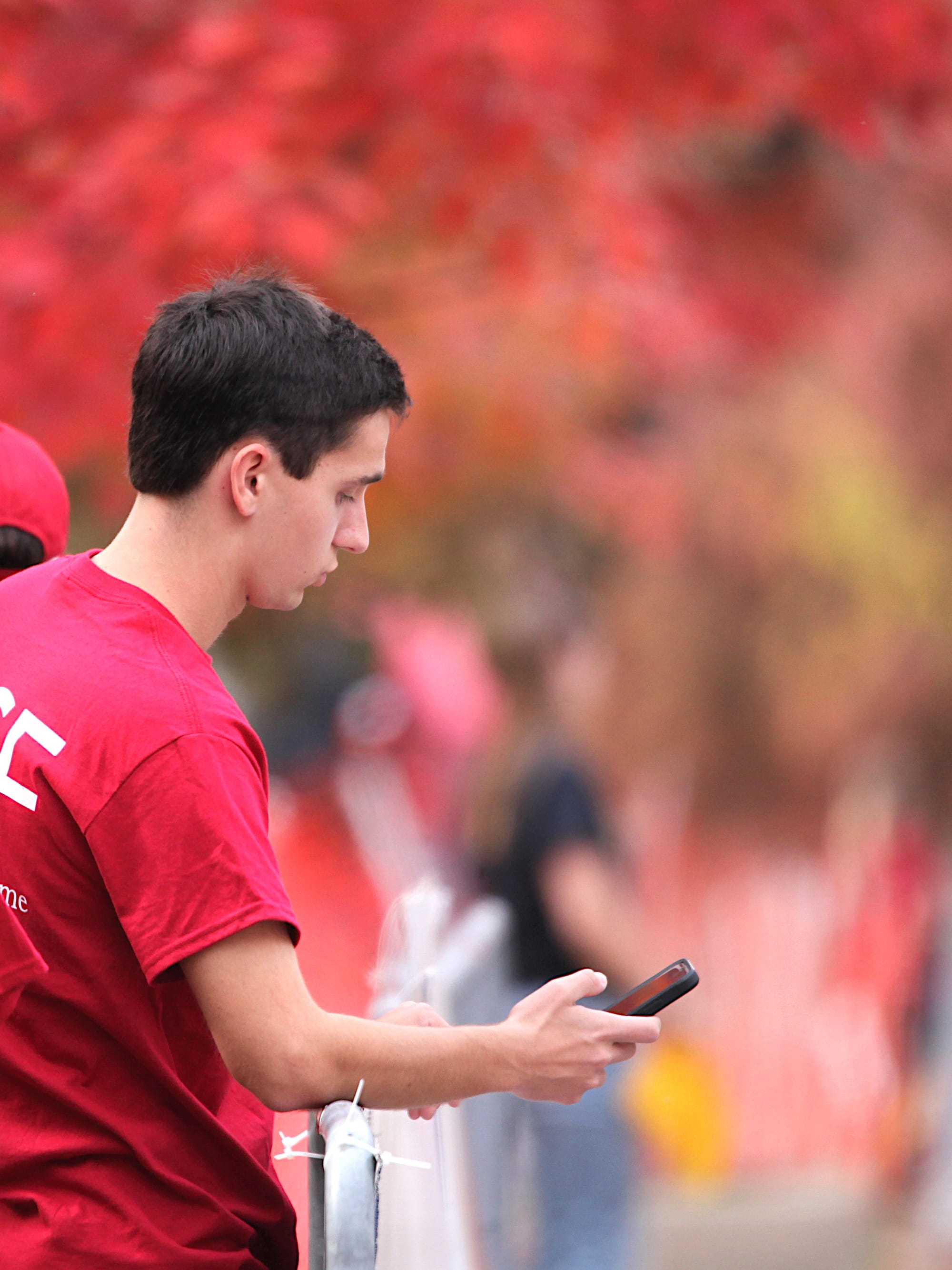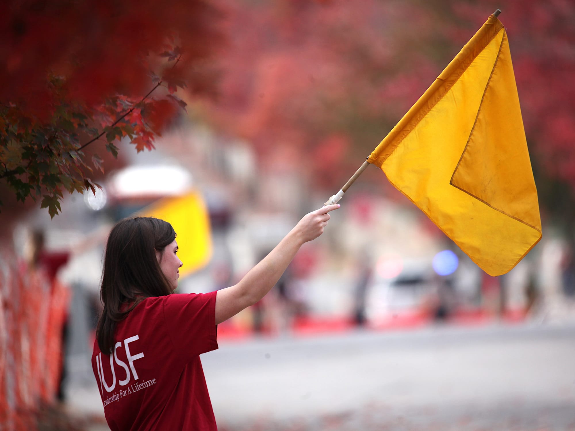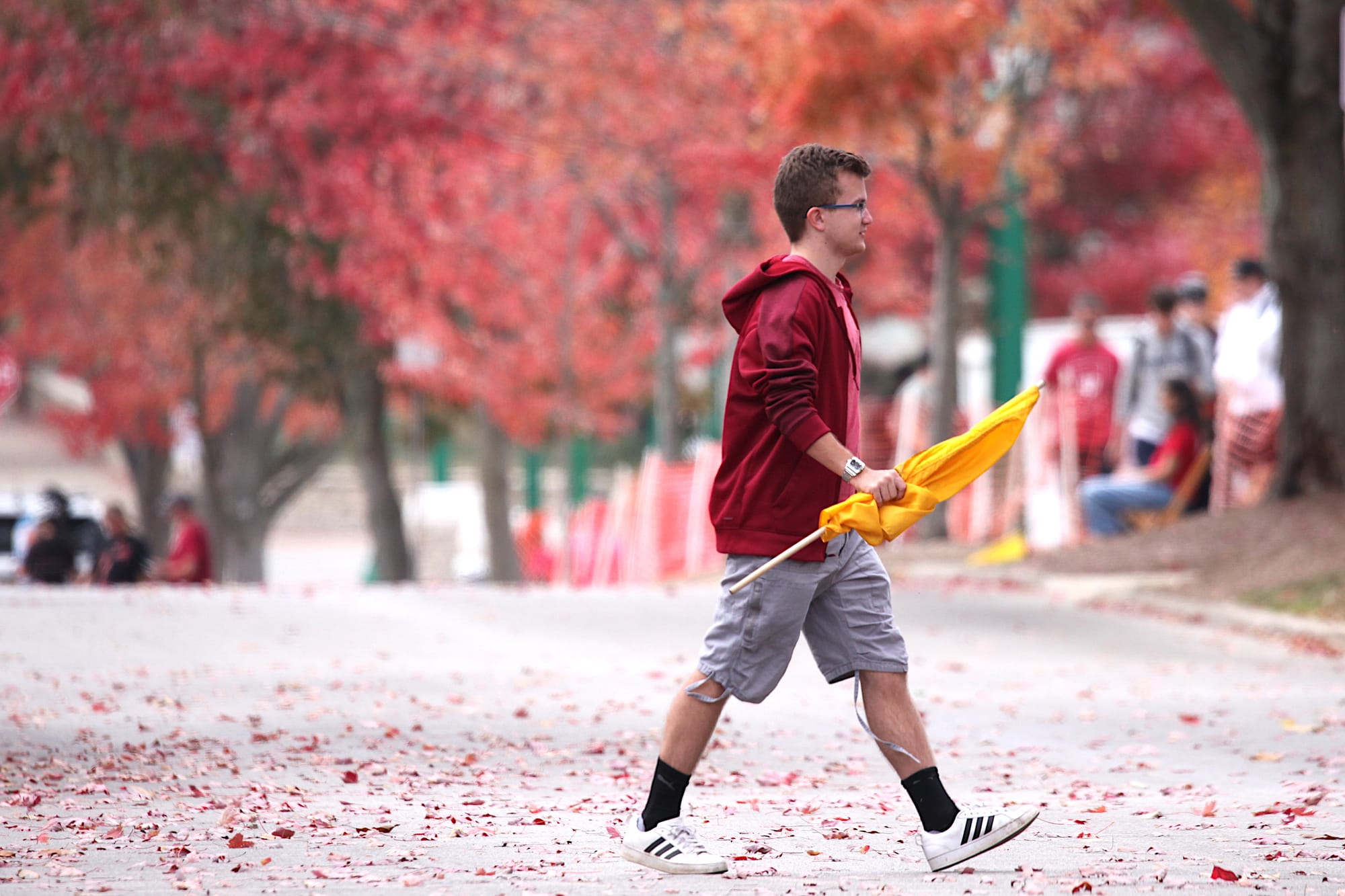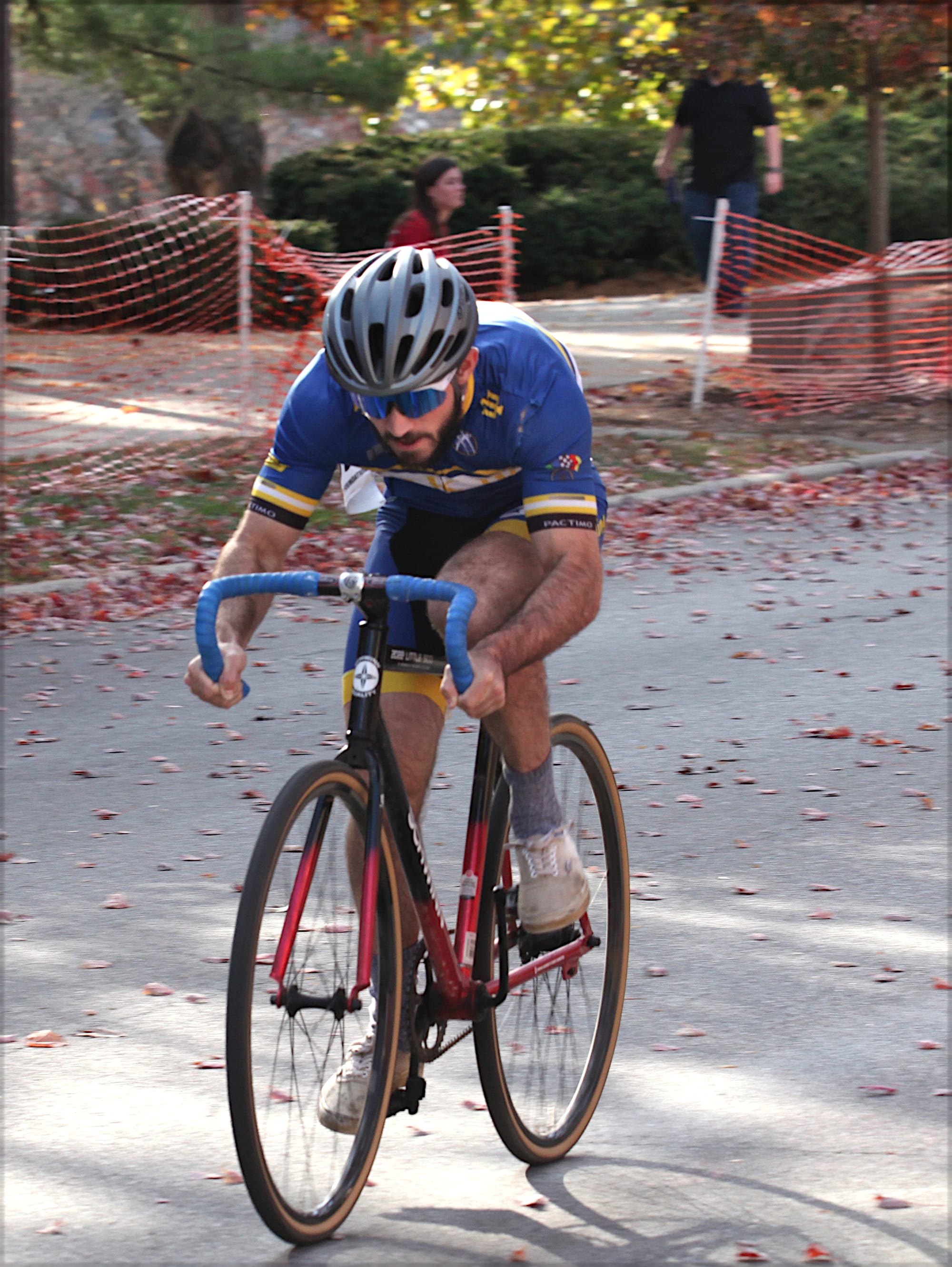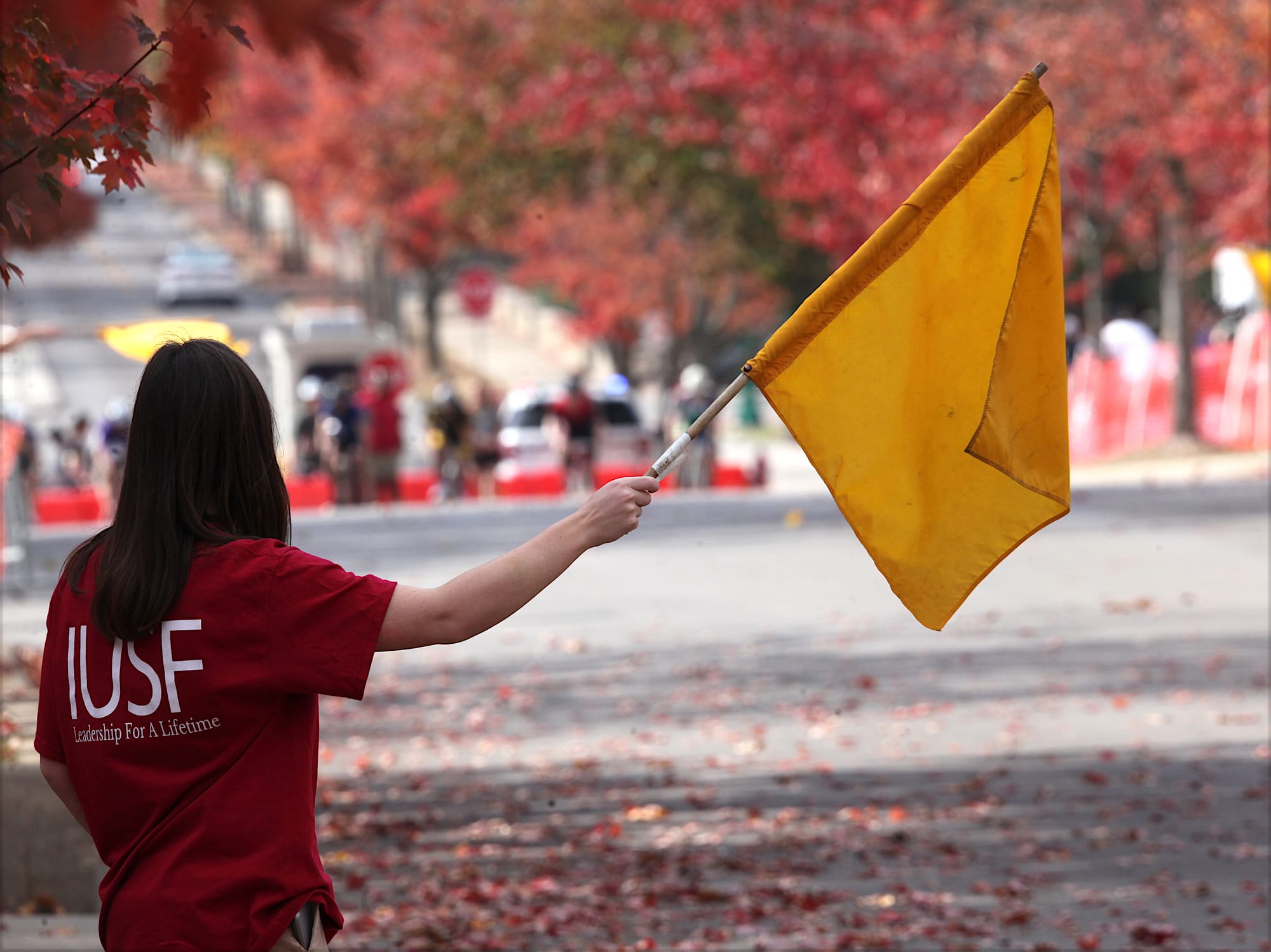Saturday’s sprints marked the second year for the Indiana University campus venue, which runs along 7th Street from the Indiana Memorial Union east towards Showalter Fountain. On Saturday, the bright sun lit up the trees lining the route into a red and orange canopy of fall colors. The temperature hovered in the mid-70s. A red-tailed hawk kept watch from the top of the Indiana Memorial Union.