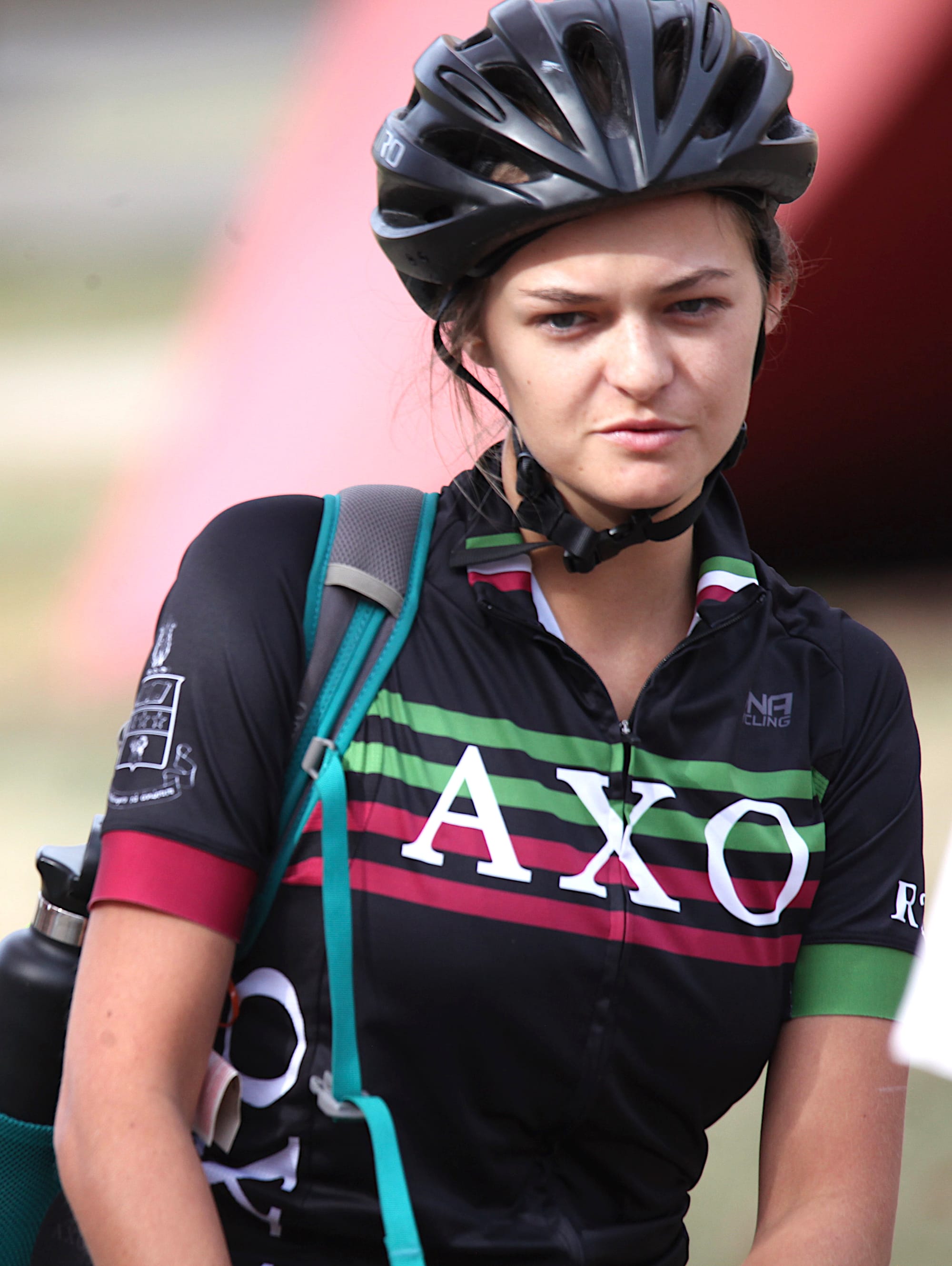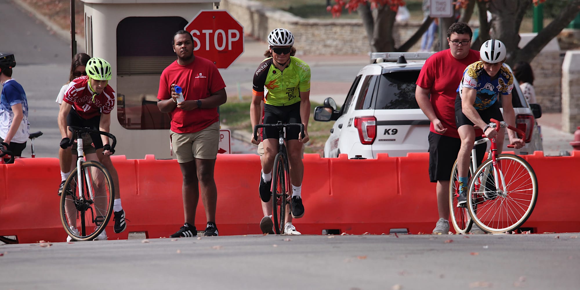The bicycles for the race are standard issue for the Little 500, which run single-speed 46 x 18 gears. At the start line, each rider is held vertical on their machine by a race official.