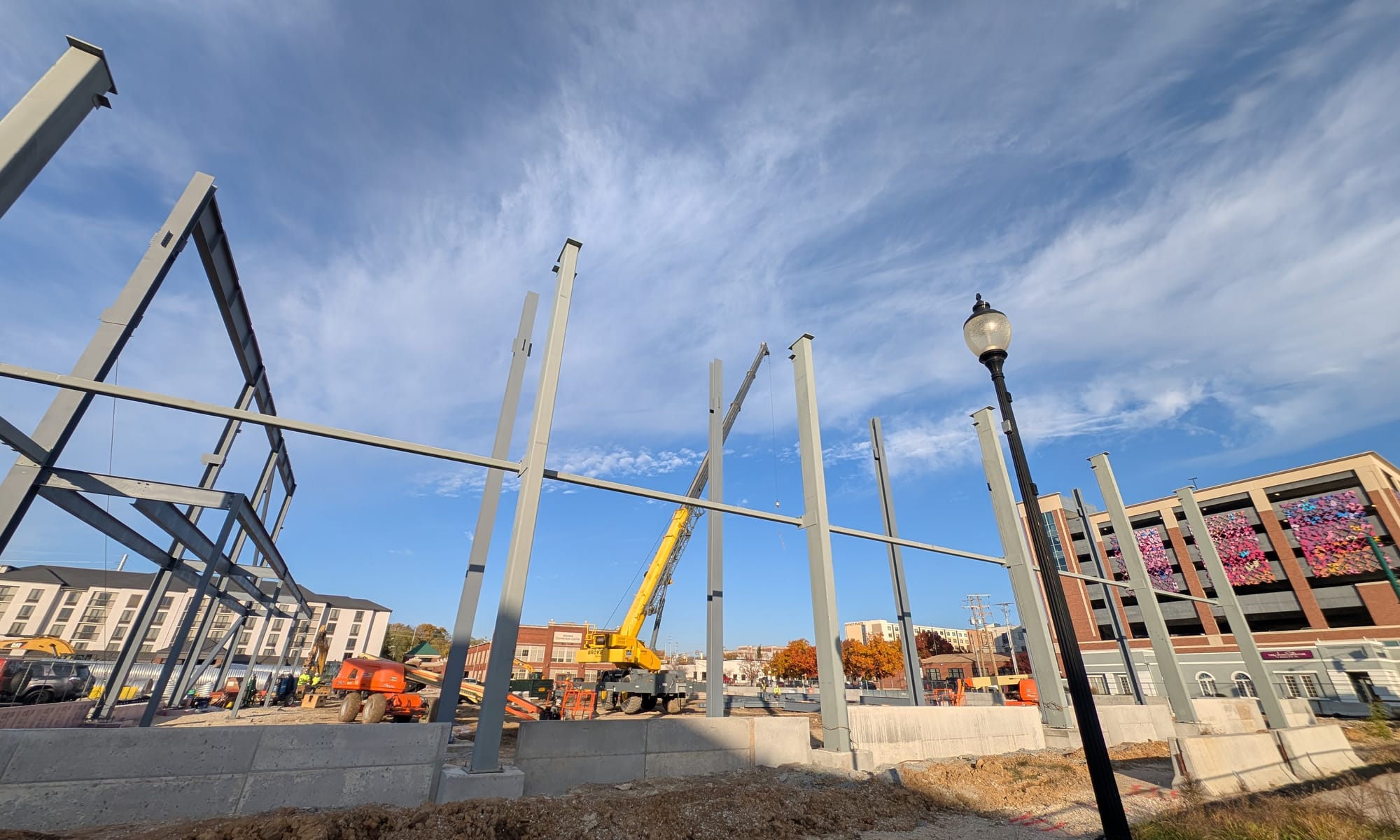 The structural steel is going up at the construction site of the convention center expansion. This is the view looking northwest across the site.