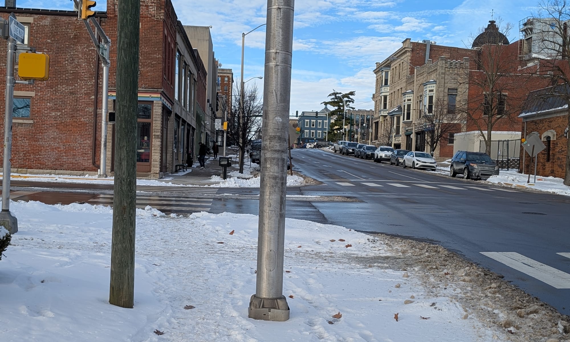 Looking north along the sidewalk next to the government-owned (Bloomington redevelopment commission) south of 4th Street, the sidewalk is still packed with snow. Across 4th Street, the sidewalks have been cleared down to concrete.