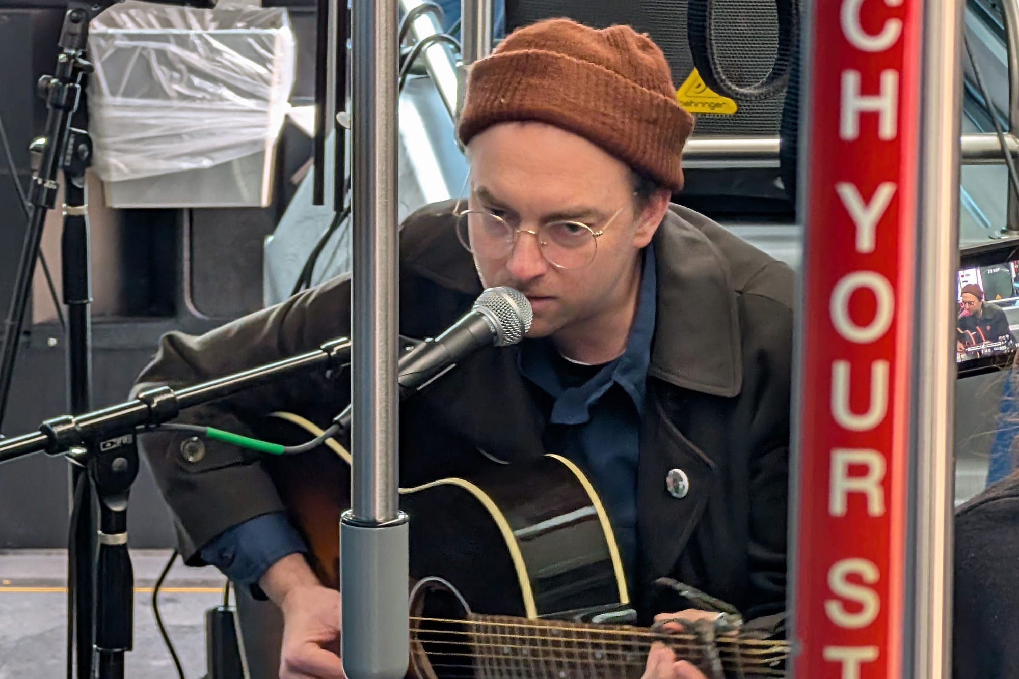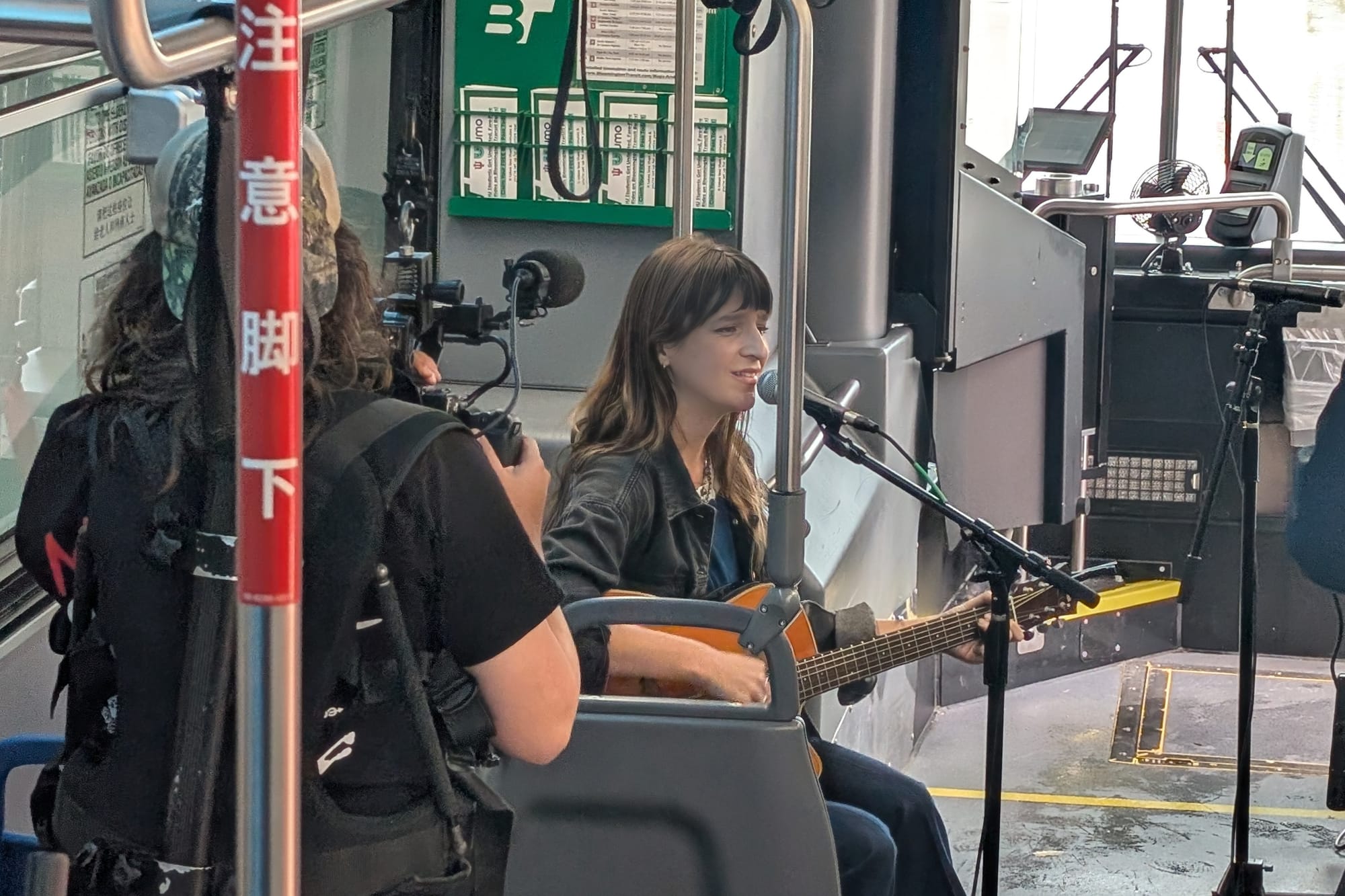 A Bloomington Transit bus is parked in front of WFHB so that Music in Transit and record local artists playing music ... on a bus. Left: Claire Pendreigh Right: David Brown. (Dave Askins, Nov. 21, 2025)