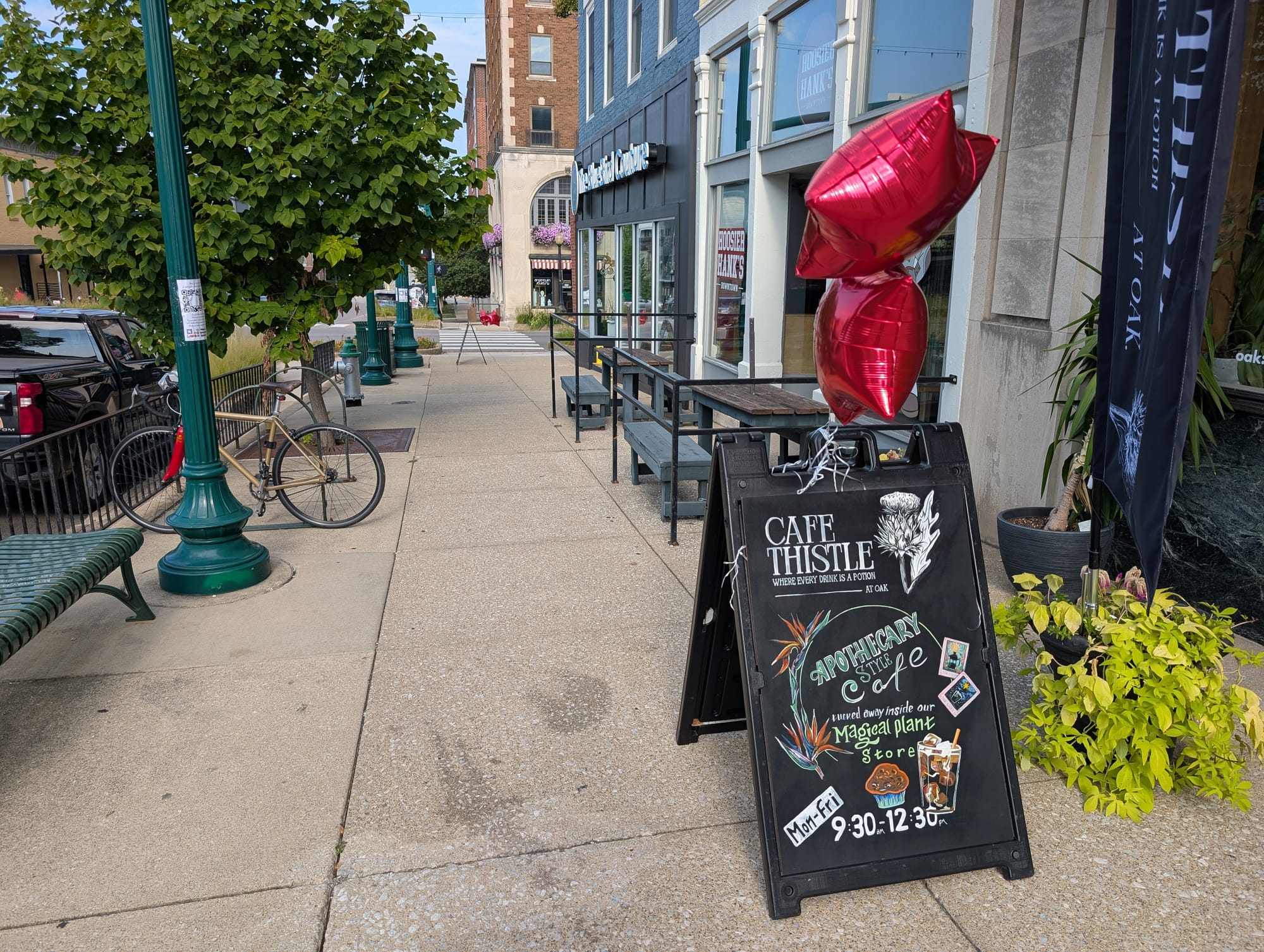 Sandwich board sign for Café Thistle, inside oak. It has a 3-hour window of operation: 9:30 a.m. to 12:30 p.m. Monday to Friday. I confirmed that in addition to drinks there are also cookies and eclairs and other baked items. (Dave Askins, Aug. 19, 2025)