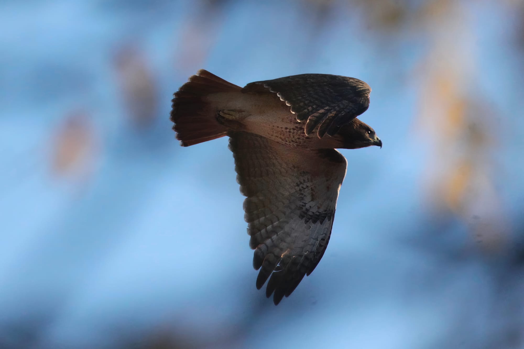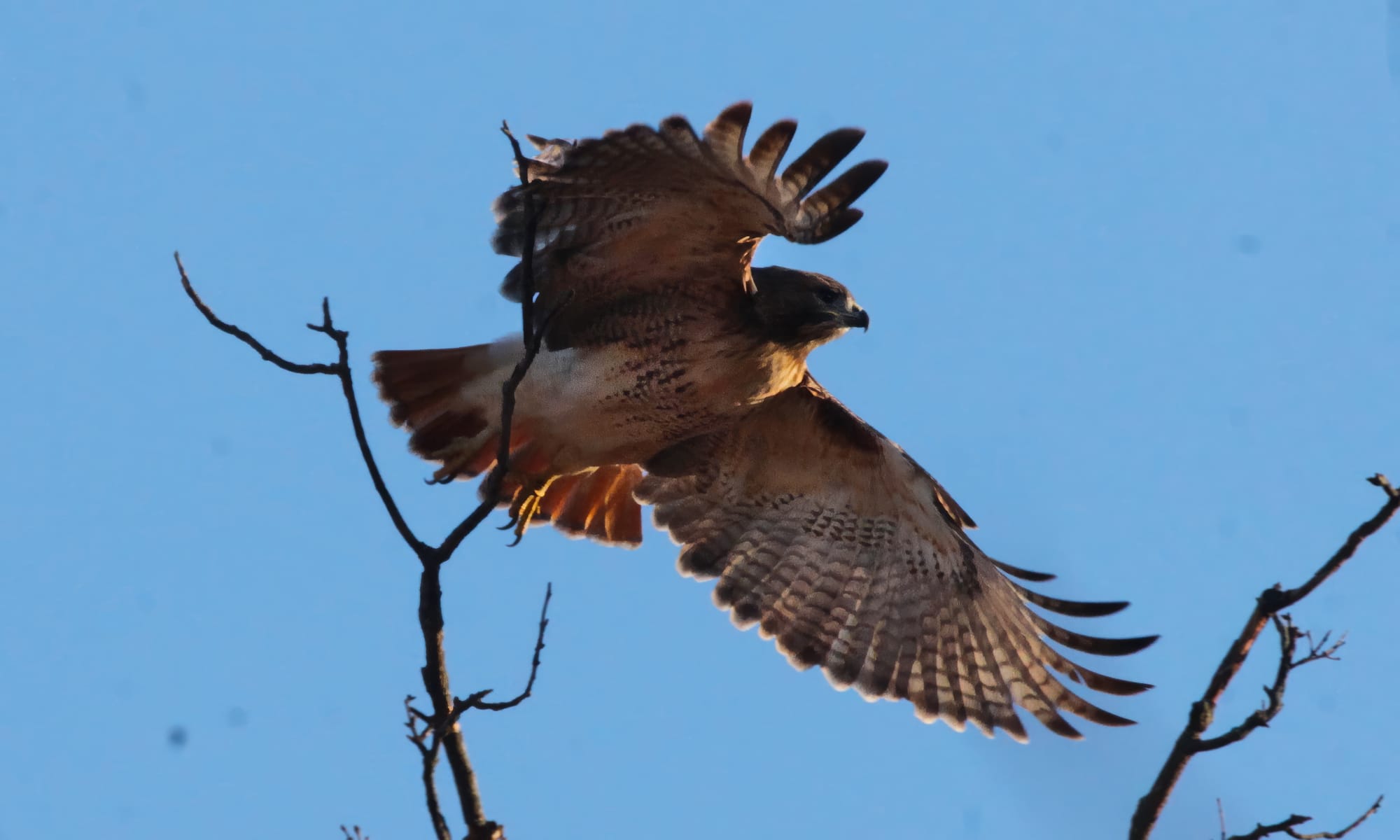 A red-tailed hawk perched on the steeple of the First Presbyterian Church takes a short flight to a tree on the same property, perches for only a minute, then continues on its way.