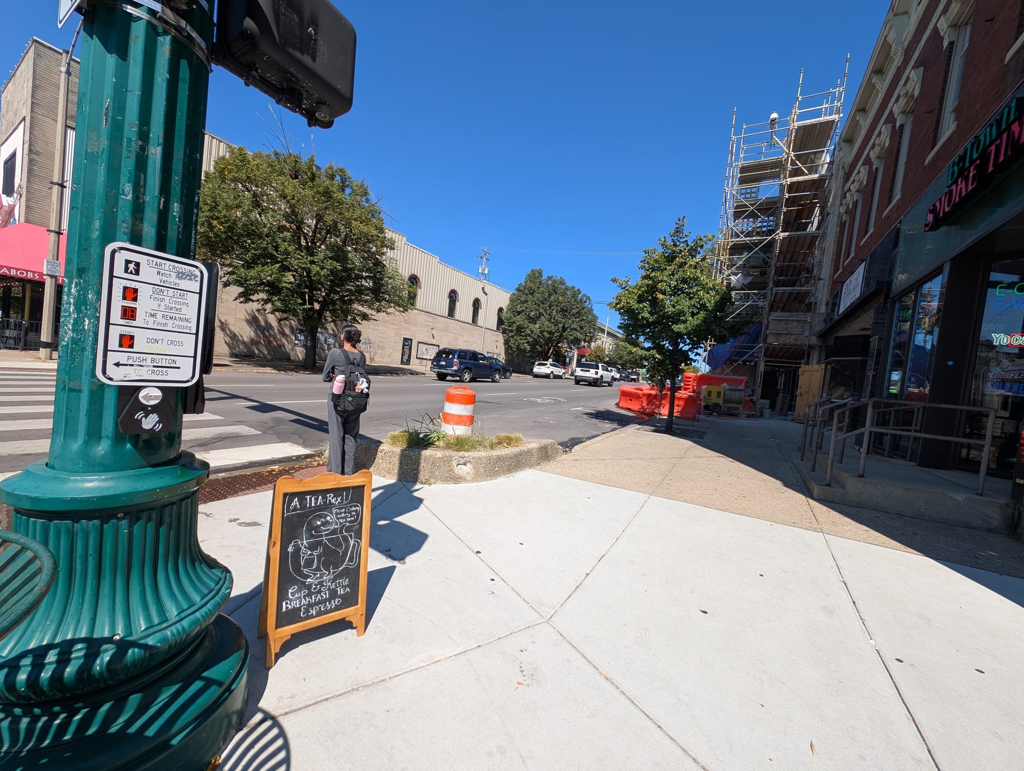 Sandwich board sign for Cup & Kettle says: “A Tea Rex!” with a chalk drawing of a dinosaur. The dinosaur is saying: “Move Oolong, nothing to tea here.” Cup & Kettle is located past the scaffolding—there’s a way to navigate past it along the orange barriers. (Dave Askins, Sept. 8, 2025)