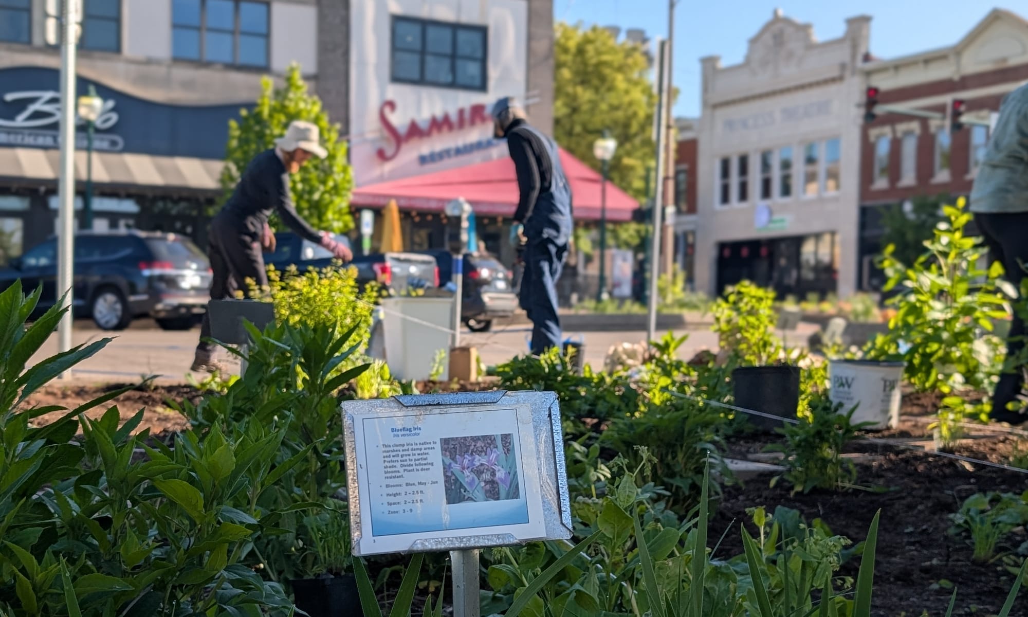 Volunteers are putting new plants into the bed on the grounds of the Monroe County historic courthouse. The work is prompted in part by storm damage, which took out an oak tree in August 2025. The planting is funded in part by a $1,500 grant from the Monroe County Master Gardeners. In addition to replacing damaged plants, the new scheme uses a different mix of sun-tolerant species for the bed, which is now out of the shade of the oak tree. Plants include milkweed to support monarch butterflies. (Dave Askins, April 30, 2026)