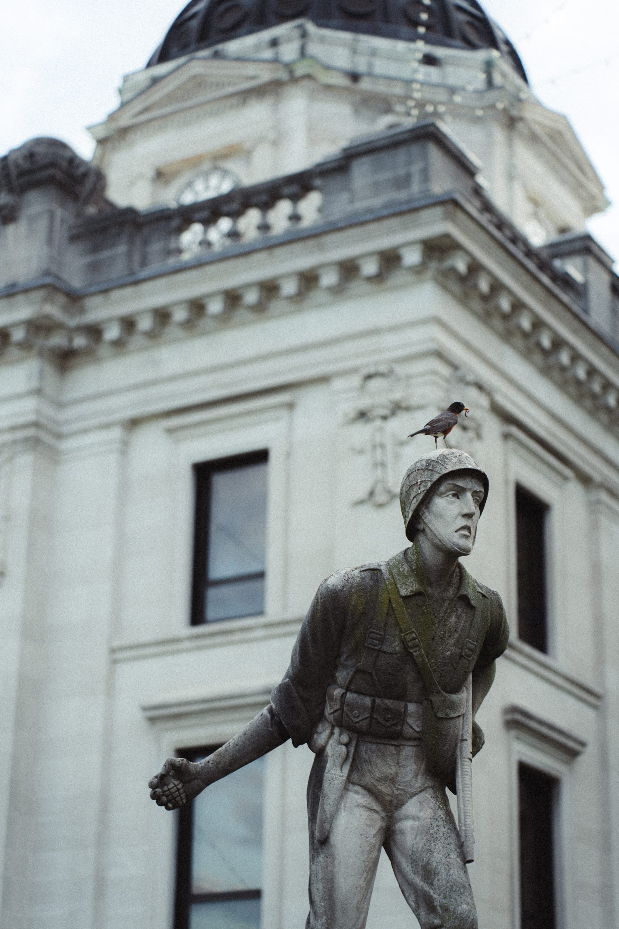 A bird with a worm in its beak is perched on a statue on the northeast corner of the Monroe County courthouse.
