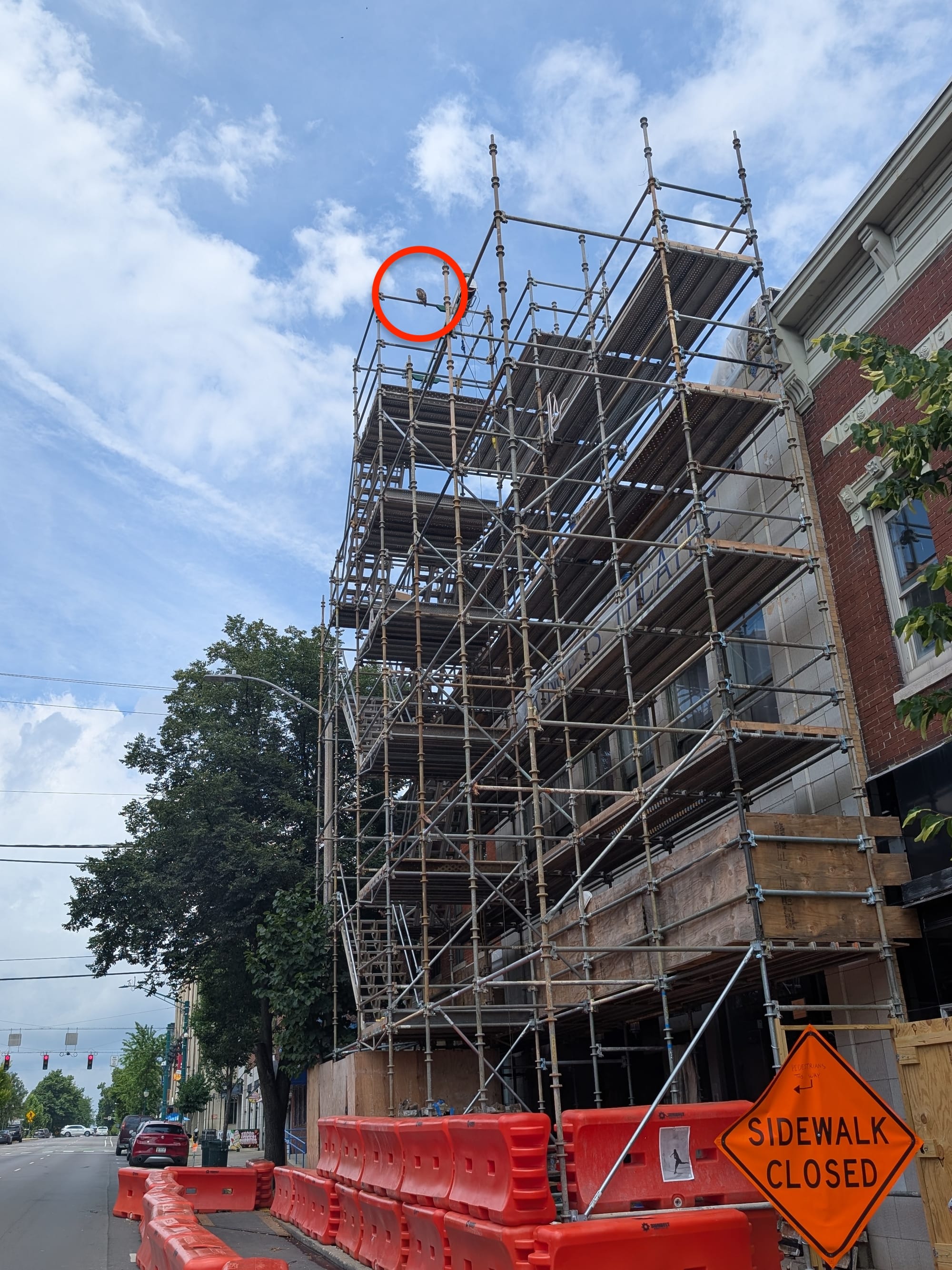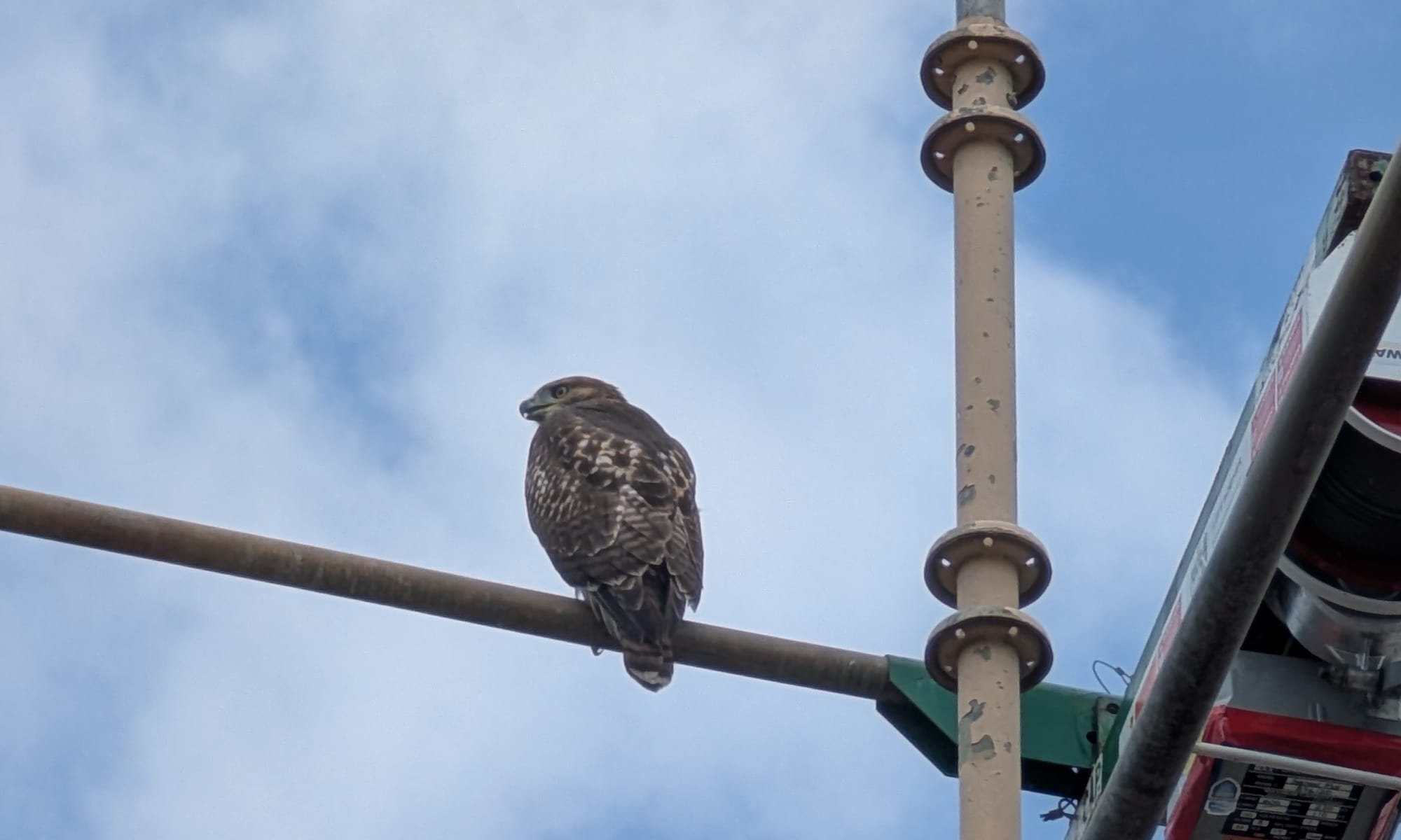 One of the juvenile red-tailed hawks that made it out of the nest in the big pine tree at the corner of the courthouse grounds at College Avenue & 6th Street is sitting on the scaffolding that has been set up for the Princess Theater facade repair.
