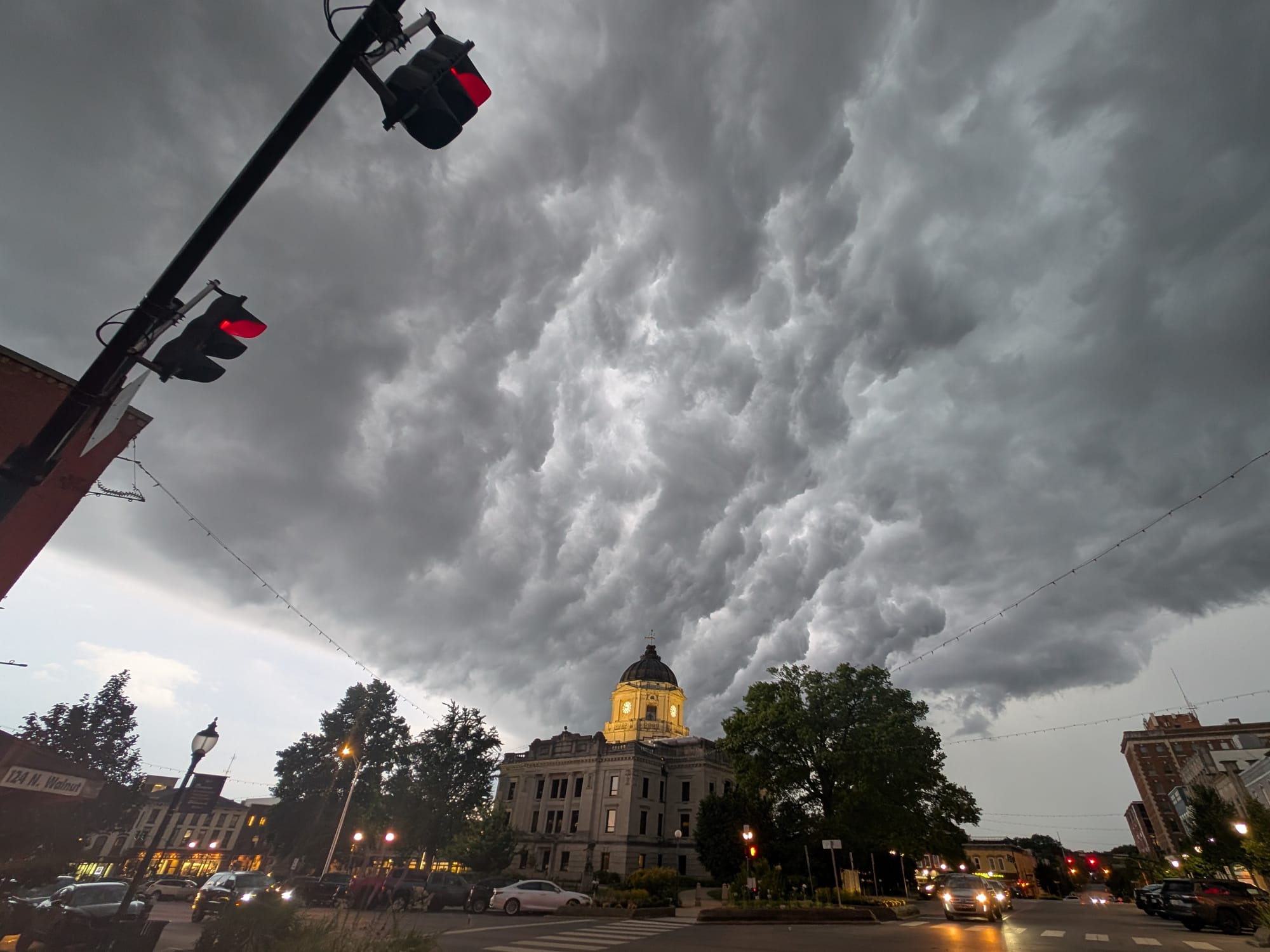 B There 6th Street & Walnut Street Stormy-looking clouds backdropping the Monroe County courthouse dome, looking southwest. Stormy-looking clouds backdropping the Monroe County courthouse dome, looking southwest. (Dave Askins, July 16, 2025)