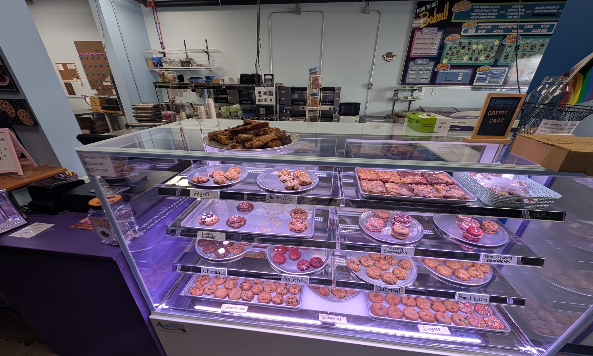 Display case at Baked! filled with cookies of all kinds and flavors. Baked! is back after a three-month hiatus due to a water pipe failure.
