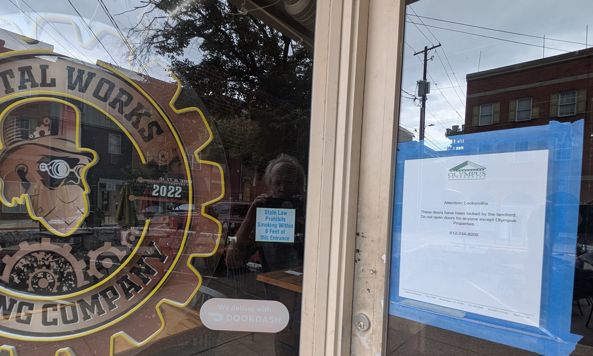 Metal Works Brewing Company is dark. The sign taped to the door reads: “Attention: Locksmiths | These doors have been locked by the landlord. Do not open doors for anyone except Olympus Properties.”
