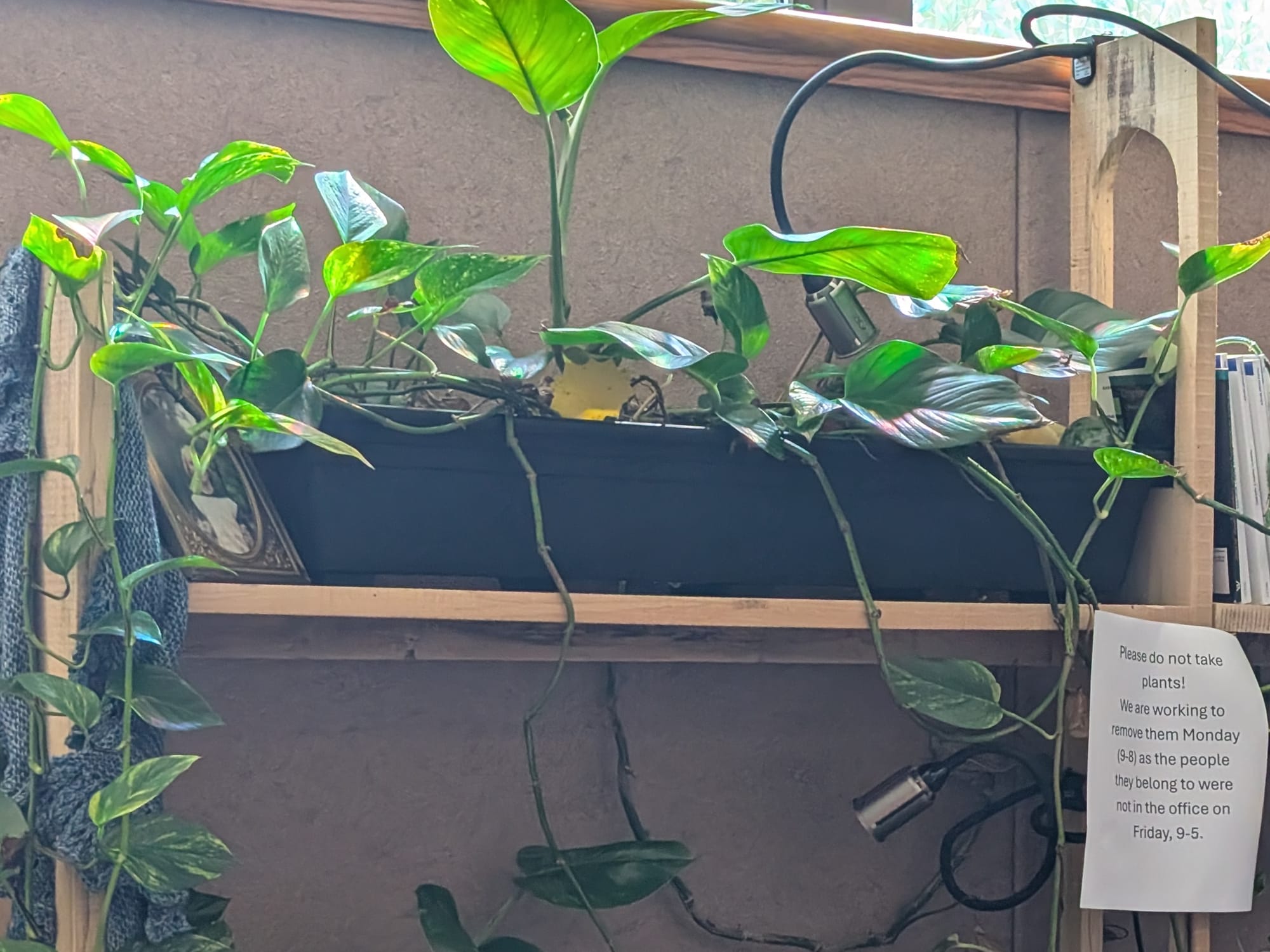 Plants in Monroe County circuit court judge Catherine Stafford’s office. This confirms what she wrote in a Facebook post, namely that plants in her office are available free for the taking. County commissioners have given justice building employees until the end of the day today to have all plants removed as a mold-prevention measure. (Dave Askins, Sept. 8, 2025)