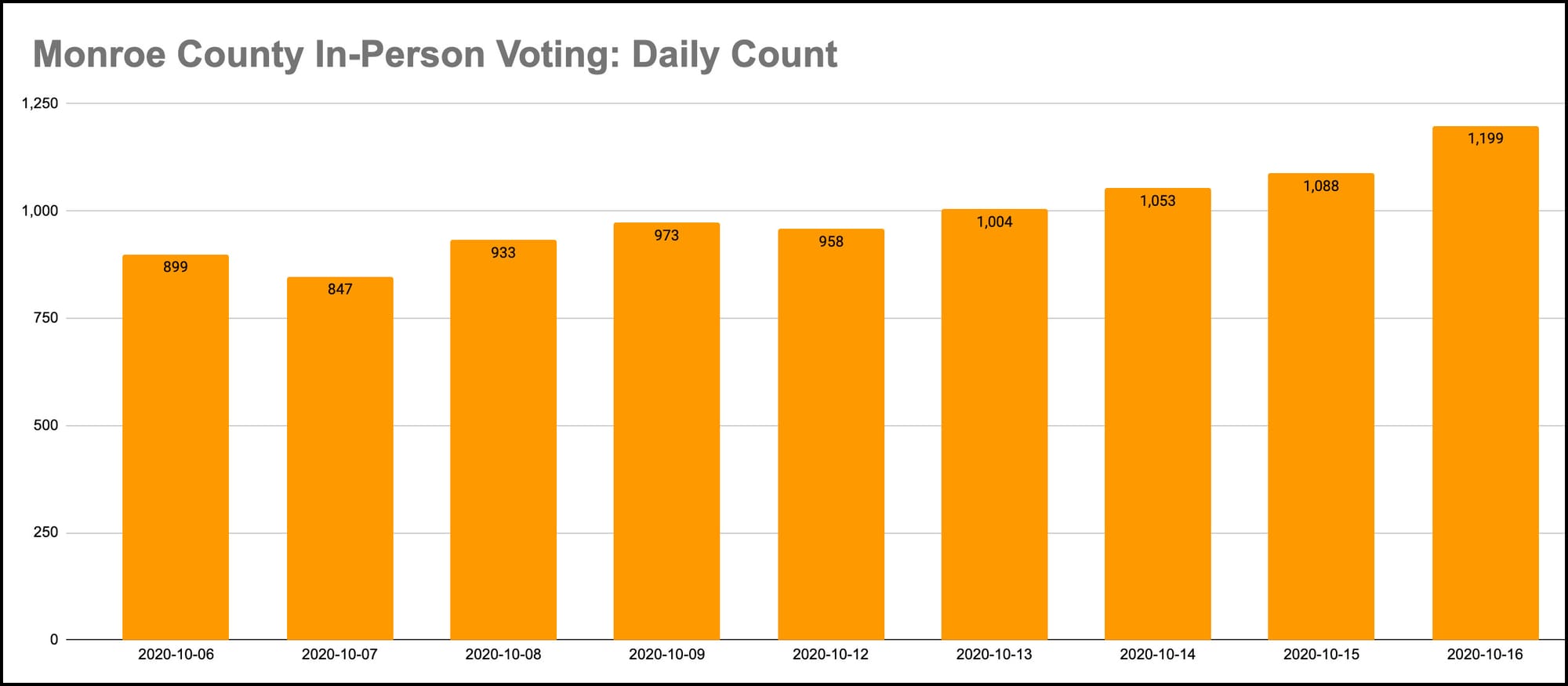 The tally of early voters in Monroe County on Friday was 1,199. That was the fourth day in a row that set a new daily high.