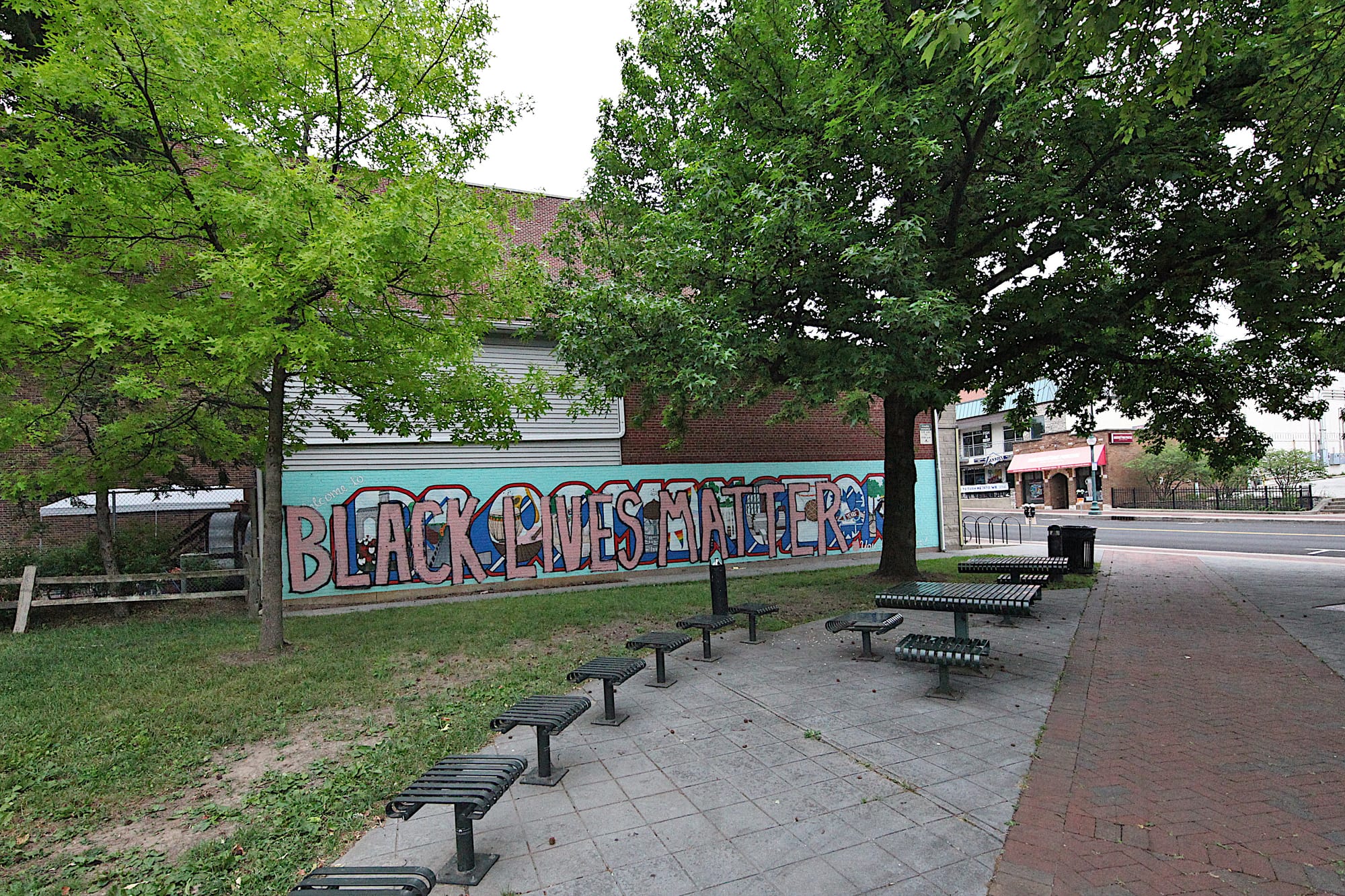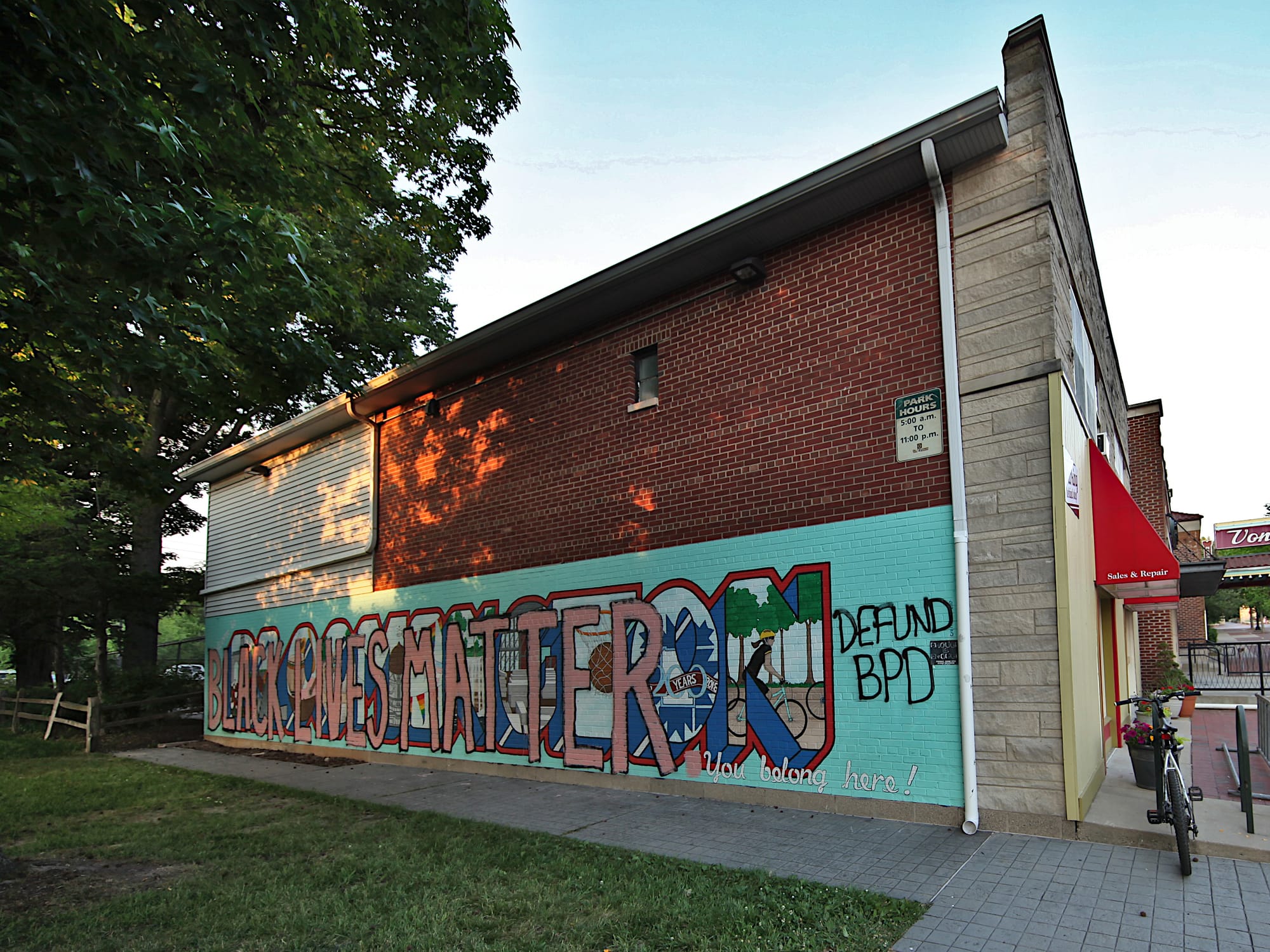 Other have commented on the fact that the letters seem to reflect thoughtful, intentional choices. They’re wedged between the existing text, which is left uncovered: “Welcome to” in the upper left and “You belong here!” in the lower right. The mural now reads in sum: “Welcome to BLACK LIVES MATTER you belong here!” The shapes of the letters seem to echo the shapes in the letters of the word “Bloomington” in the original mural.