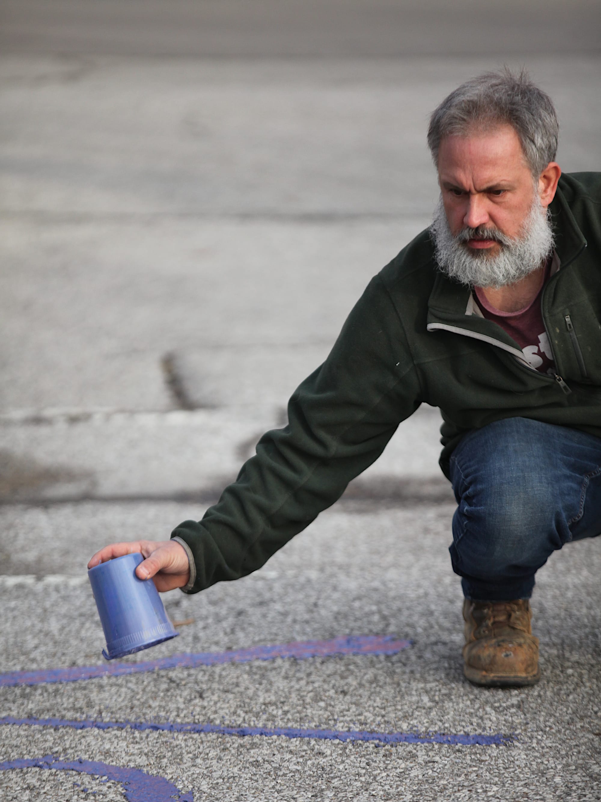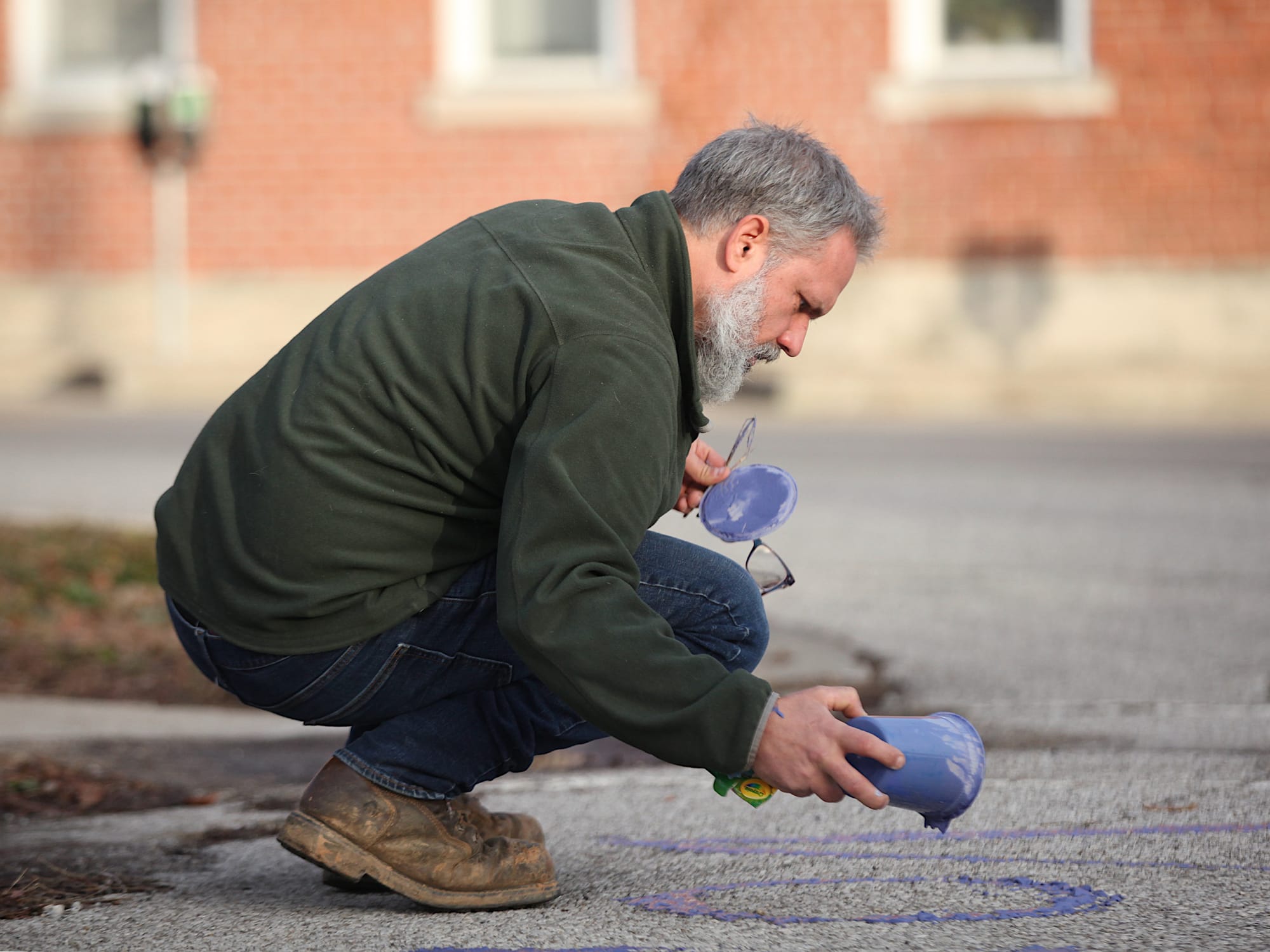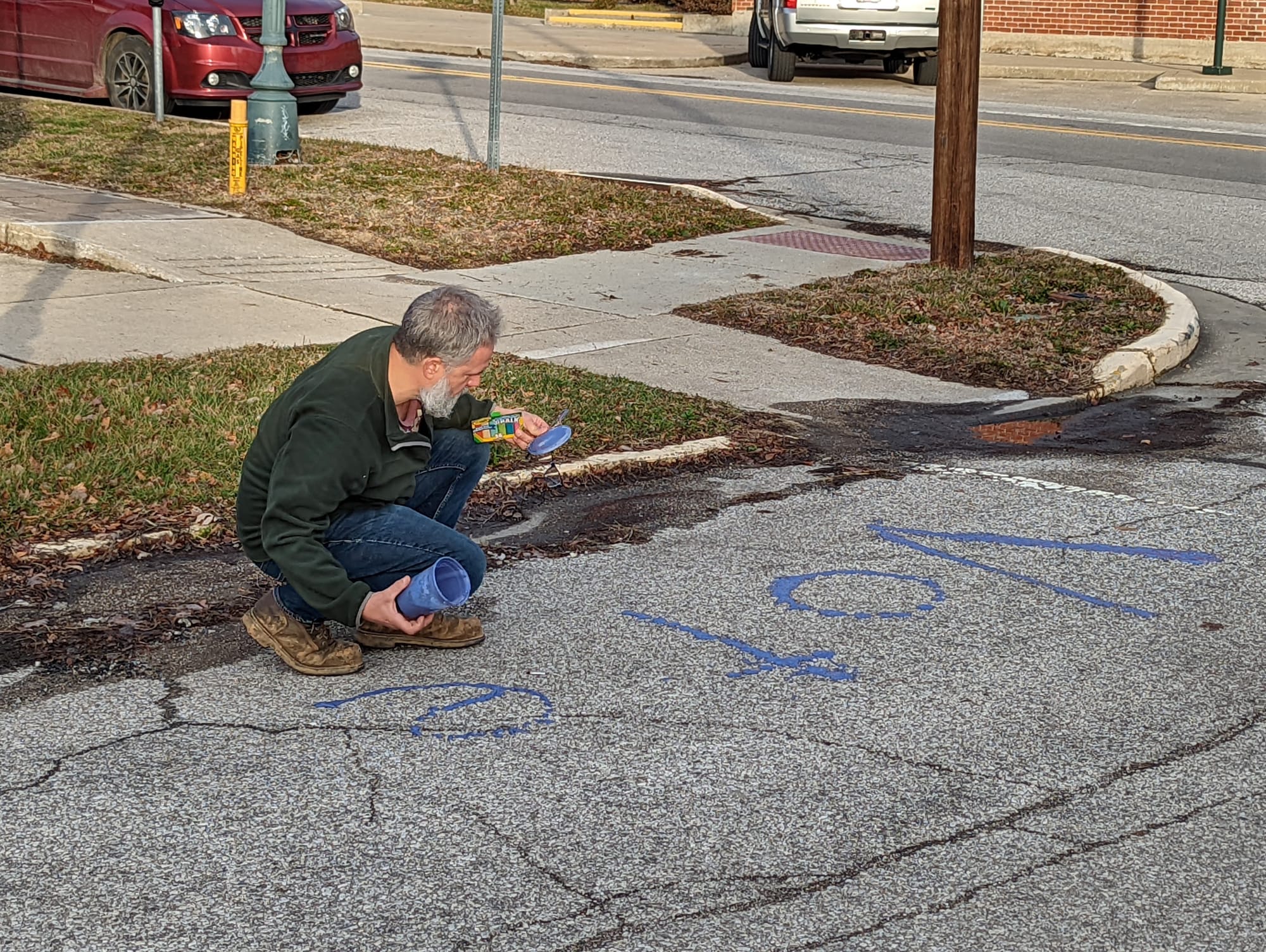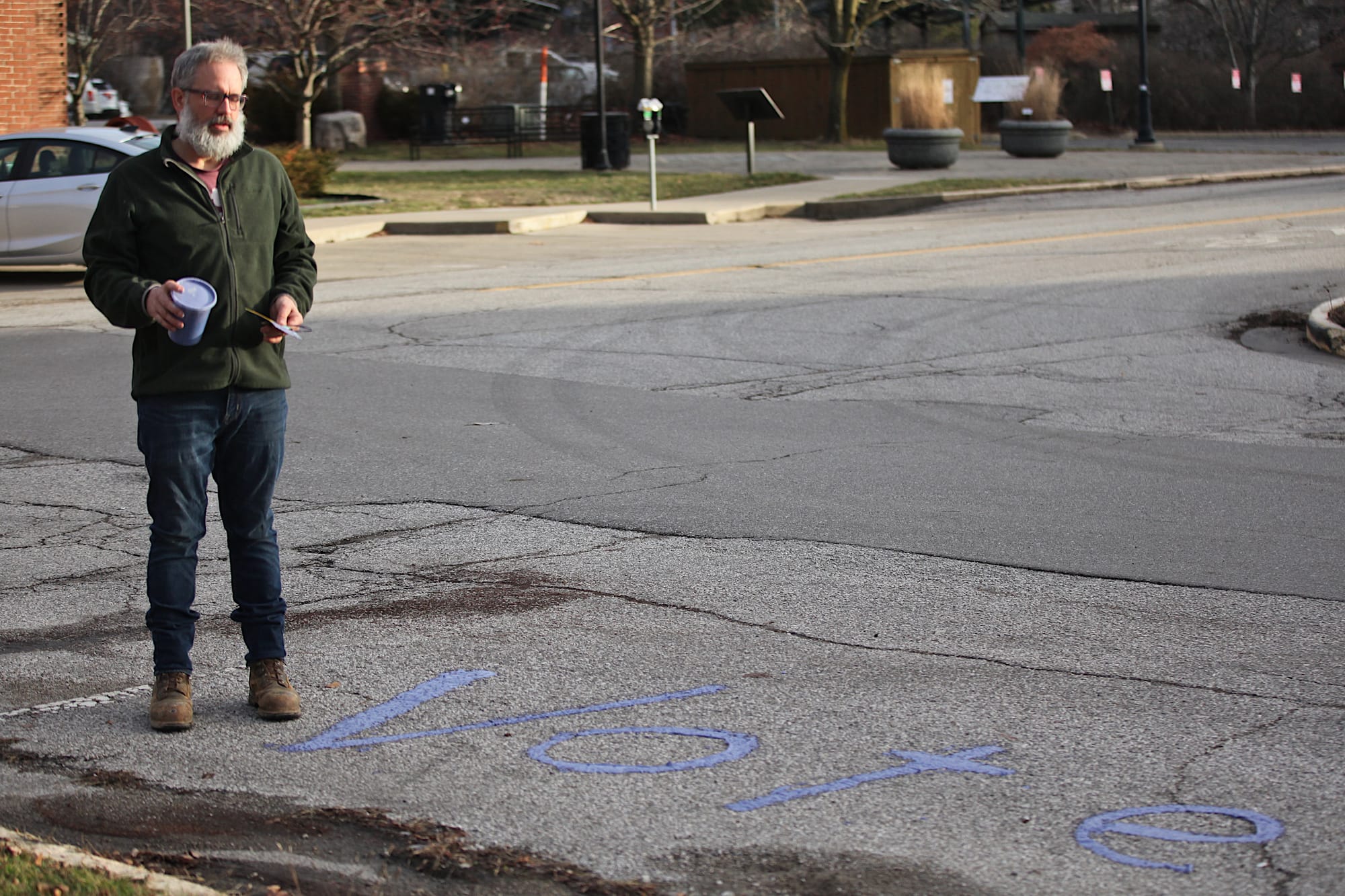 Around 9 a.m. on Wednesday morning, Bloomington area resident Thomas Westgård started dolloping a purple compound onto the asphalt at 7th and Madison streets near Monroe County’s Election Central.