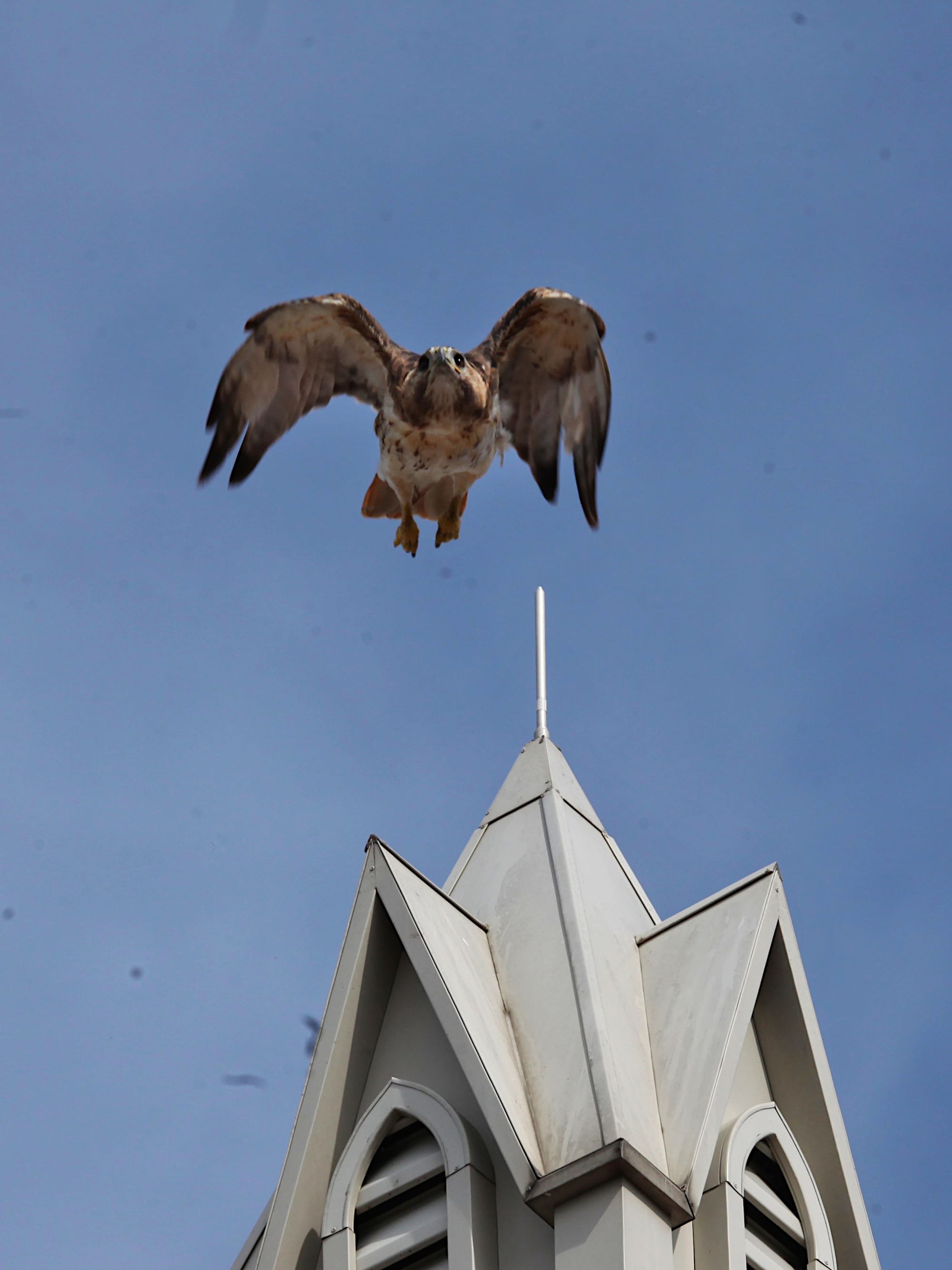 Red-tailed hawk at First Presbyterian Church, 6th & Lincoln (July 29, 2022).