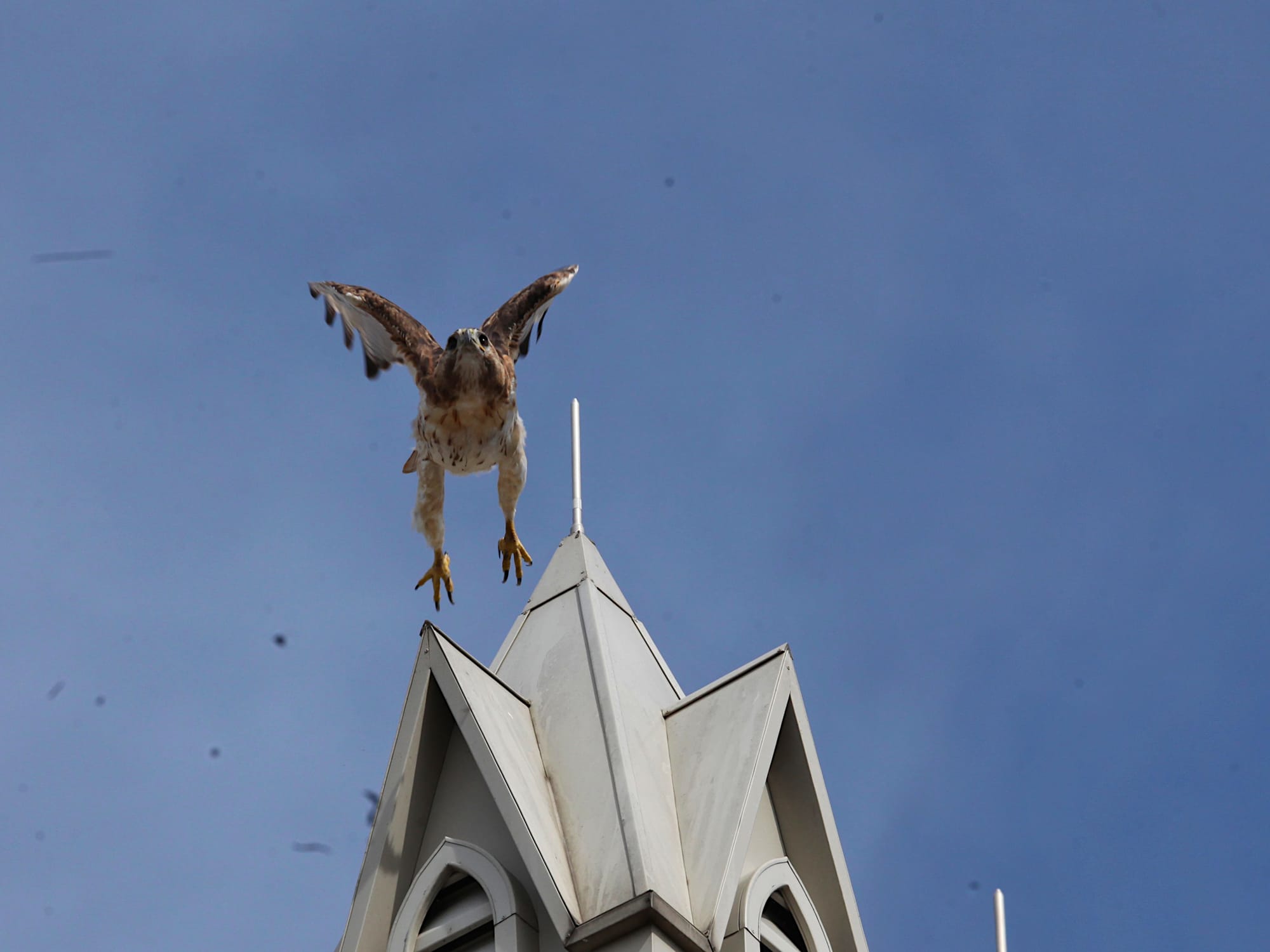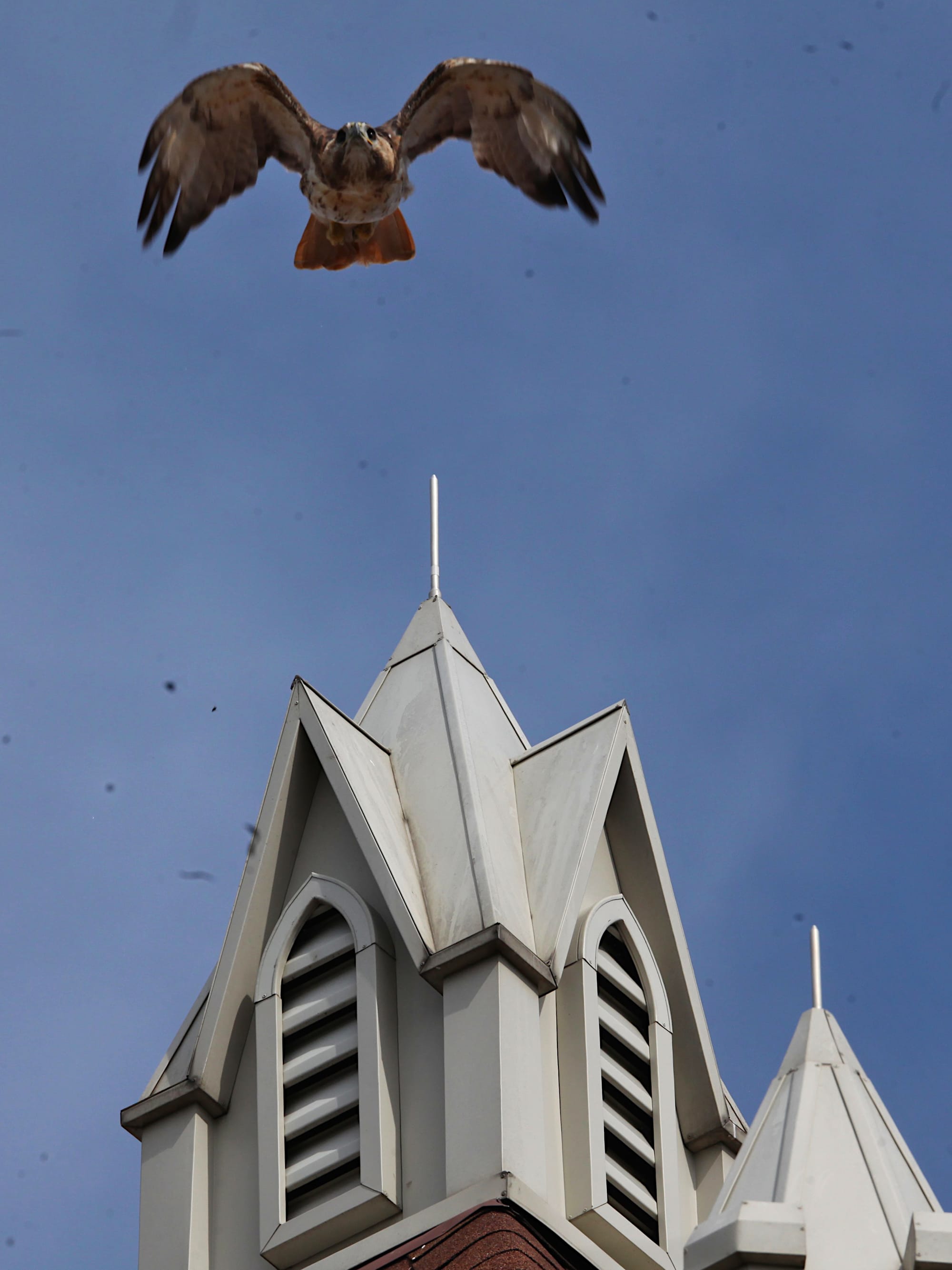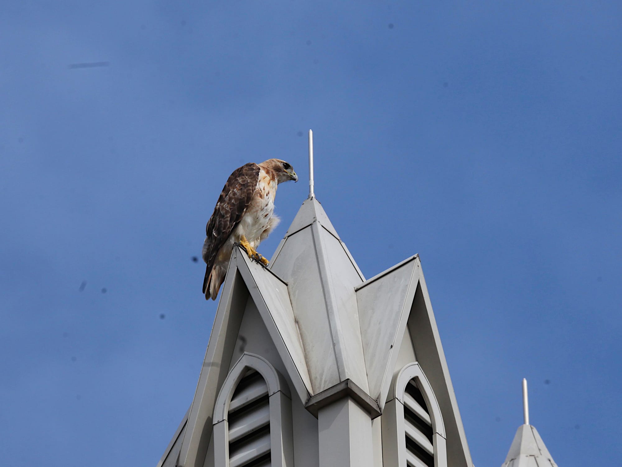 The steeple of the First Presbyterian Church at 6th and Lincoln streets is a favorite perch of a red-tailed hawk. Another favorite place for red-tailed hawks: The fish-shaped weather vane on top of the Monroe County courthouse.