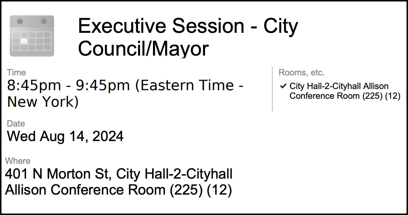 Next Wednesday’s executive session  is set to start at 8:45 p.m. The late hour stems from the fact it will follow a “consensus building activity” that the city council has scheduled to address the issue of street homelessness.