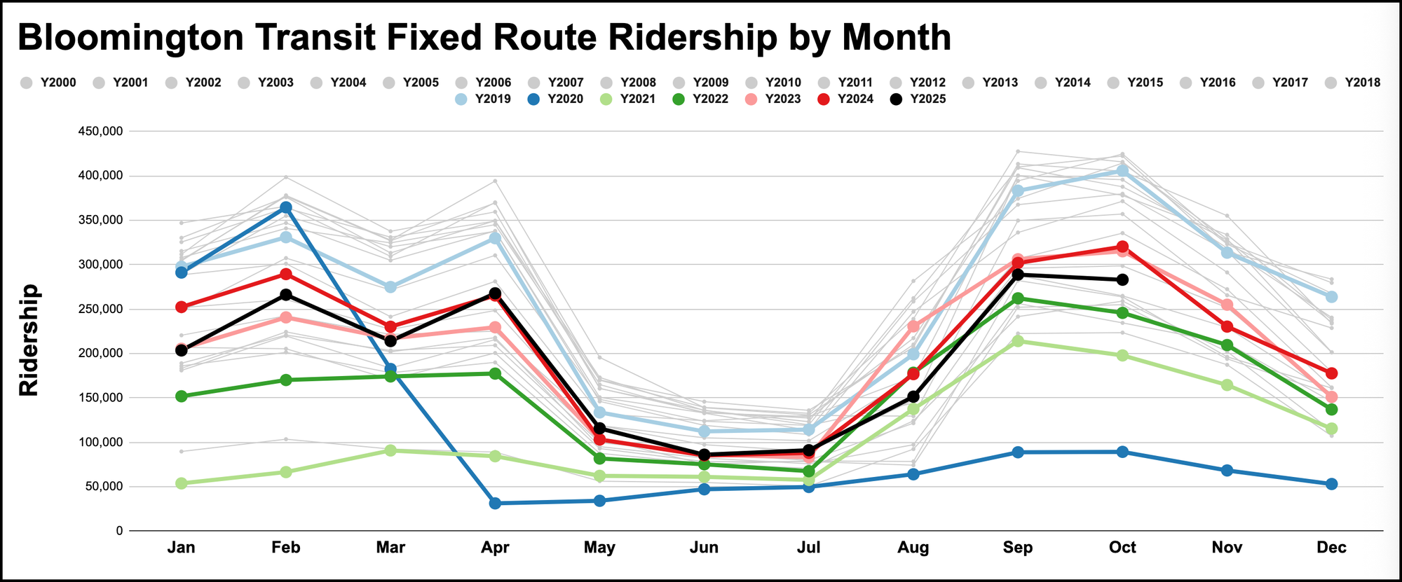 Ridership on Bloomington Transit’s fixed route bus service for October this year was 283,019 trips, down from 320,372 in October 2024—which is an 11.5% drop. That adds to a year-to-date slide, which now stands at 6.9% fewer rides compared to 2024. The raw numbers this year are still shy of 2 million rides, at 1,967,877, compared to 2,113,358 rides from January to October of 2024.
