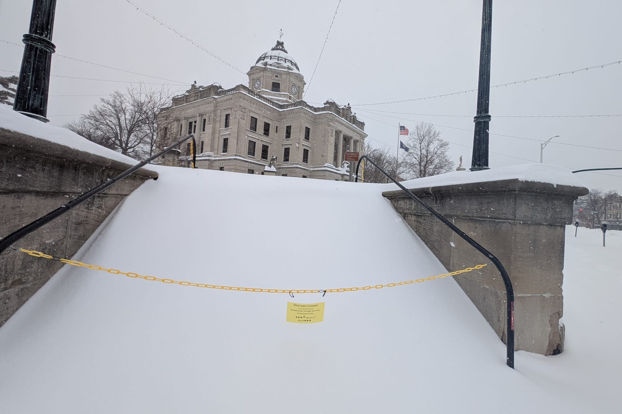 Heavy snowfall has prompted many closures and delays across Bloomington. The city has suspended regular trash pickup starting Monday, while MCCSC canceled school and eLearning. The College Avenue skywalk closure is delayed a day, and travel remains restricted under a county “Warning.”