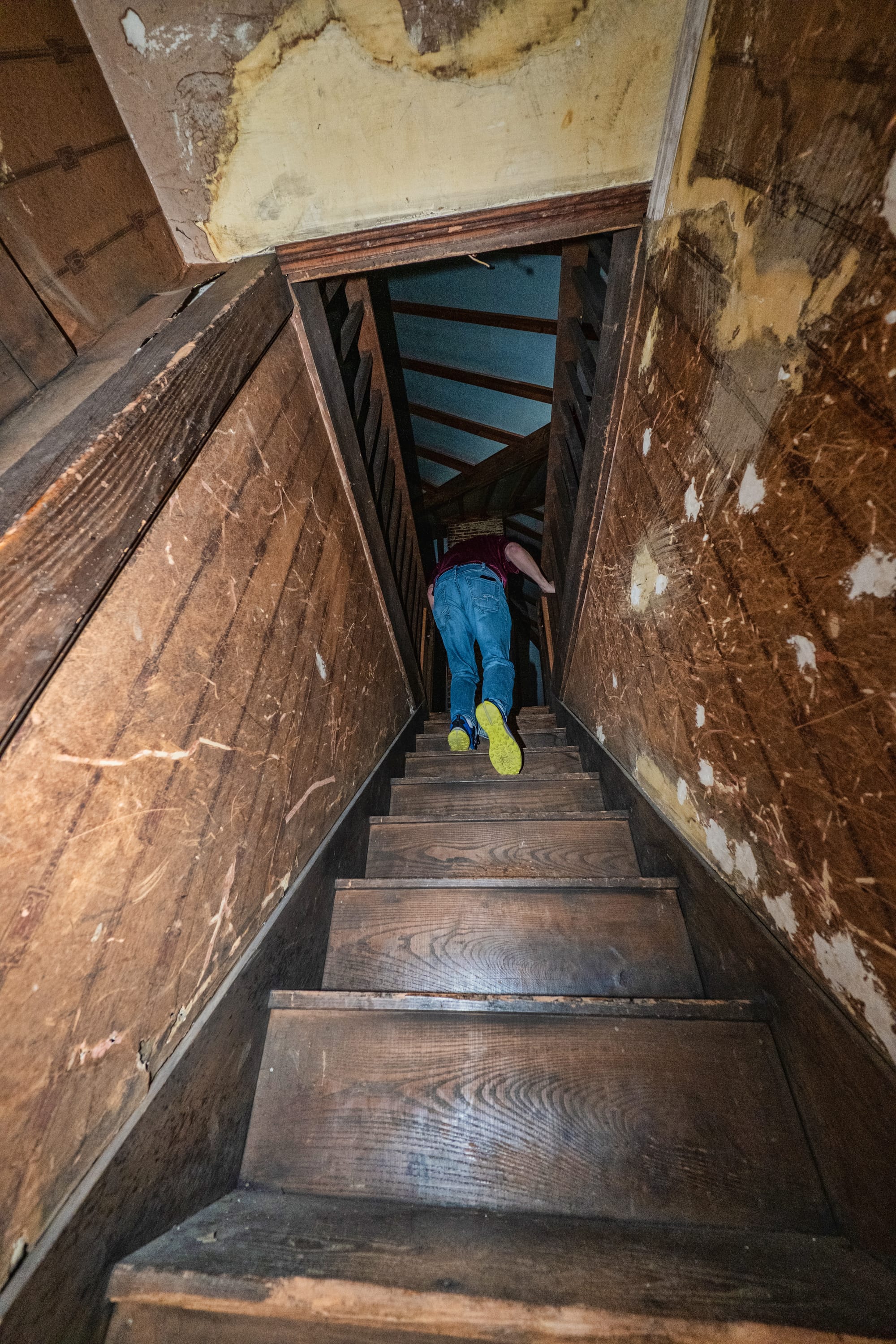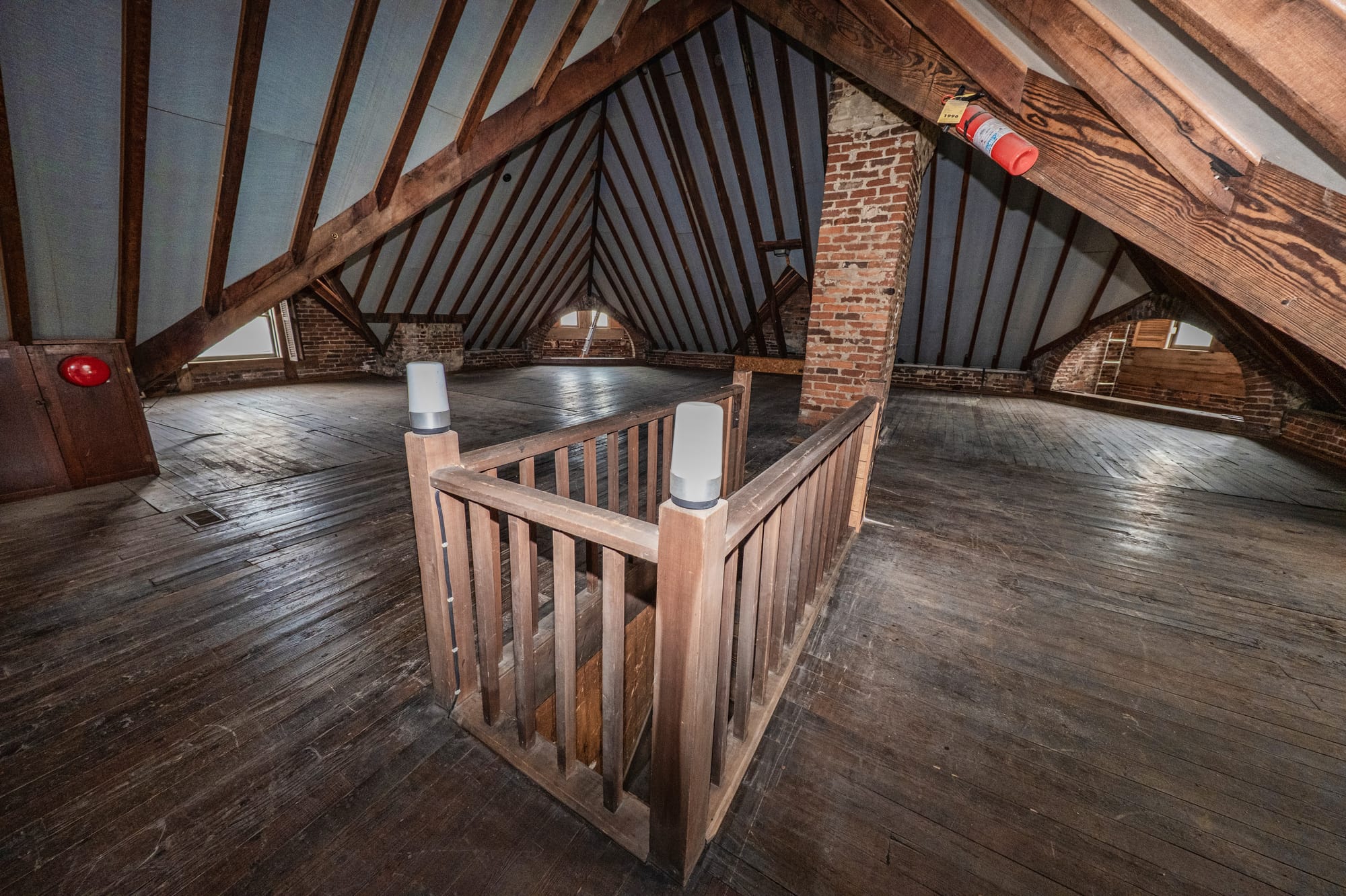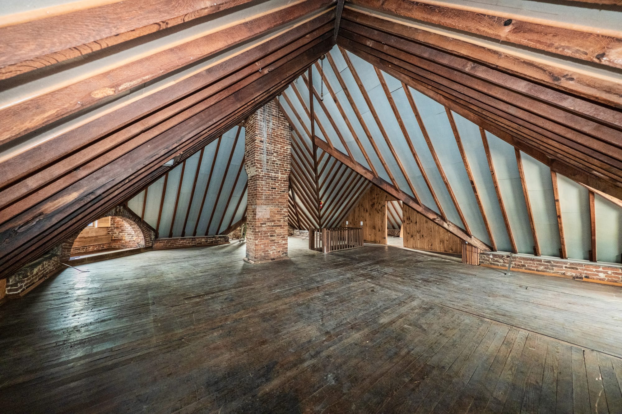 According to the summary from Estate & Downsizing Specialists, prepared for the auction, The Batman House contains about 4,000 square feet of finished space across the first two floors, with basement and attic space estimated at roughly 1,780 square feet each, making the total area up to 8,000 square feet. The attic is one of the house’s most distinctive spaces, with exposed roof framing and turret towers rising nearly 18 feet above the floor.