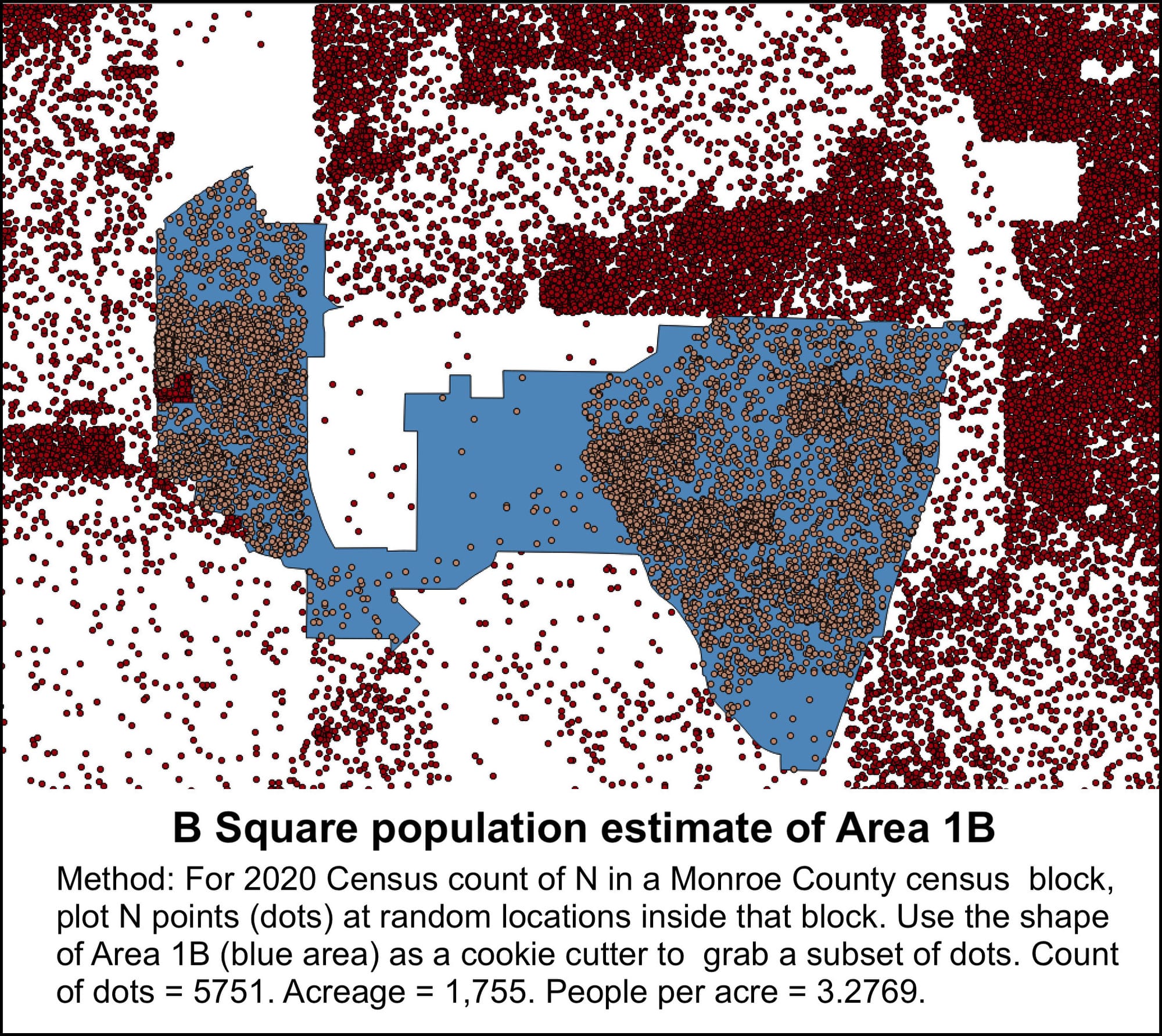 The shape of Area 1B was used as a “cookie cutter” to grab a subset of dots. The count of dots was 5,751. When spread across 1,755 acres, that works out to an estimated population density of 3.2769 people per acre, which matches Bloomington’s number, when rounded to the nearest hundredth.