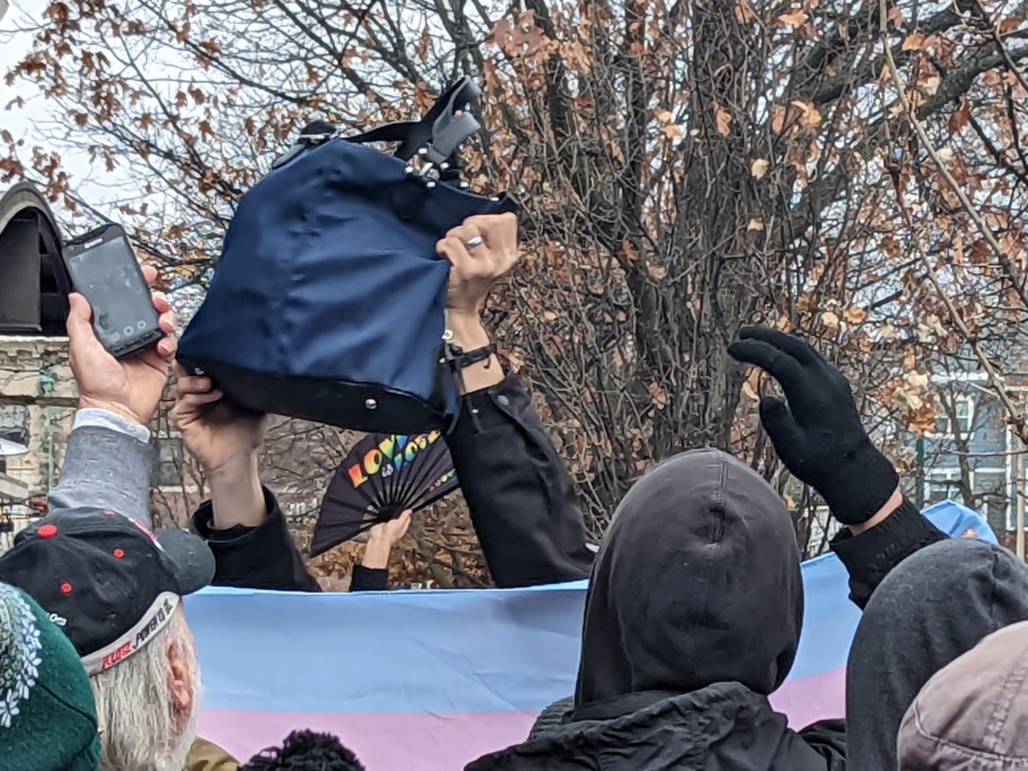 Their attempts to film a drag queen who came outside to thank supporters were thwarted—when supporters formed a phalanx around her and held flags or bags high, to block any sight lines from smartphones held aloft.