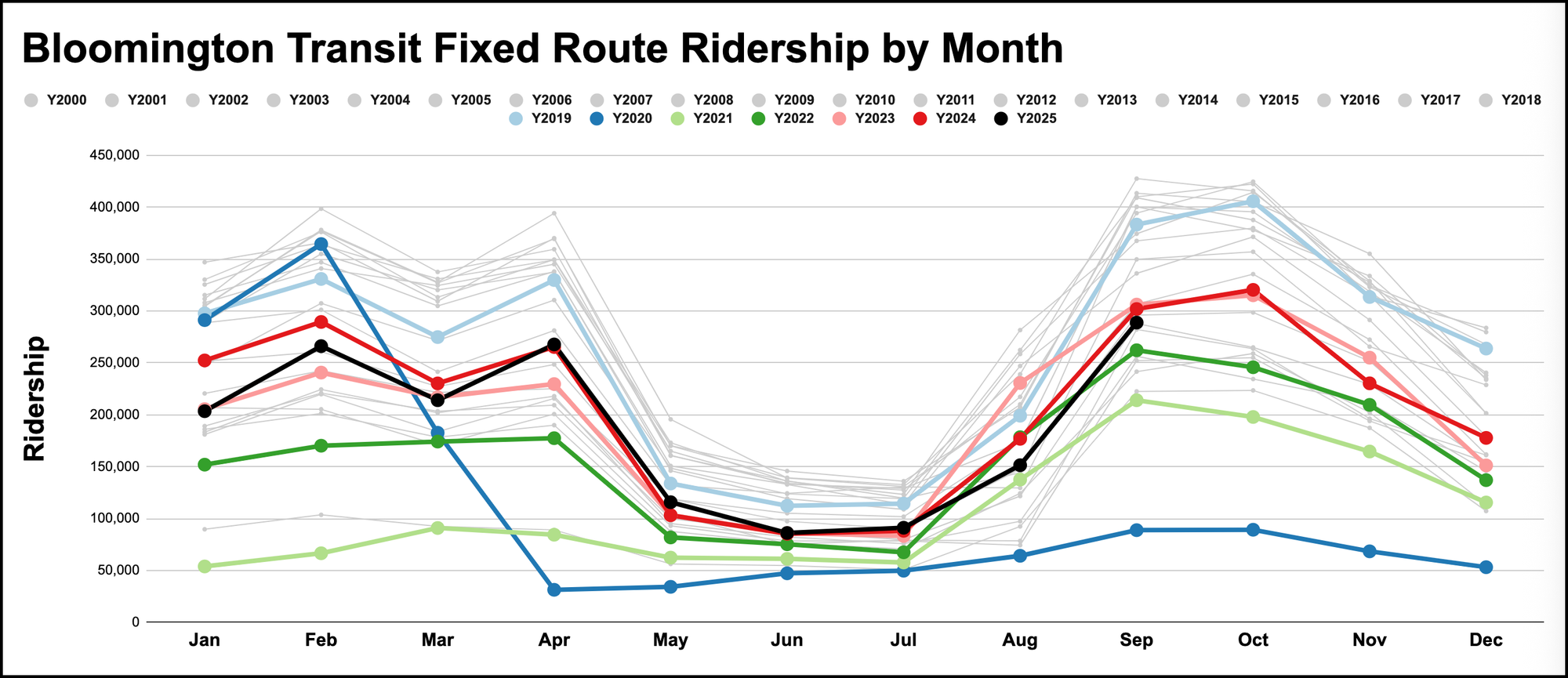 Certain routes, such as 1, 7, 9, 11, and 14, saw drops in particular, Fyalkowski said. Board members asked about factors likely contributing to these declines—which included severe winter weather early in the and recent changes in route alignments. In particular, alterations to Route 9, which no longer includes Indiana University’s Tulip Tree Apartments, might have influenced overall patterns, Fyalkowski said. At the same time, Indiana University’s campus bus system has seen ridership gains, which appear to correspond with some of the decreases seen on overlapping city routes.