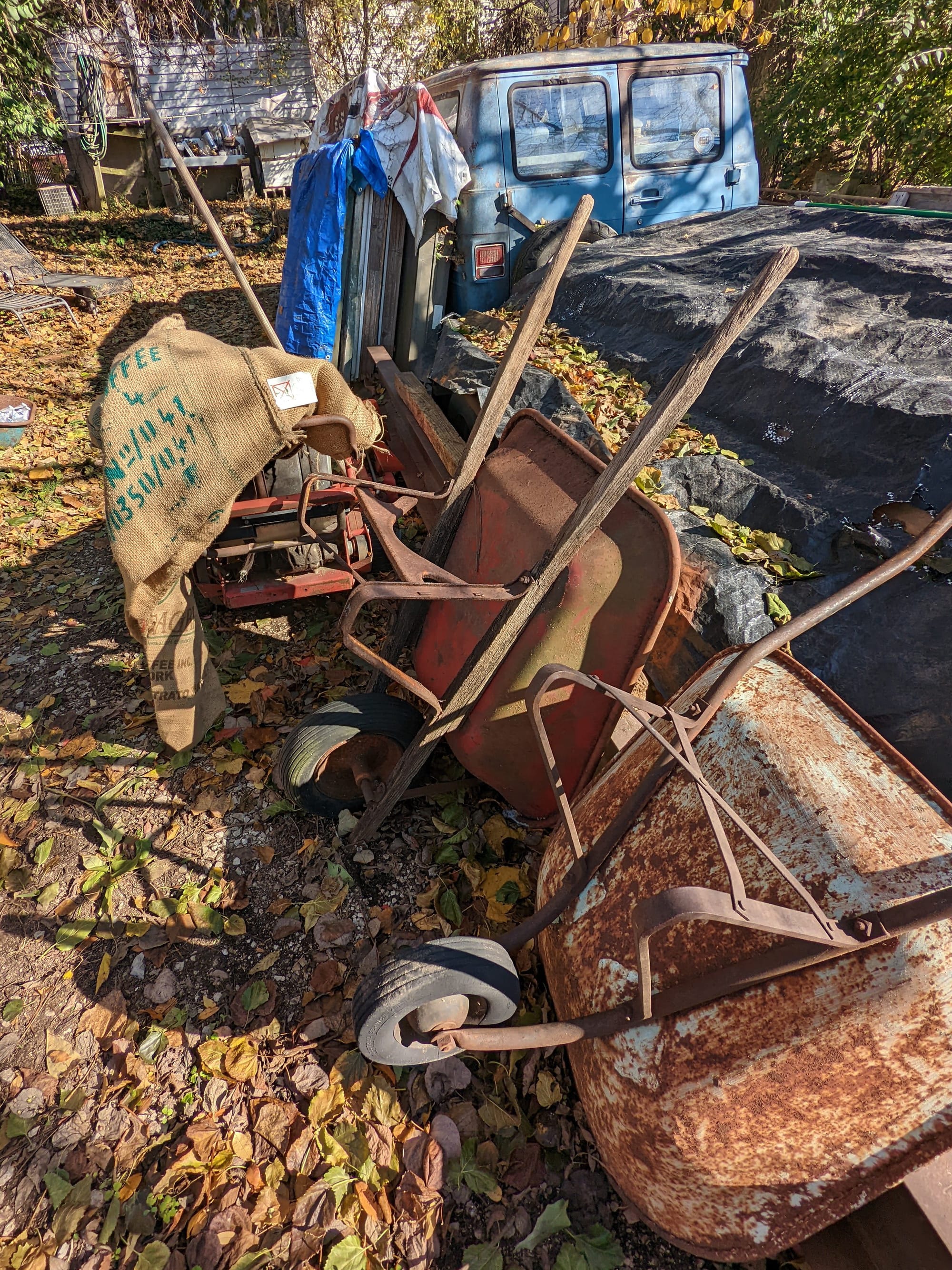 Parked in Joe Davis’s backyard at 530 S. Washington Street are three vehicles and a trailer that have various materials stacked on them. Stacked outside in other places in the backyard, and on Davis’s front porch, are more materials.