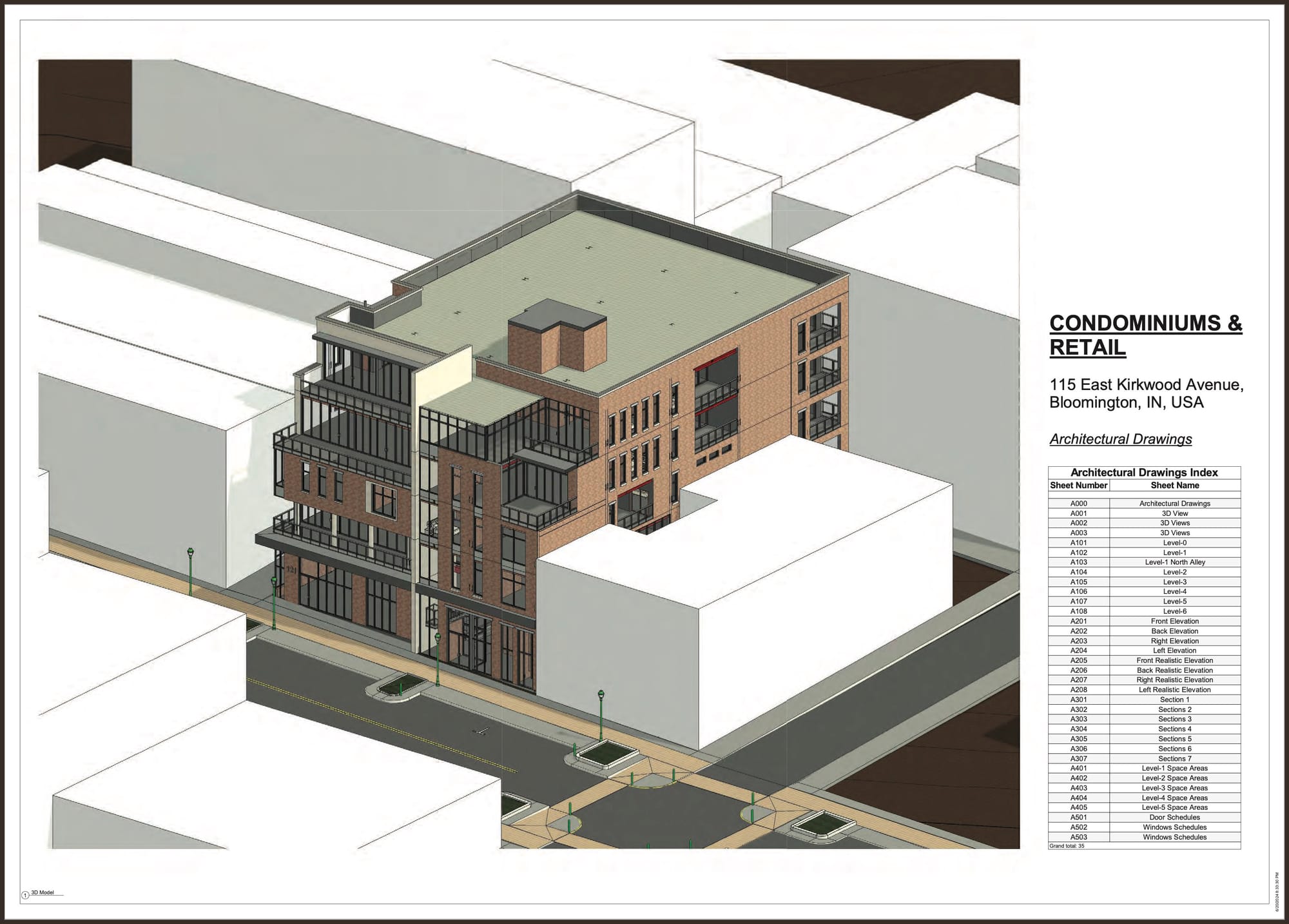 The ONE15 project, which is now named after the Kirkwood address, is proposed by Randy Lloyd (Clearpath Services). It appears on next Thursday’s (July 25) agenda for Bloomington’s board of zoning appeals (BZA).