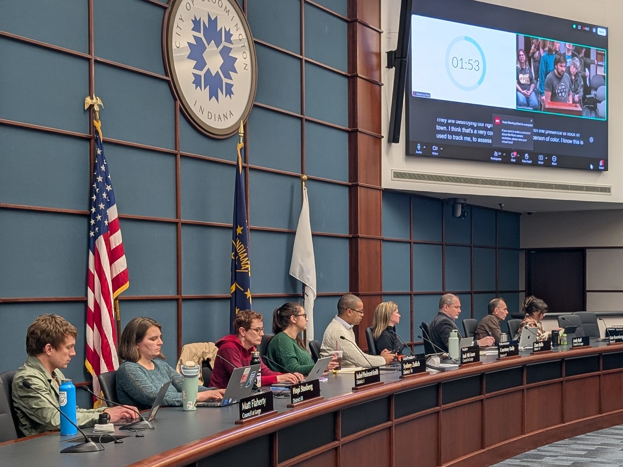 The Bloomington city council voted 9–0 Wednesday to adopt a resolution addressing the city’s use of Flock automated license-plate reader cameras, after more than 30 speakers spoke from the public mic. The measure asks the mayor for a public briefing and detailed information about the program.