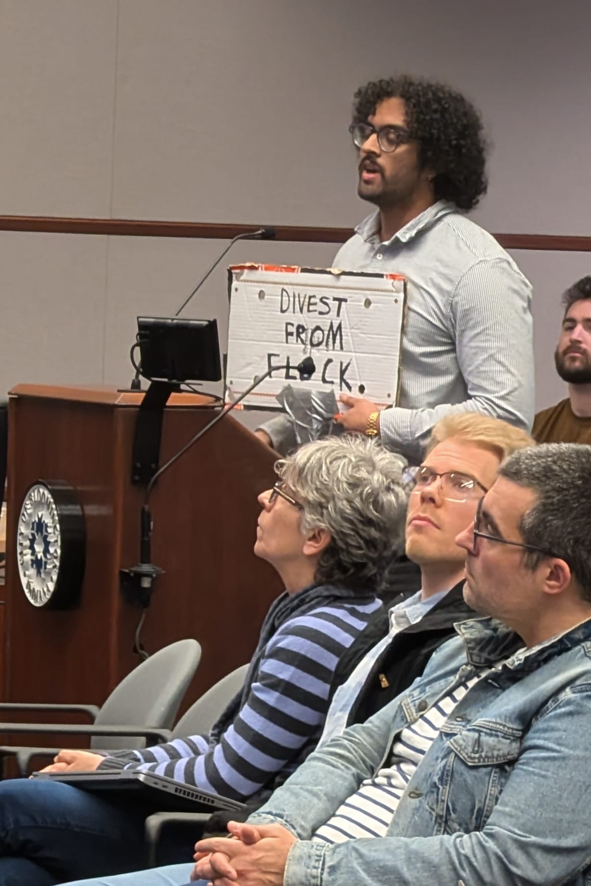 Left: Bloomington’s city council listens to comment from the public mic on a resolution about automatic license-plate reader techology. Right: From the public mic, a speaker holds a hand-lettered cardboard sign that reads "Divest from Flock" as he delivers comments in support of the resolution.
