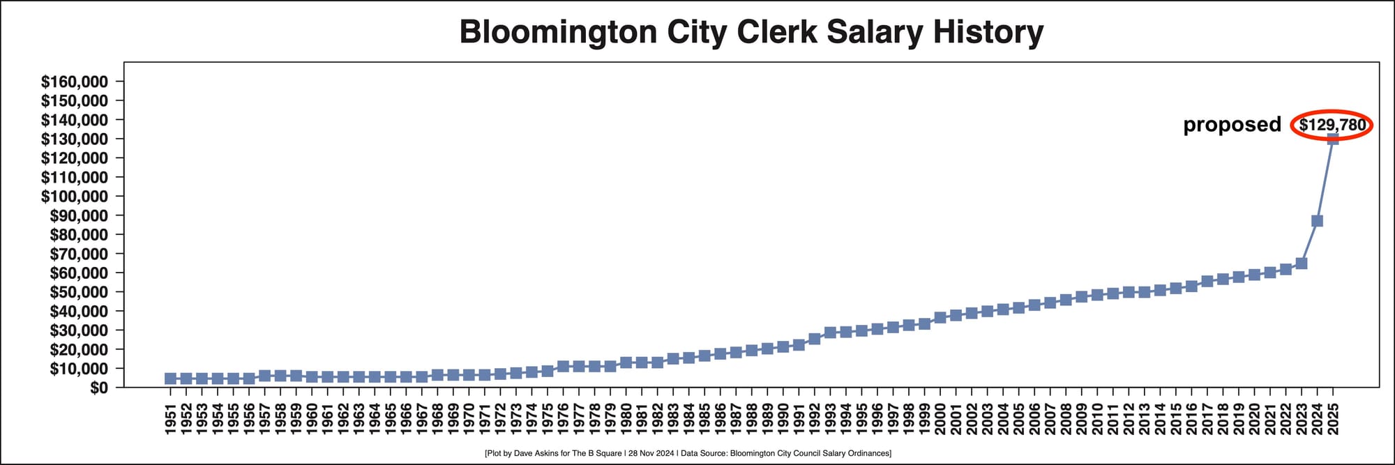 The committee’s proposal would also give the position of city clerk a significant increase, about 50-percent, from $87,000 this year to $129,780 in 2025. That follows a 34-percent increase from $64,773 in 2023 to this year’s figure.