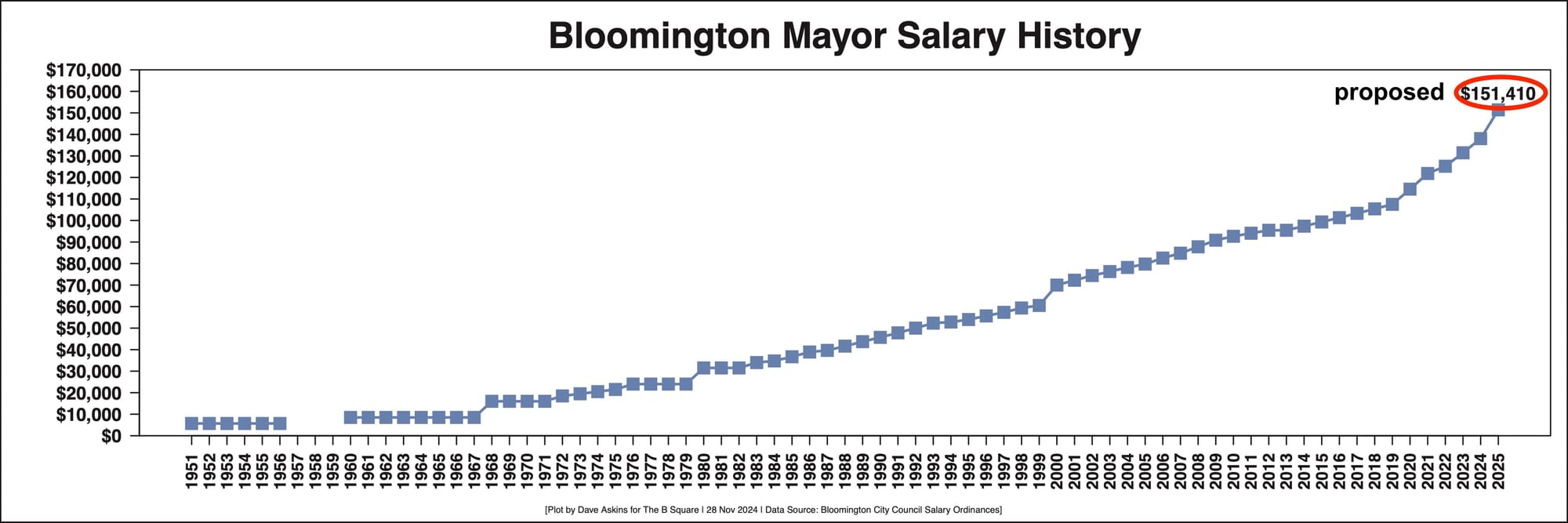 The US Census estimated the 2022 median household income for Bloomington to be $46,543, which is about the amount of compensation that the committee recommended for councilmember.