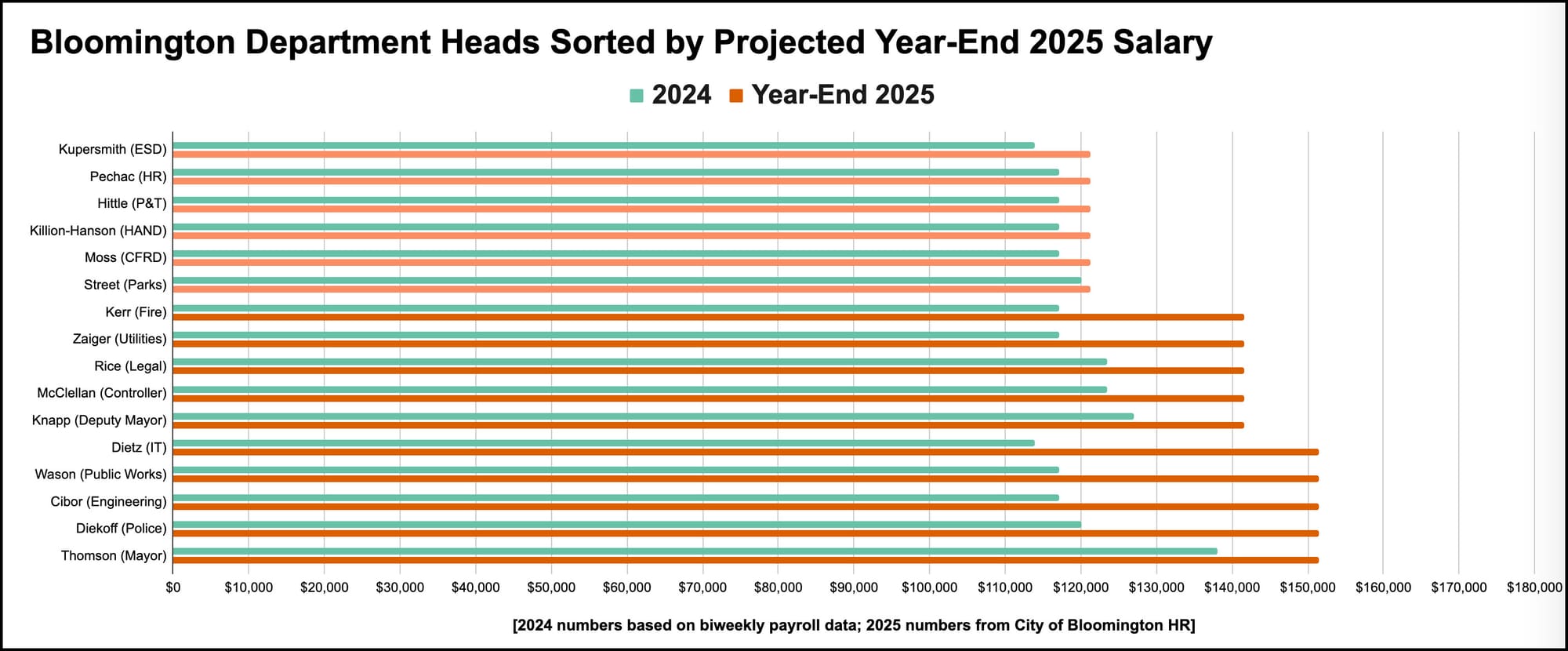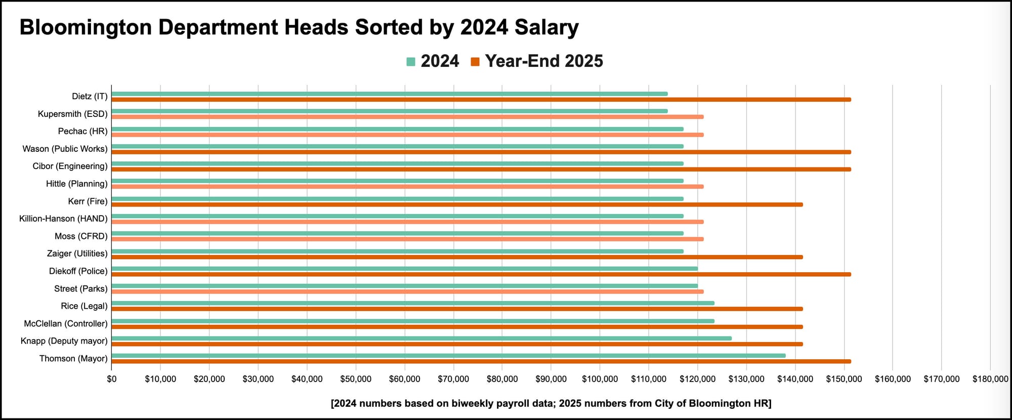 It’s an approach that would pay the mayor less than grade 14 department heads who have five or more years of experience. Those with five or more years of experience in grade 14 jobs include chief of police Mike Diekhoff, head of public works Adam Wason, and IT director Rick Dietz.