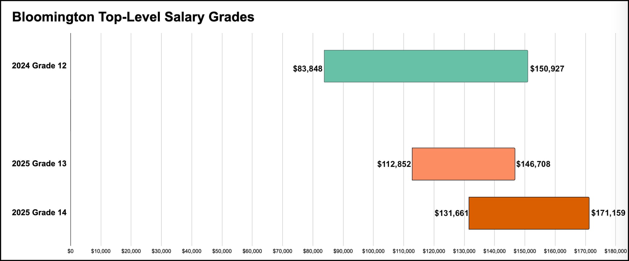 The reference point for the recommended salaries for elected officials is the city’s new 14-point salary grade system. Building on a study done by Crowe LLP, which was commissioned by former mayor John Hamilton, overhauling the city’s compensation system was one of the bigger projects in the first year of Bloomington mayor Kerry Thomson’s term.