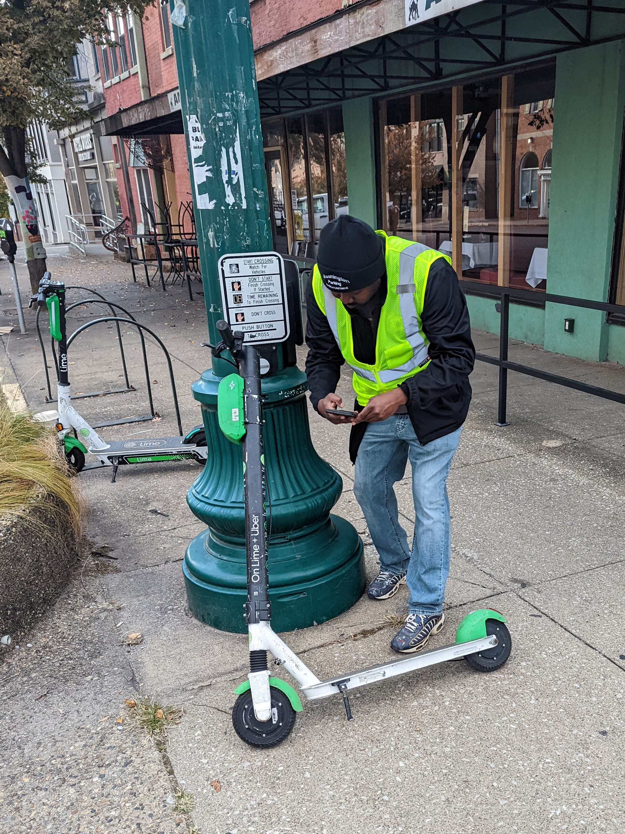 In fall 2022, starting in the first part of October, the city of Bloomington’s public works department hired some part-time temporary workers to monitor scooter parking infractions. They were not tasked with writing tickets—their job was to document the violations and to move the scooters.