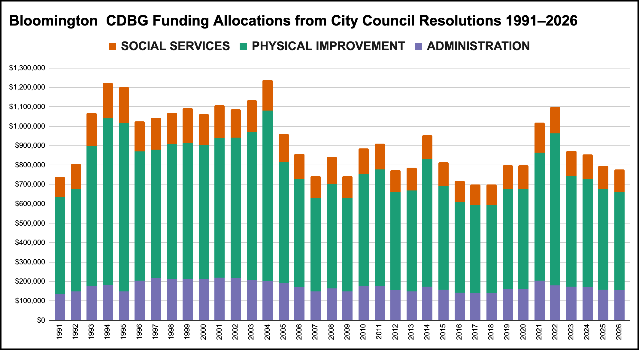 The allocation came in the context of diminishing funding availability in the federal program. From 1991 to 2025 Bloomington’s estimated amount was consistently better than $1 million. After that, it has mostly been under $1 million—the exception was in two post-panemic years of 2021 and 2022. In the four years after that, there’s been a clear downward trend to this year’s amount.